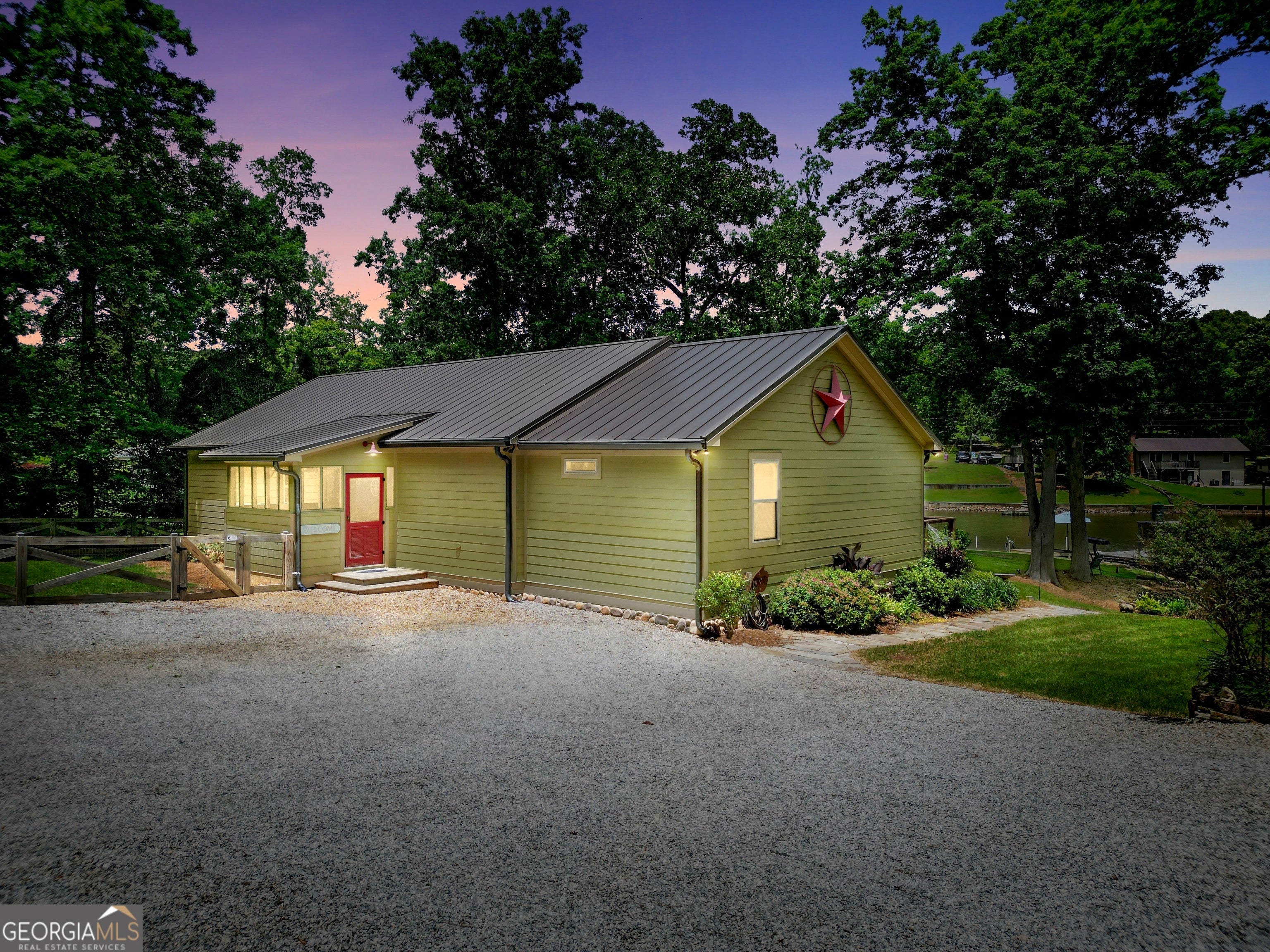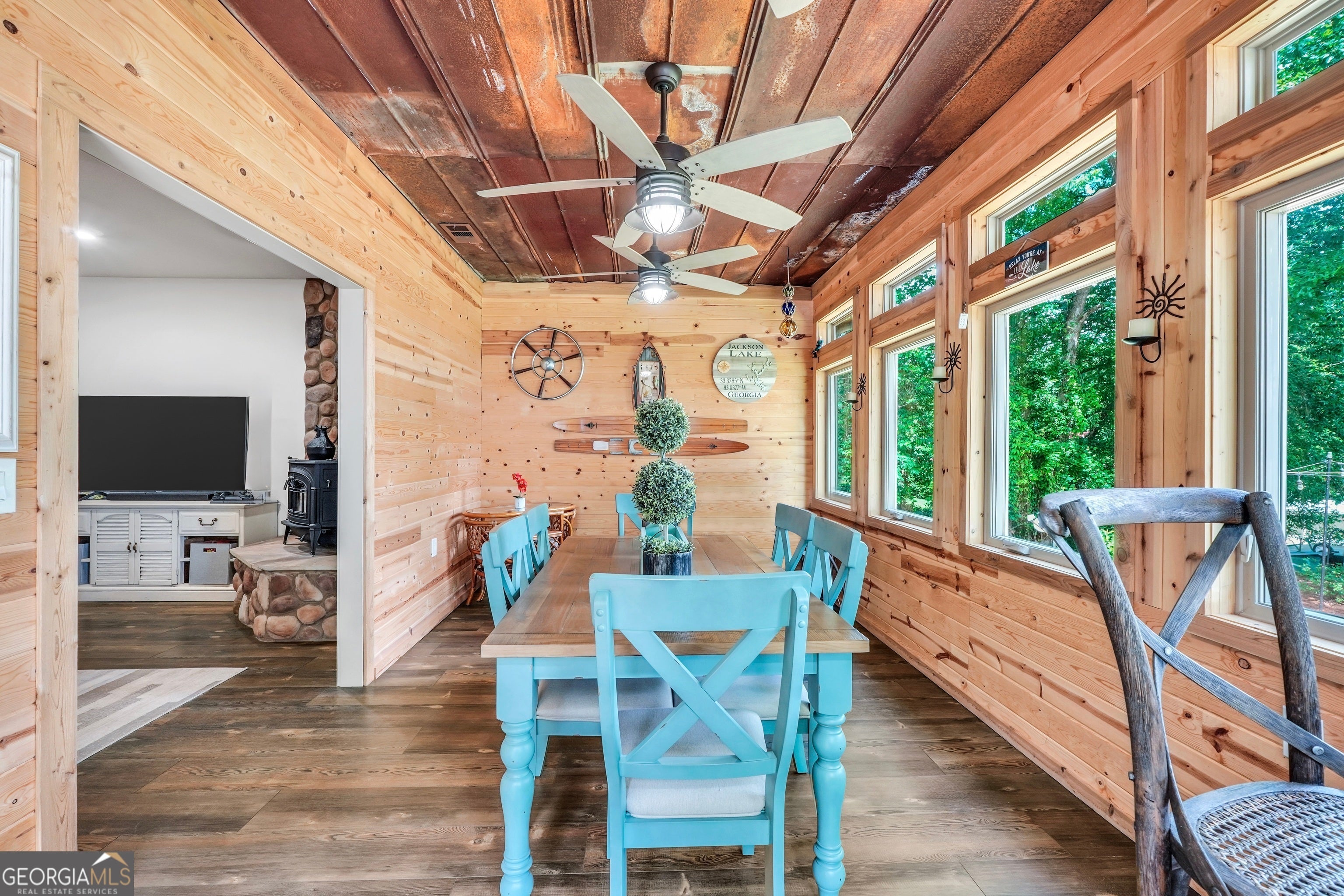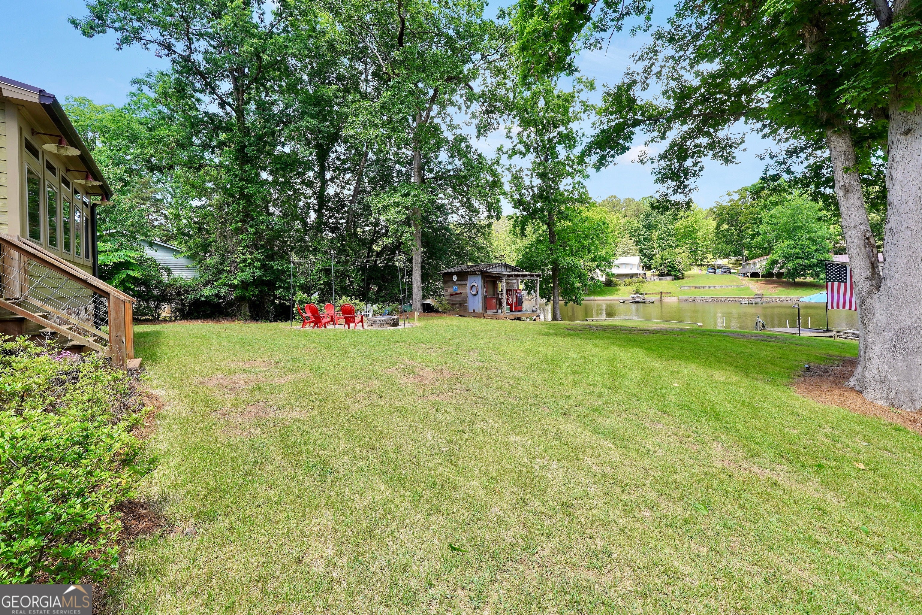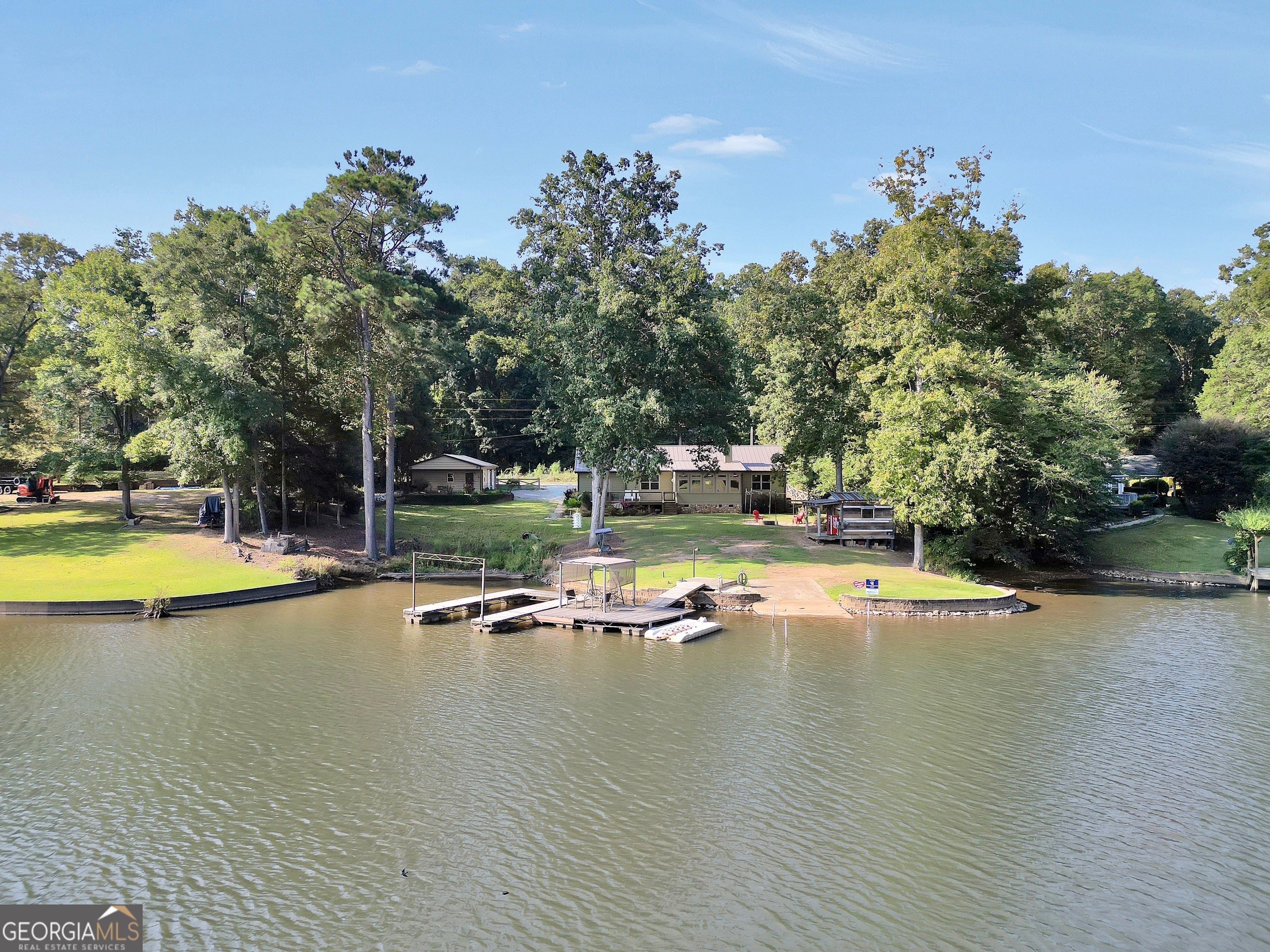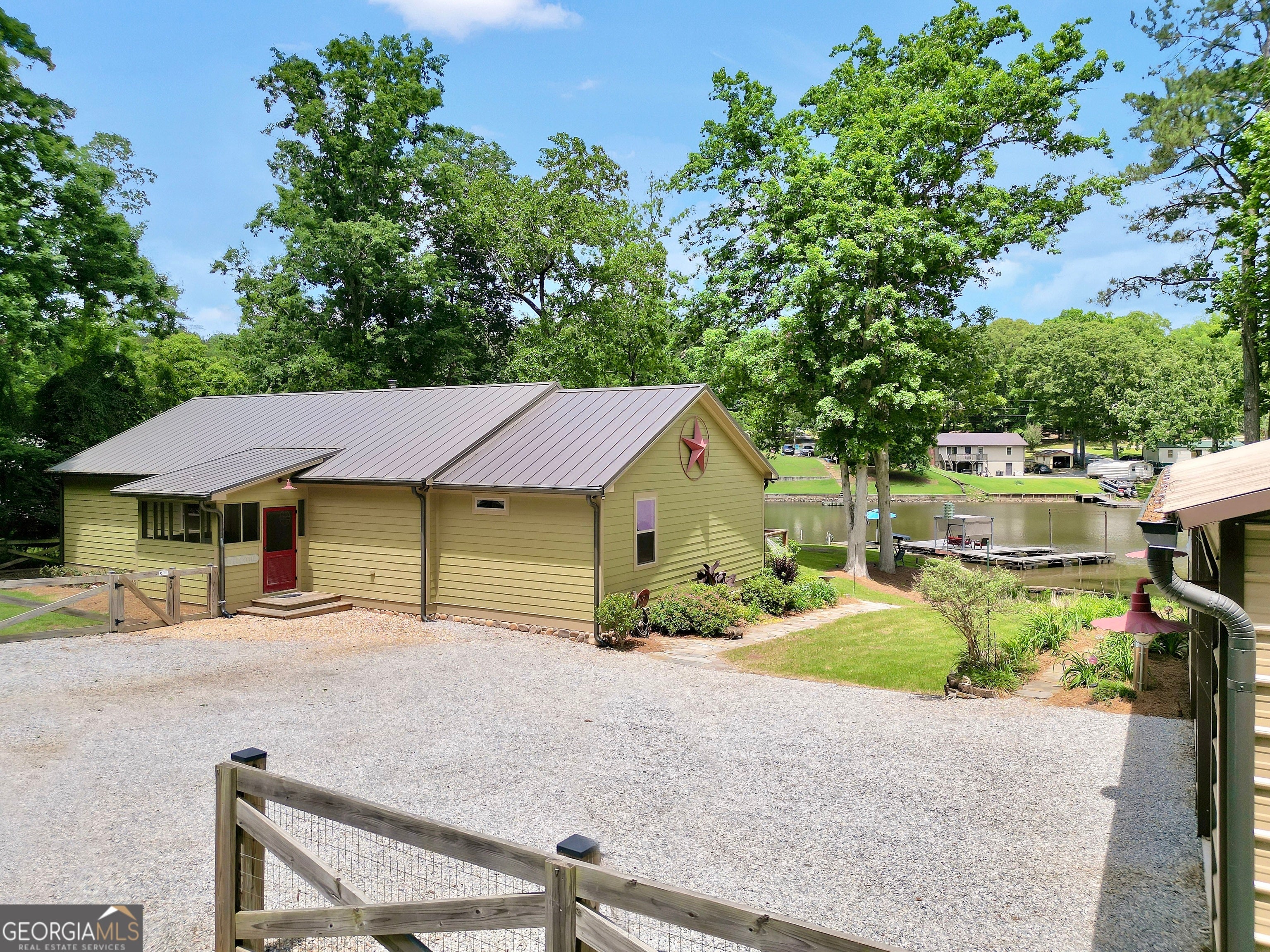 Welcome to this immaculate, custom-built lake home nestled on a DEEDED 0.64-acre lot with everything you need for laid-back, lakeside living. Enjoy your private dock with a single boat slip, a swim dock, a boat ramp, and a recently rebuilt seawall. Everything you need for lakeside fun. Step into lakeside living with this beautiful home that offers the perfect blend of rustic charm, modern comfort, spacious bedrooms with a flexible fourth room that offers plenty of possibilities for guests, hobbies, or a cozy bunk or lounge space. Inside, you're greeted with a warm, lodge-style atmosphere featuring 9' ceilings, reclaimed wood, metal accents, and high-end luxury vinyl plank flooring throughout. The kitchen is a standout with solid Hickory custom cabinetry, rich granite countertops, and Samsung Smart black stainless appliances. Cozy up in the spacious living area beside the Vermont Castings wood-burning stove or take in lake views from the light-filled entertaining room, ideal as a dining area, game room, or second living space overlooking the cove. The oversized primary suite includes a large walk-in closet and a spa-like bath with a roomy tiled shower. A versatile flex room off the main living area provides options for a second bedroom, office, or bonus game room. Bedrooms 3 and 4 are generously sized and share a Jack & Jill style closet. Outside, you'll find a detached 20x40 two-bay garage with power and workshop space, plus a powered fish shack and a Breeo smokeless fire pit. Perfect for evening gatherings. This home also features dual 200-amp panels, two 40-gallon water heaters, and energy-efficient spray foam insulation to keep utility costs low. This one-of-a-kind lake property offers the perfect balance of comfort, style, and location. Located in one of the area's most desirable spots, you'll love the easy access to the water and peacefull surroundings. Move-in ready and waiting for you to enjoy. Don't miss your chance to own a piece of Jackson Lake paradise!