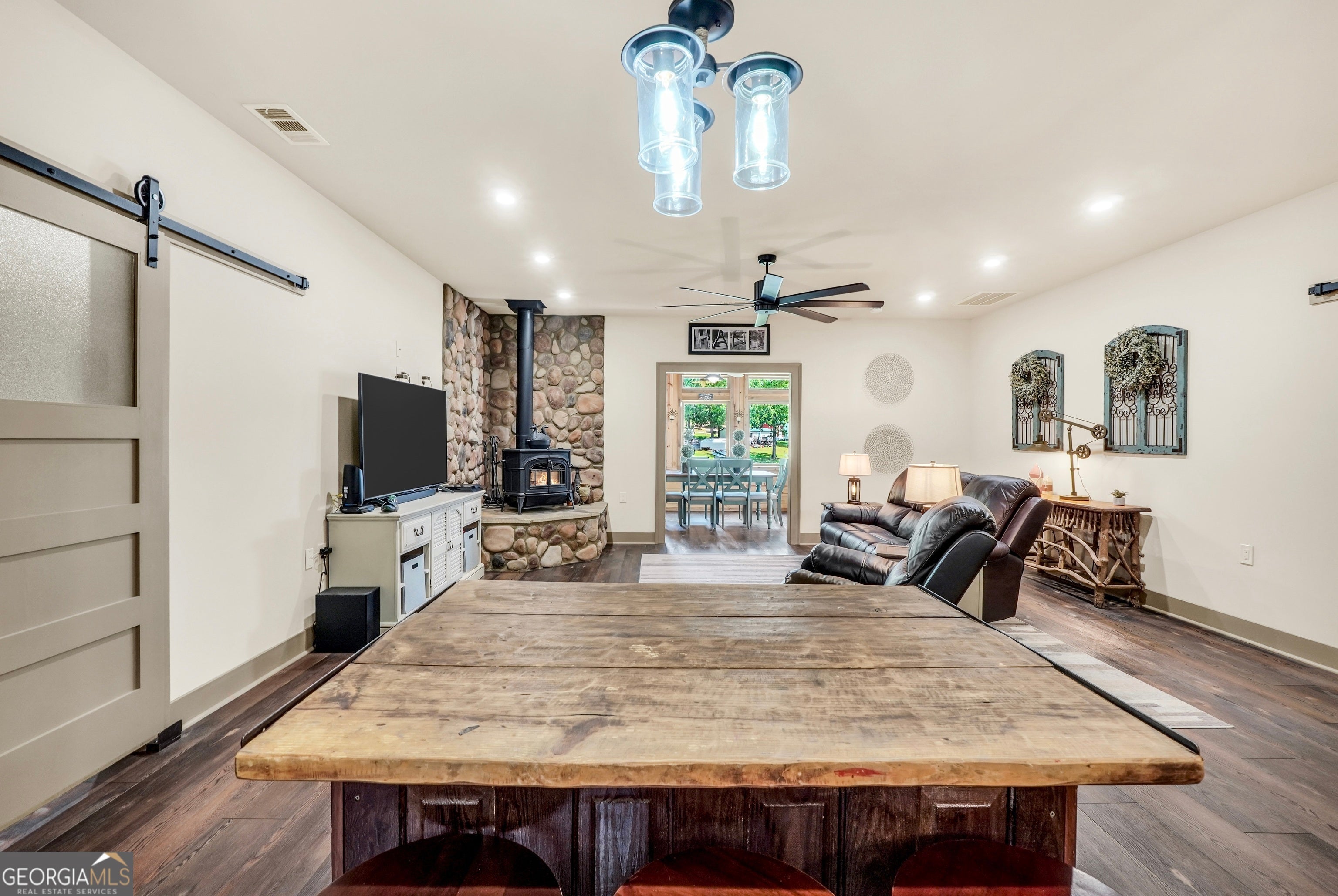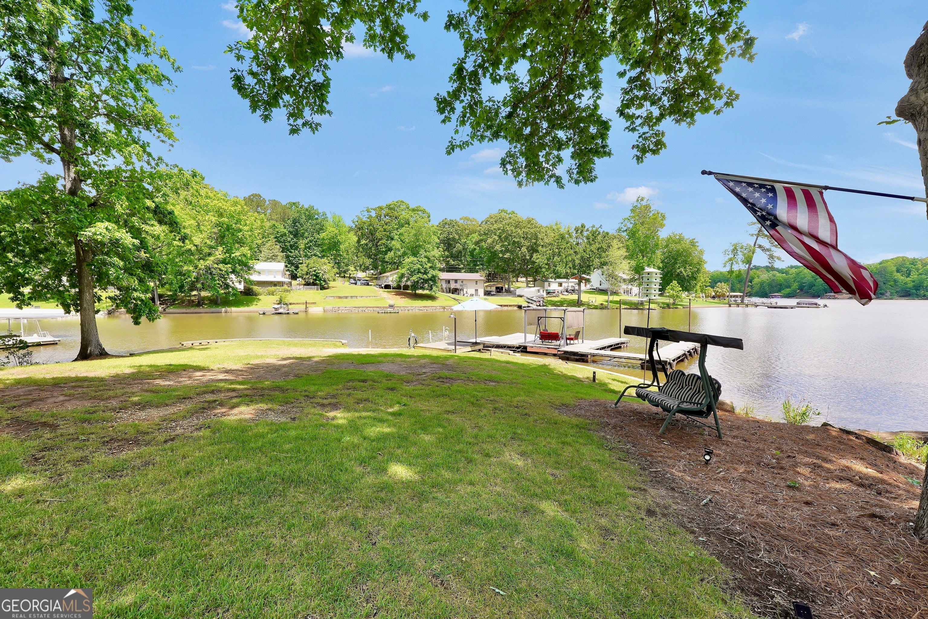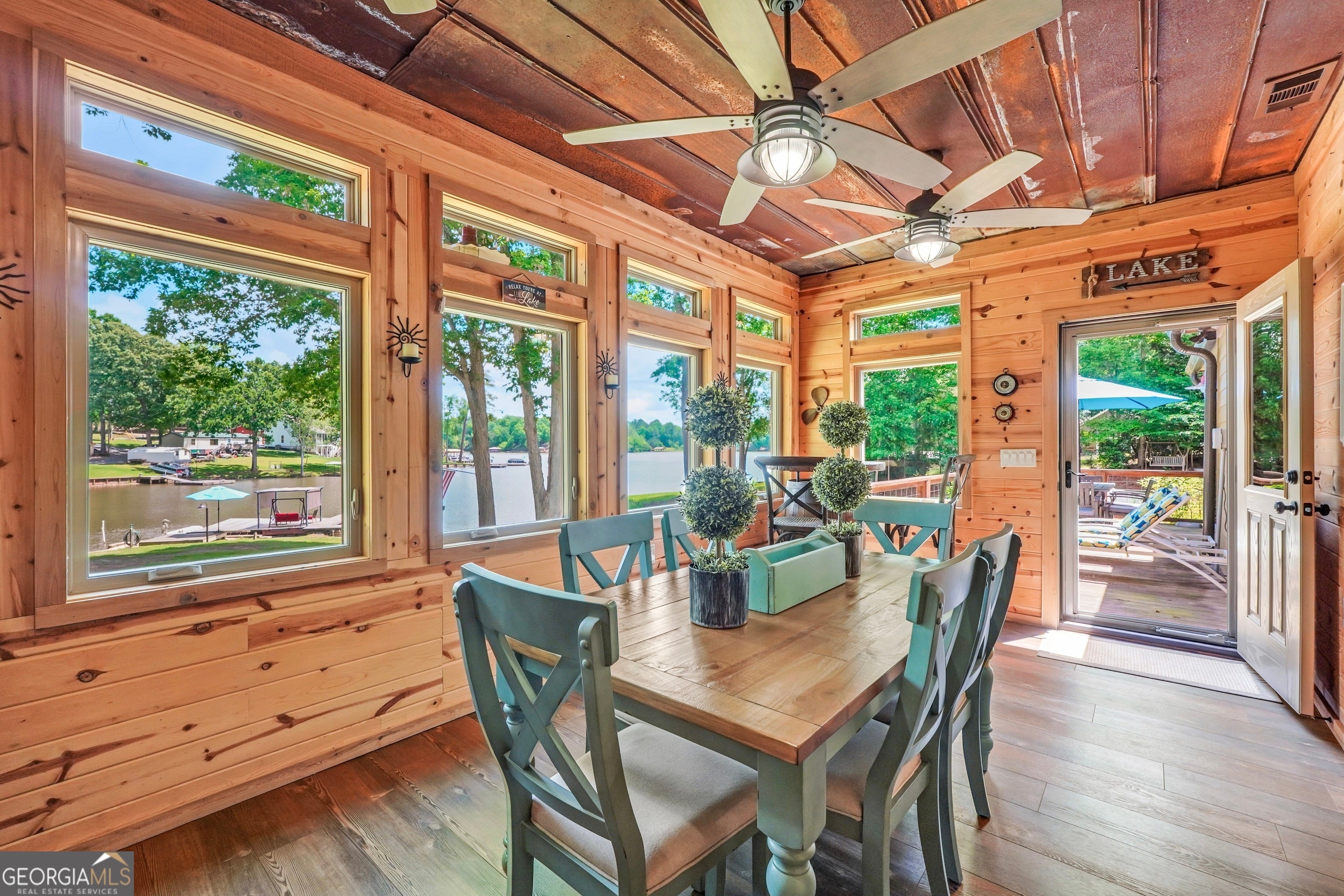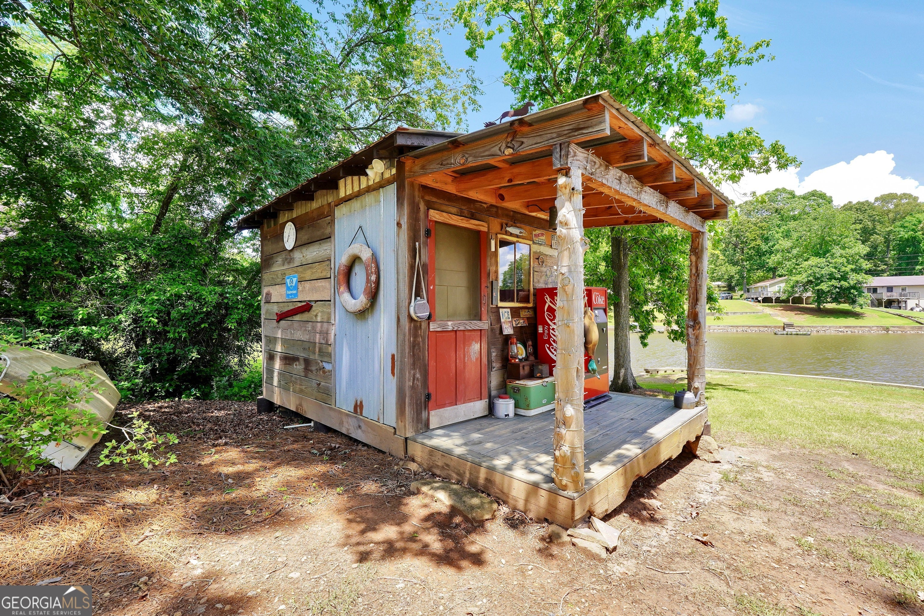 Welcome to this immaculate, custom-built lake home nestled on a DEEDED 0.64-acre lot with everything you need for laid-back, lakeside living. Enjoy your private dock with a single boat slip, a swim dock, a boat ramp, and a recently rebuilt seawall. Everything you need for lakeside fun. Step into lakeside living with this beautiful home that offers the perfect blend of rustic charm, modern comfort, spacious bedrooms with a flexible fourth room that offers plenty of possibilities for guests, hobbies, or a cozy bunk or lounge space. Inside, you're greeted with a warm, lodge-style atmosphere featuring 9' ceilings, reclaimed wood, metal accents, and high-end luxury vinyl plank flooring throughout. The kitchen is a standout with solid Hickory custom cabinetry, rich granite countertops, and Samsung Smart black stainless appliances. Cozy up in the spacious living area beside the Vermont Castings wood-burning stove or take in lake views from the light-filled entertaining room, ideal as a dining area, game room, or second living space overlooking the cove. The oversized primary suite includes a large walk-in closet and a spa-like bath with a roomy tiled shower. A versatile flex room off the main living area provides options for a second bedroom, office, or bonus game room. Bedrooms 3 and 4 are generously sized and share a Jack & Jill style closet. Outside, you'll find a detached 20x40 two-bay garage with power and workshop space, plus a powered fish shack and a Breeo smokeless fire pit. Perfect for evening gatherings. This home also features dual 200-amp panels, two 40-gallon water heaters, and energy-efficient spray foam insulation to keep utility costs low. This one-of-a-kind lake property offers the perfect balance of comfort, style, and location. Located in one of the area's most desirable spots, you'll love the easy access to the water and peacefull surroundings. Move-in ready and waiting for you to enjoy. Don't miss your chance to own a piece of Jackson Lake paradise!