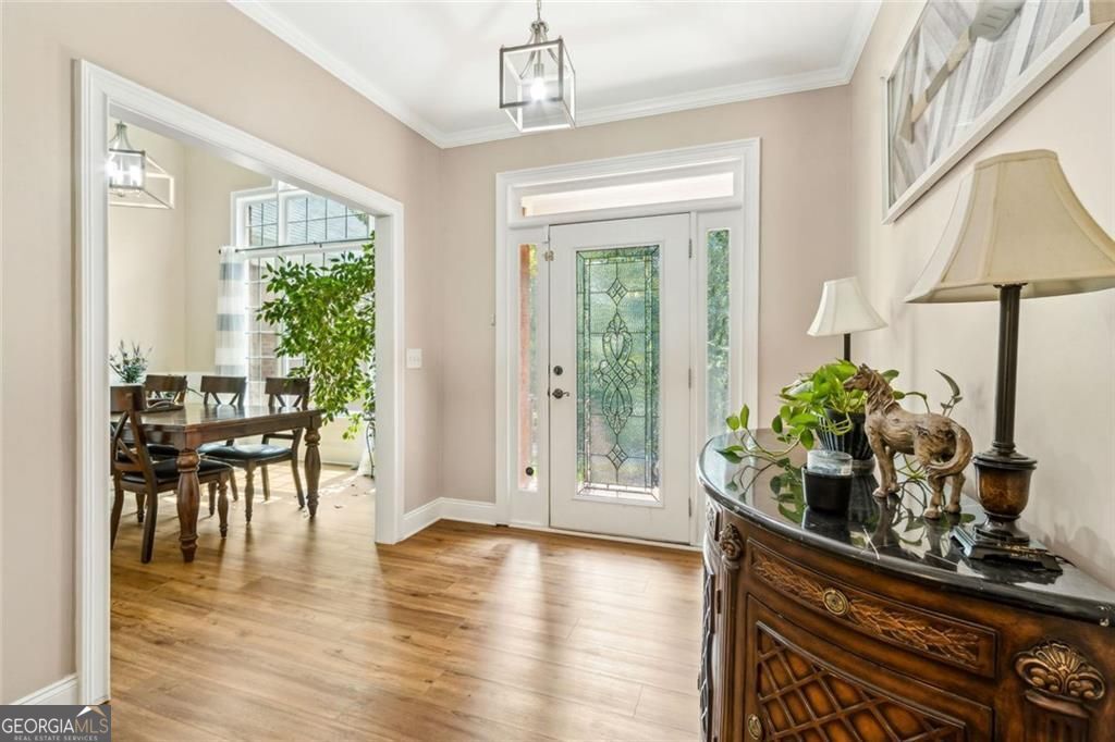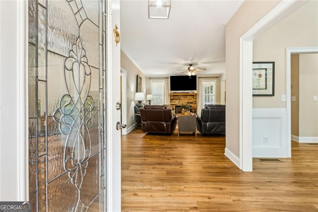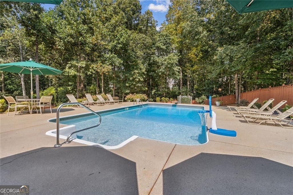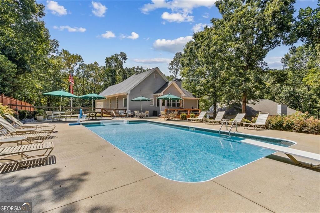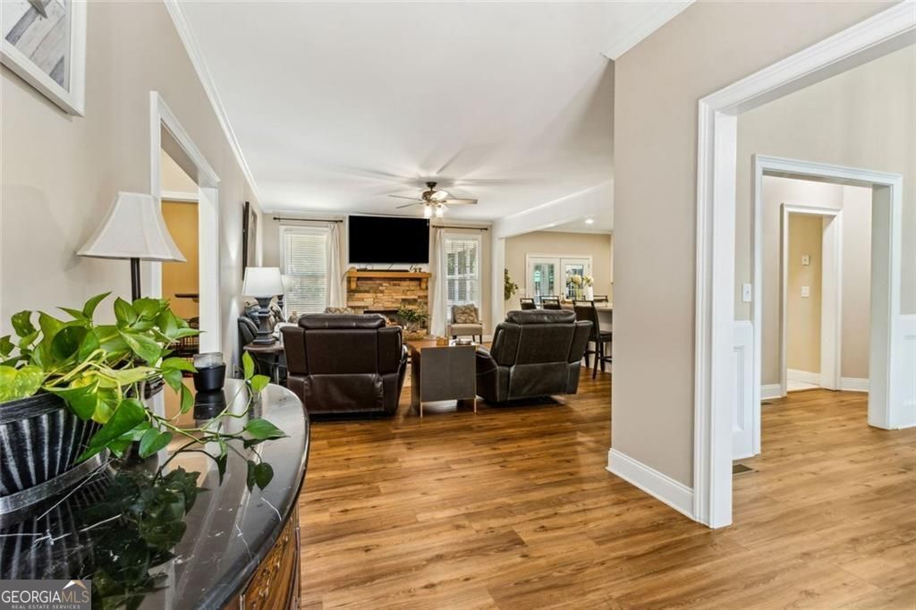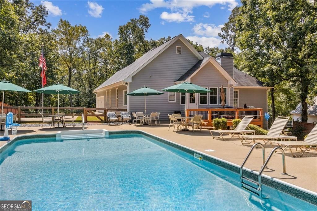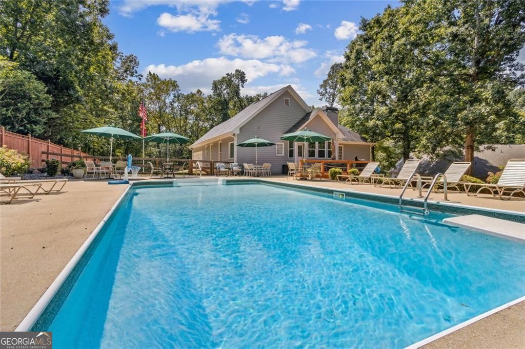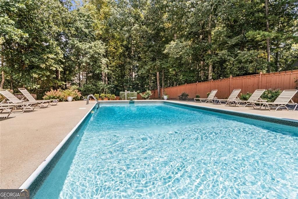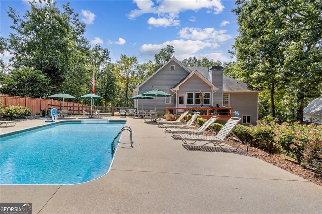 Located at 5985 Wigwam Way in the charming city of Flowery Branch sitting across from Lake Lanier, this residential property offers an inviting prospect in great condition. The heart of this home is undoubtedly its open floor plan, which creates an expansive and welcoming atmosphere. The living room is anchored by a fireplace, providing a focal point for gatherings and quiet evenings alike, further enhanced by the sophisticated touch of crown molding. Imagine the ambiance created by a crackling fire, casting a warm glow throughout the space. The kitchen serves as a culinary hub, boasting a backsplash, and a kitchen bar, providing ample space for meal preparation and casual dining. Stone countertops add a touch of luxury and durability, while the crown molding echoes the refined details found throughout the home. Step outside the sunroom to a beautiful fenced in backyard with an inground pool. This attractive property, featuring 3 bedrooms and 2.5 bathrooms offers a unique opportunity to embrace a comfortable and stylish lifestyle.