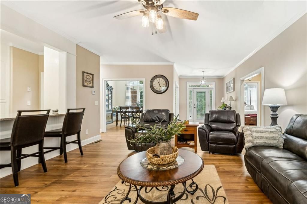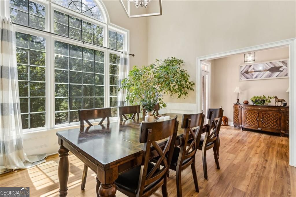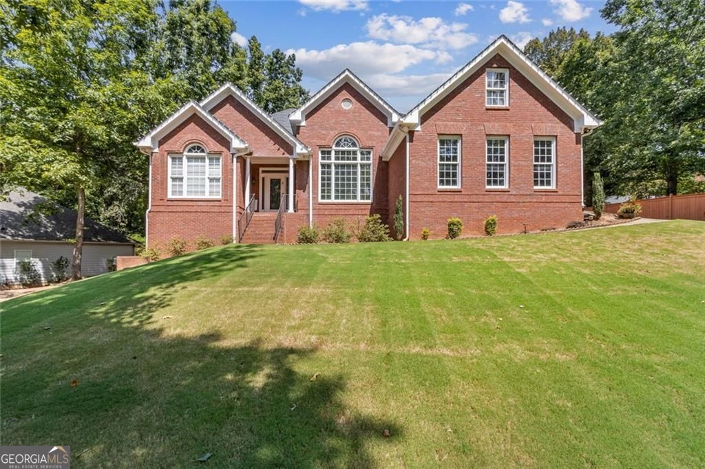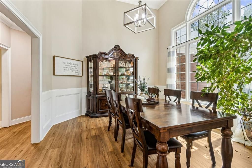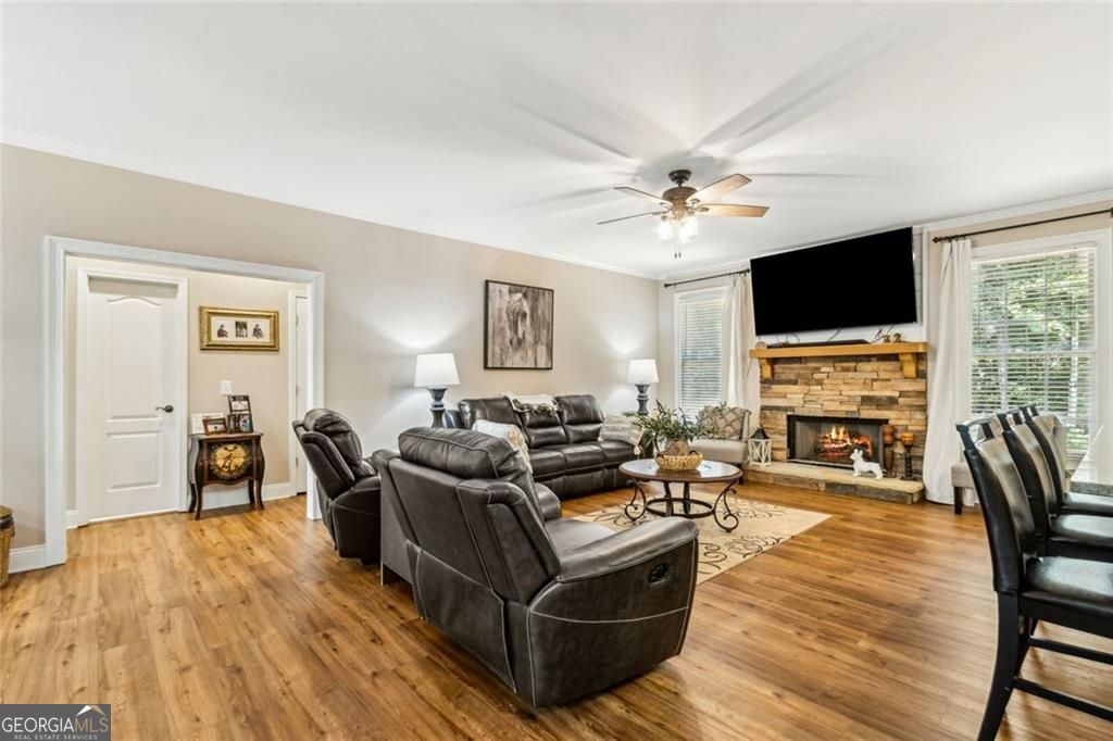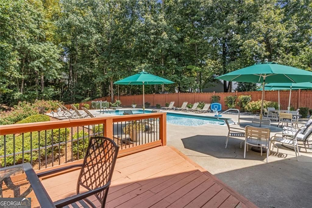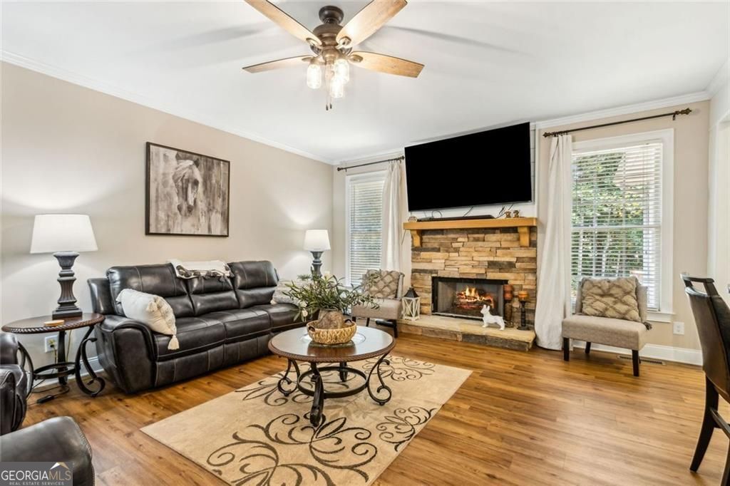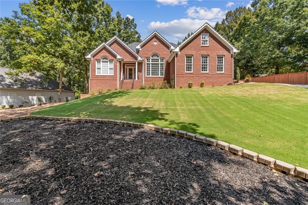 Located at 5985 Wigwam Way in the charming city of Flowery Branch sitting across from Lake Lanier, this residential property offers an inviting prospect in great condition. The heart of this home is undoubtedly its open floor plan, which creates an expansive and welcoming atmosphere. The living room is anchored by a fireplace, providing a focal point for gatherings and quiet evenings alike, further enhanced by the sophisticated touch of crown molding. Imagine the ambiance created by a crackling fire, casting a warm glow throughout the space. The kitchen serves as a culinary hub, boasting a backsplash, and a kitchen bar, providing ample space for meal preparation and casual dining. Stone countertops add a touch of luxury and durability, while the crown molding echoes the refined details found throughout the home. Step outside the sunroom to a beautiful fenced in backyard with an inground pool. This attractive property, featuring 3 bedrooms and 2.5 bathrooms offers a unique opportunity to embrace a comfortable and stylish lifestyle.