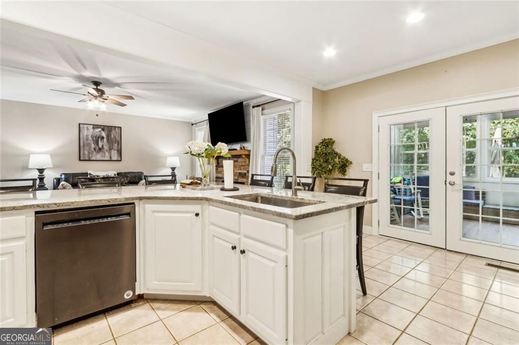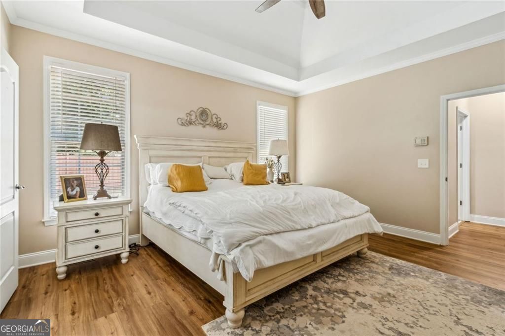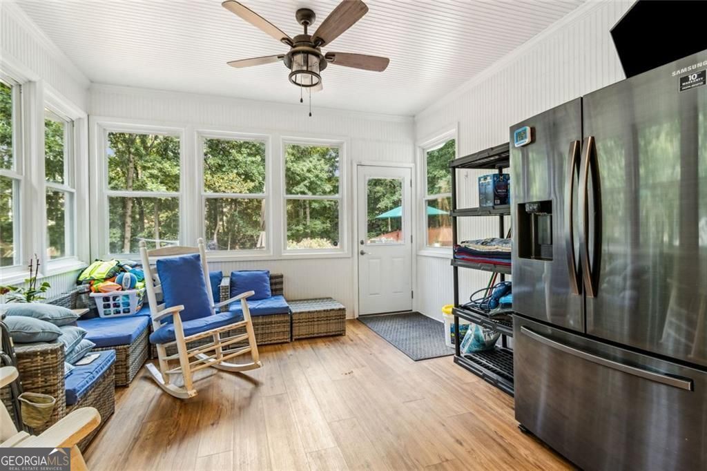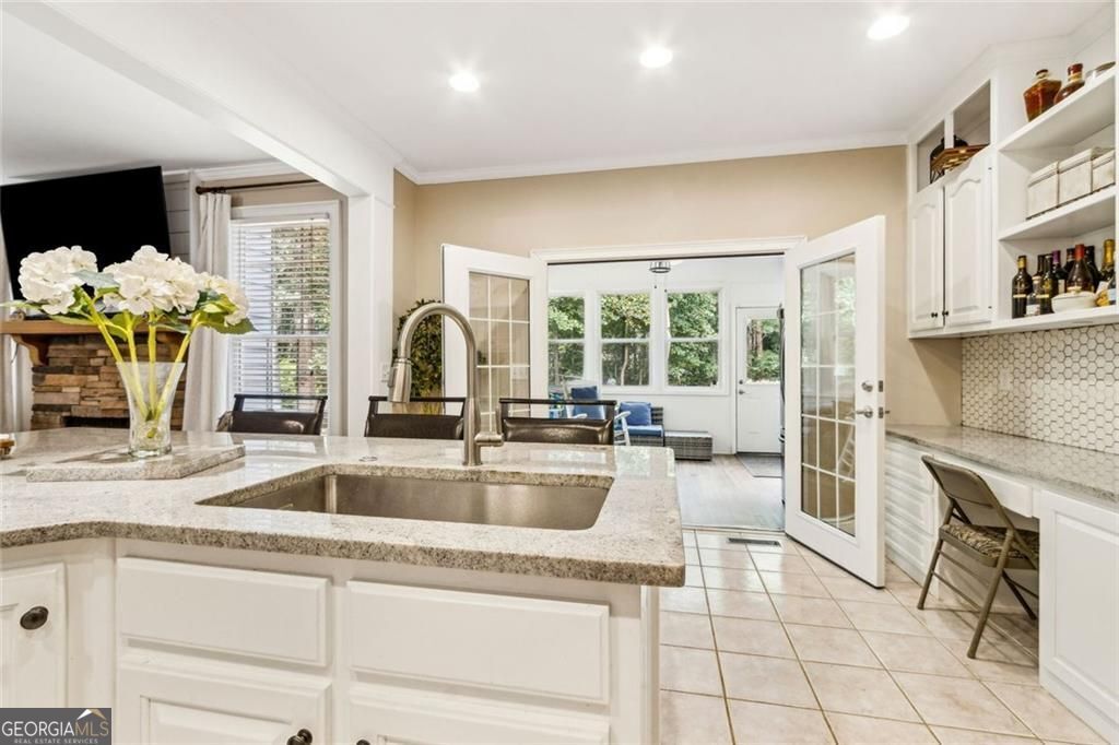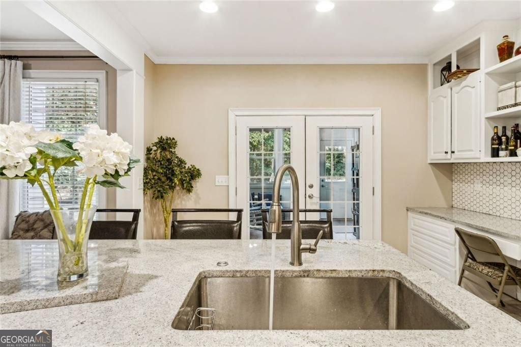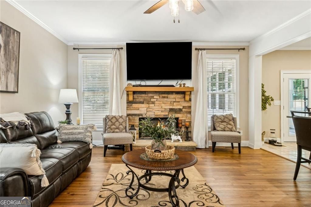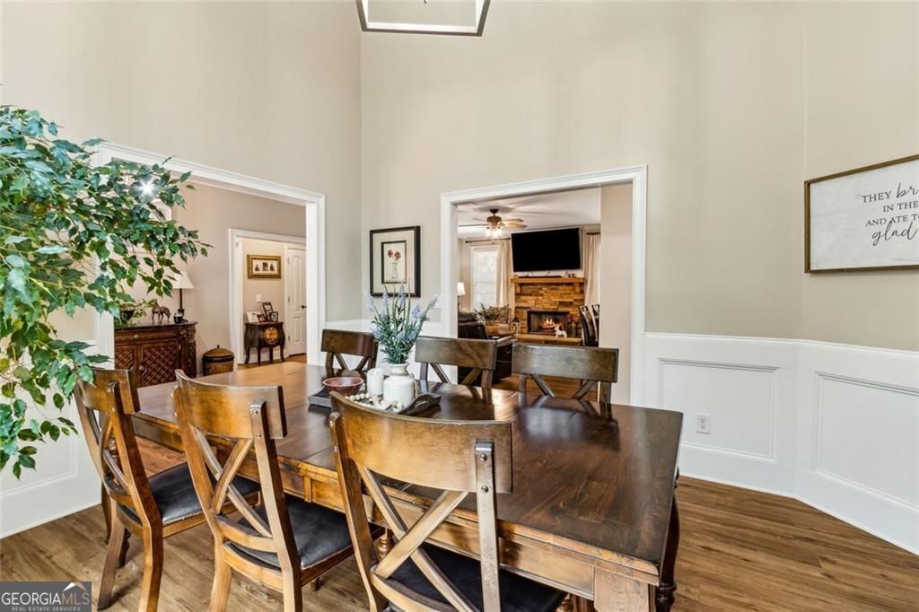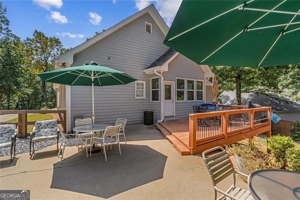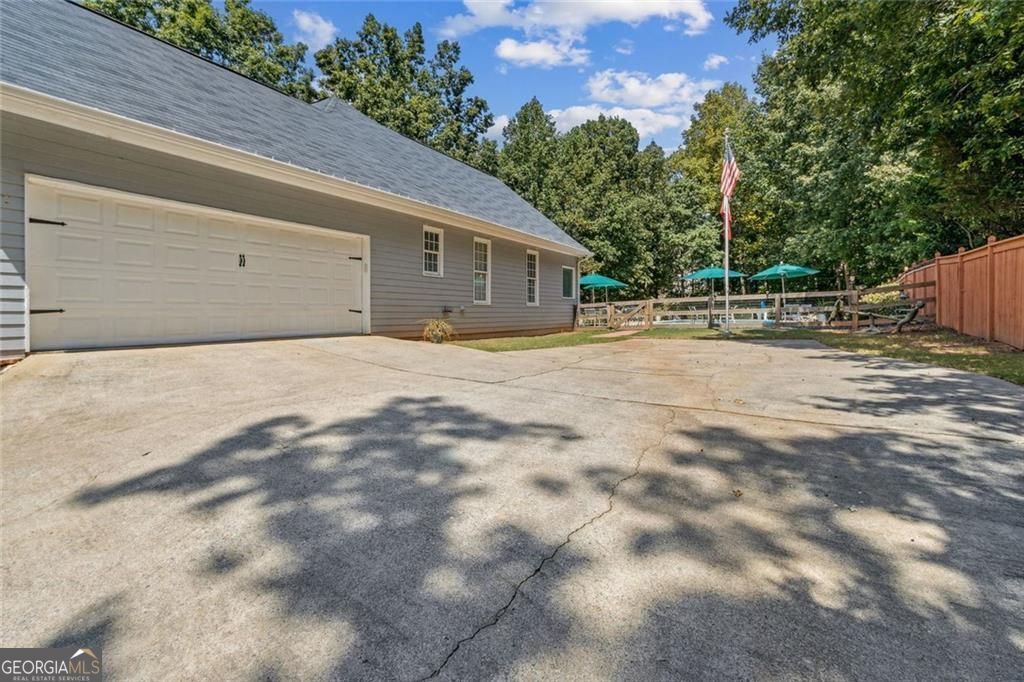 Located at 5985 Wigwam Way in the charming city of Flowery Branch sitting across from Lake Lanier, this residential property offers an inviting prospect in great condition. The heart of this home is undoubtedly its open floor plan, which creates an expansive and welcoming atmosphere. The living room is anchored by a fireplace, providing a focal point for gatherings and quiet evenings alike, further enhanced by the sophisticated touch of crown molding. Imagine the ambiance created by a crackling fire, casting a warm glow throughout the space. The kitchen serves as a culinary hub, boasting a backsplash, and a kitchen bar, providing ample space for meal preparation and casual dining. Stone countertops add a touch of luxury and durability, while the crown molding echoes the refined details found throughout the home. Step outside the sunroom to a beautiful fenced in backyard with an inground pool. This attractive property, featuring 3 bedrooms and 2.5 bathrooms offers a unique opportunity to embrace a comfortable and stylish lifestyle.