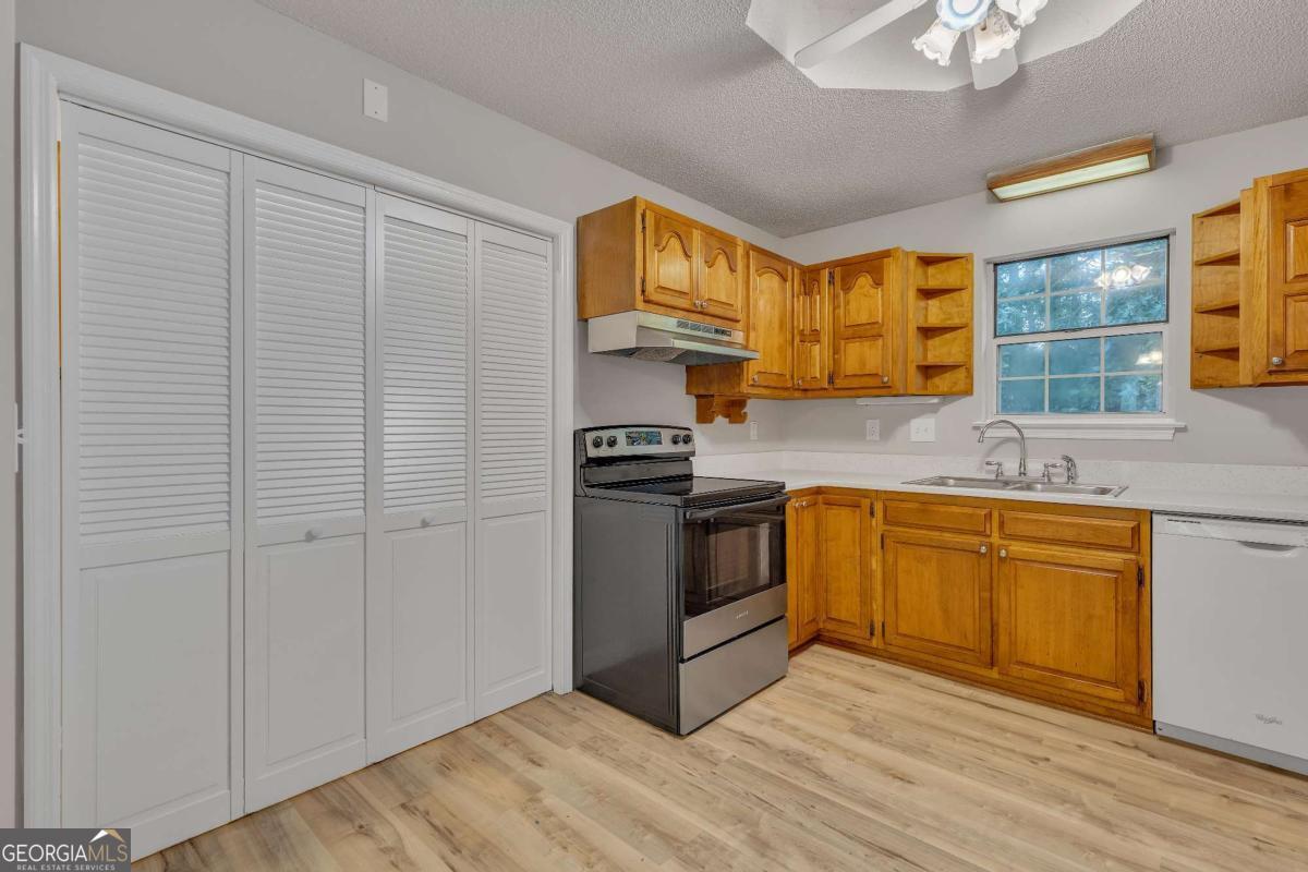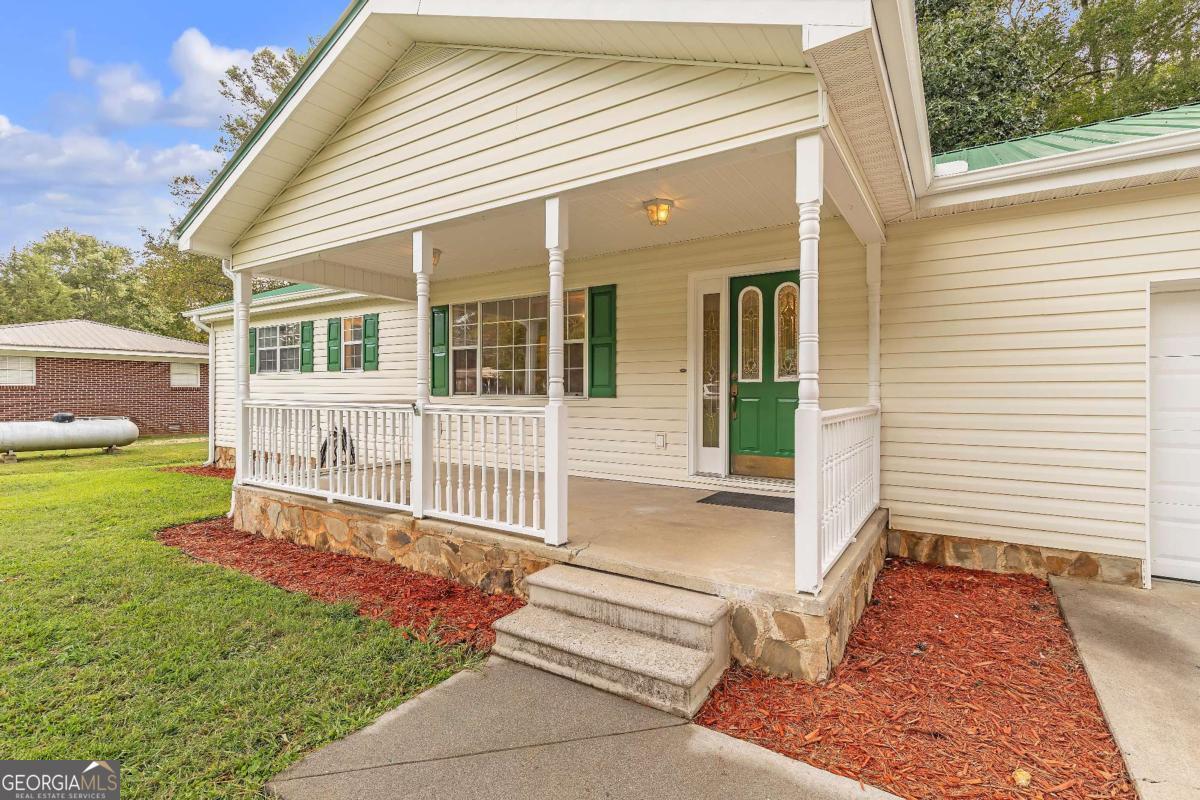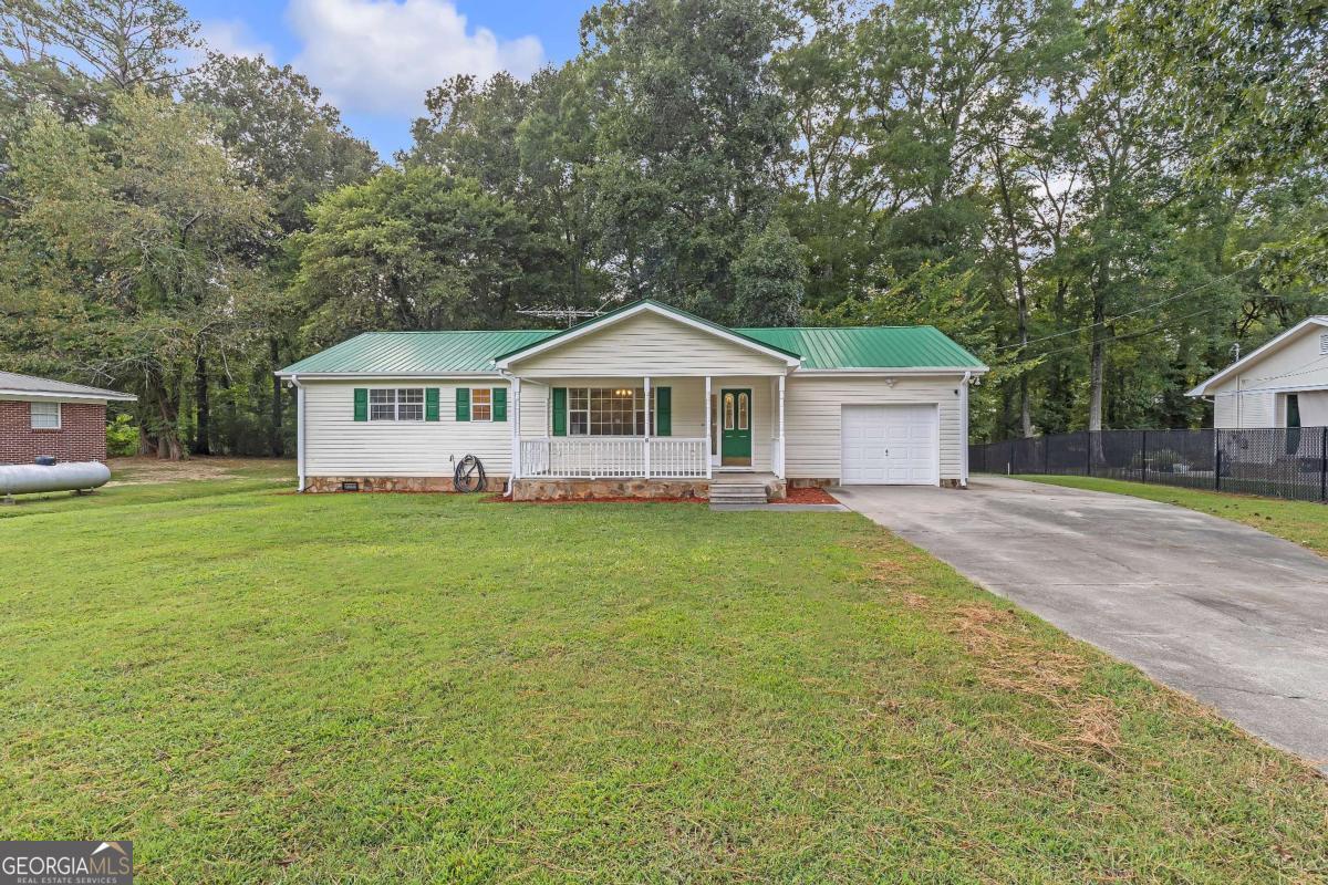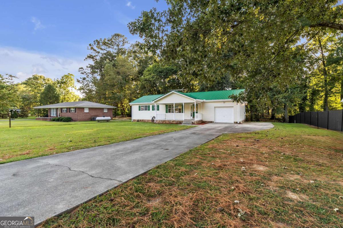 This beautifully updated 3-bedroom, 1.5-bath ranch combines modern updates with timeless charm. Freshly painted inside and out, the home features all new LVP flooring throughout and a bright, open living area, accented by a stylish chair rail detail and filled with natural light. The kitchen offers abundant cabinet space, sleek quartz countertops, and appliances, while the dining area flows seamlessly for everyday living and entertaining. The primary suite and secondary bedrooms provide comfort with fresh finishes, and both bathrooms have been updated with modern fixtures, including a tub-shower combo and refreshed vanities. A new water heater adds peace of mind. Outside, enjoy a large level lot with mature trees, a scenic wet weather creek/ditch at the back of the property, and plenty of room for outdoor activities. The inviting covered front porch, durable and freshly painted metal roof, single-car garage with a separate storage room and extended driveway add to the appeal of this move-in ready home.
