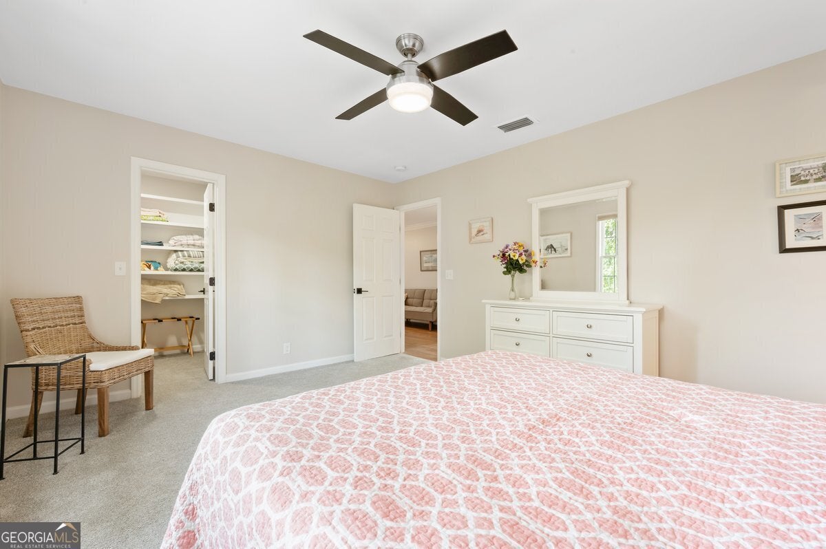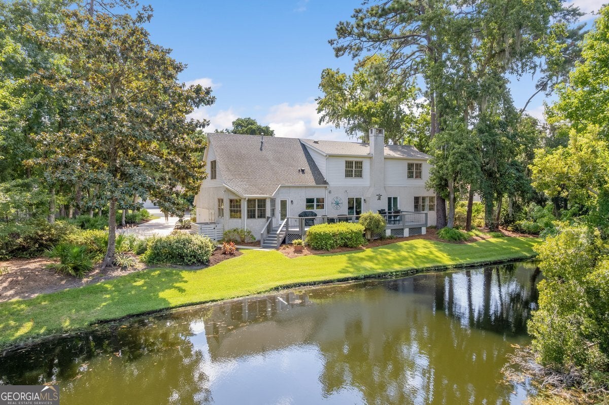 This stunning Saint Simons Island retreat is a true NATURE LOVER'S PARDISE offering breathtaking views of the fourth green and serene lagoon. Set in a private cul-de-sac with just five homes, it's surrounded by lush landscaping and a privacy buffer for tranquility. Featuring 4 spacious bedrooms and 4.5 baths, the home is ideal for both relaxation and entertaining. The first-level master suite is a sanctuary with a custom 8' x 4' shower. The open-concept layout flows seamlessly from a formal dining room to the great room and gourmet kitchen with an island, butler's pantry, and professional 6-burner range. Natural light floods the home through wall-to-wall windows, highlighting exceptional views. Renovations include upgrades to the roof, HVAC, flooring, and kitchen. For outdoor entertaining , enjoy a 44' x 8' veranda and easy access to the back deck. Additional features: whole-house water filtration, EV charger, and abundant storage. A perfect blend of luxury, comfort, and privacy on Saint Simons Island.
