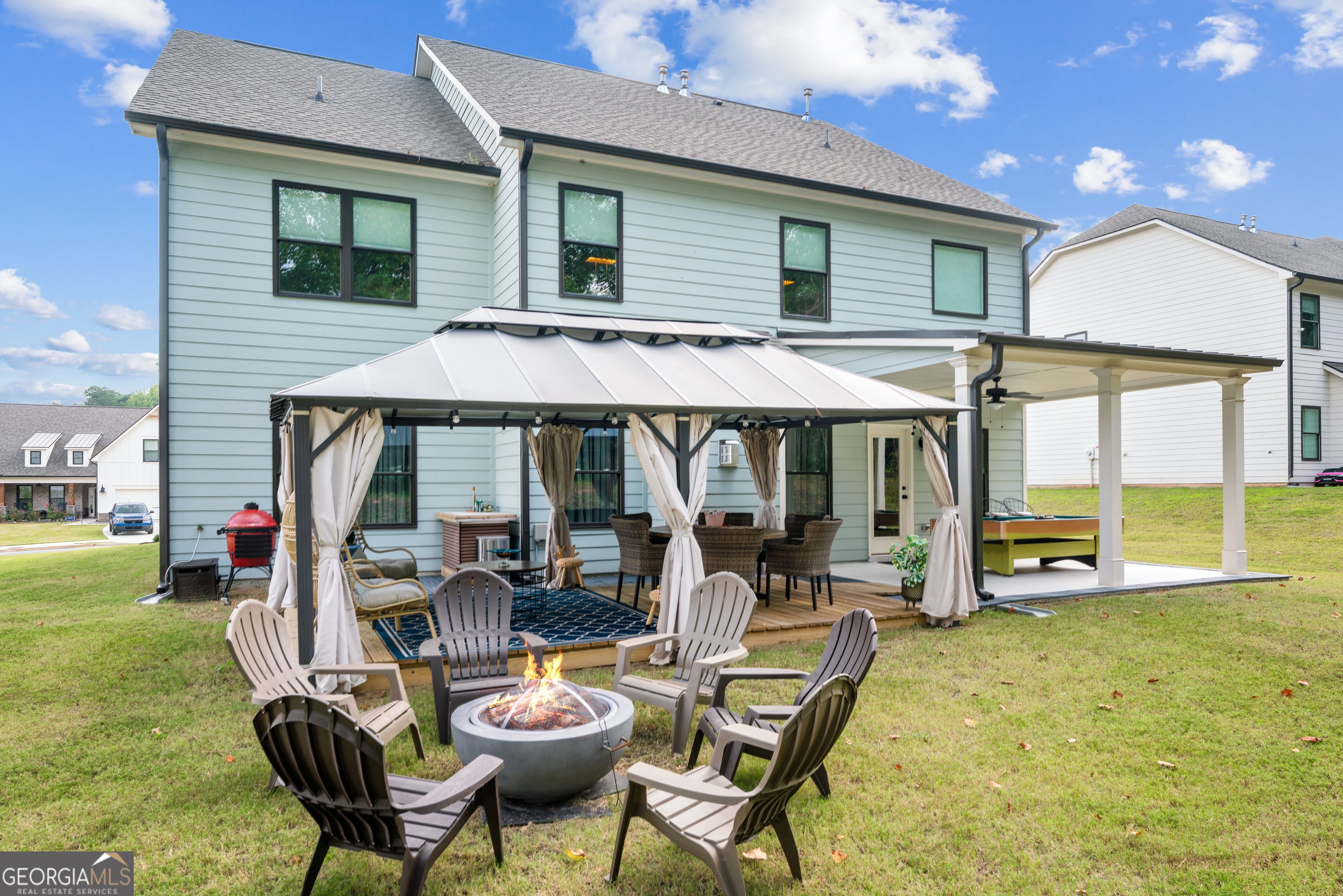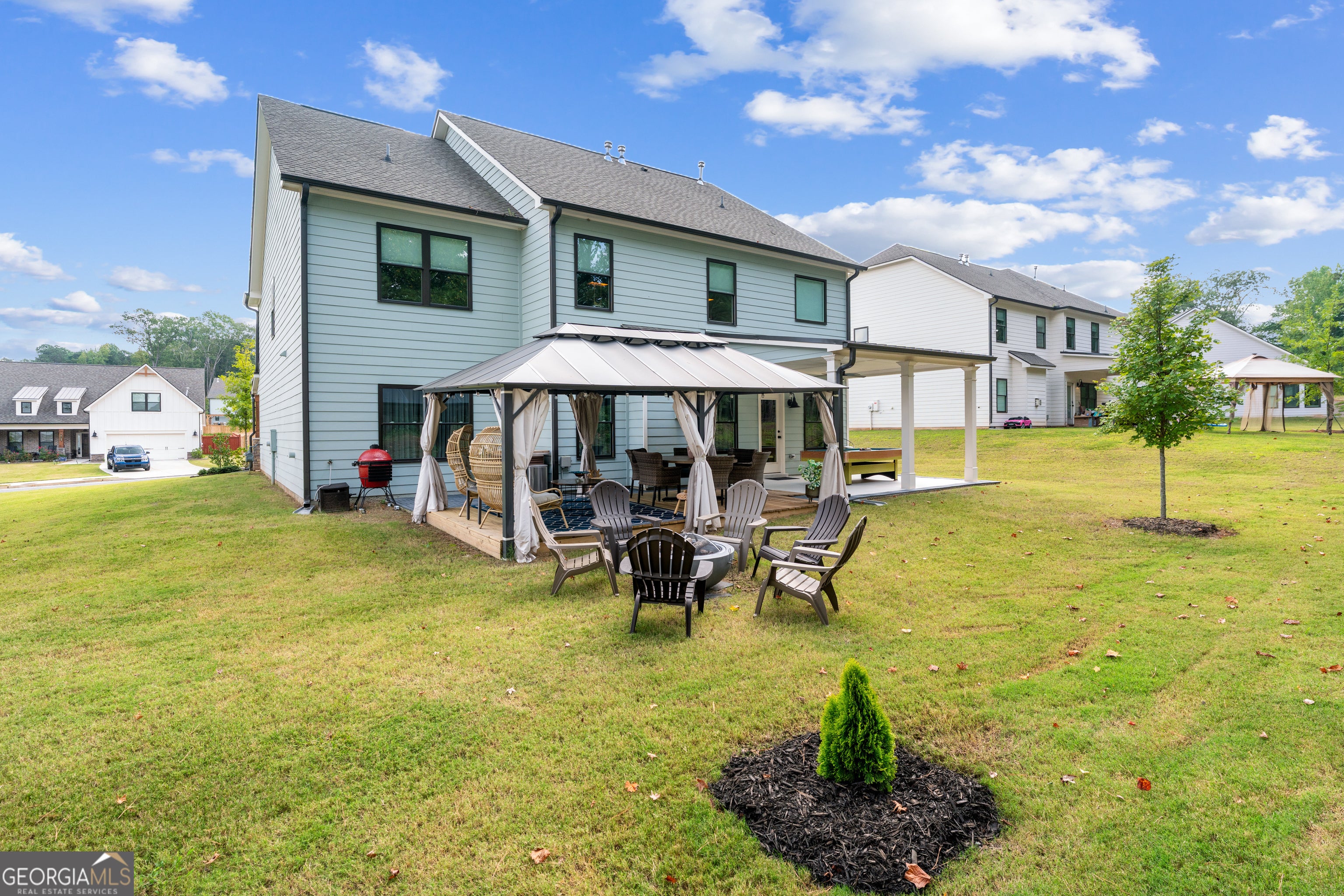 ABSOLUTELY STUNNING AND BETTER THAN NEW!!! Built in 2023 and recently upgraded with thoughtful finishes, this 4-bedroom, 3.5-bathroom home offers 3,226 square feet of modern living. The owner has added tasteful updates throughout, creating a home that feels fresh, inviting, and move-in ready. Step inside to find brand new flooring, fully remodeled bathrooms, and updated details throughout the interior. The spacious living room is anchored by a fireplace, and the open flow makes the home ideal for both gatherings and everyday life. The master suite is a true retreat, offering a spacious bedroom and a luxurious en-suite bathroom with a double vanity. Another upstairs bedroom also includes a double vanity, making it perfect for guests or family. Every bathroom in the home is brand new, showcasing elegant design and quality workmanship. This home will be sold fully furnished, making your move simple and seamless. The remodels were completed with great attention to detail, ensuring both style and durability. The level backyard includes a covered patio, a custom gazebo, and a built-in fire pit-perfect for entertaining or relaxing outdoors. A two-car garage and leveled driveway add convenience and plenty of parking. Located in a quiet subdivision and served by great Cobb County Schools, this home offers the perfect balance of comfort, style, and convenience. With its combination of new construction, tasteful upgrades, and fully furnished interiors, this home combines modern upgrades with move-in-ready ease.