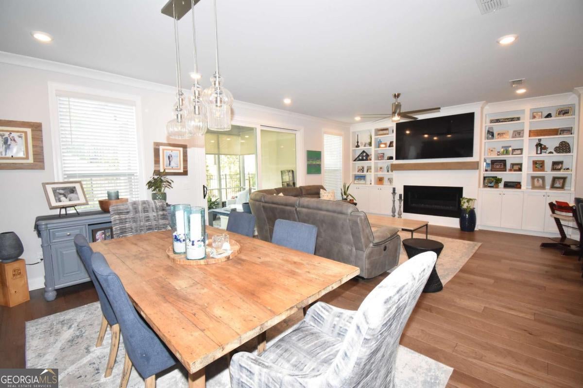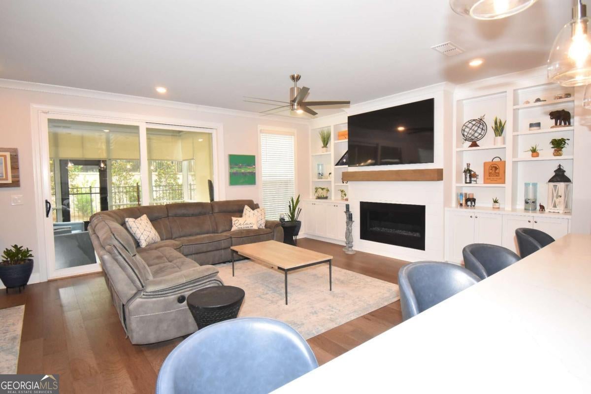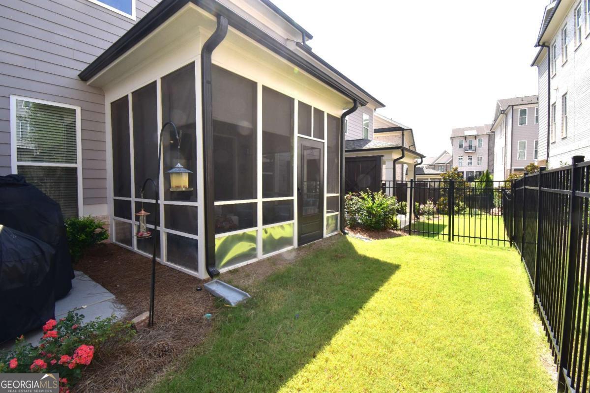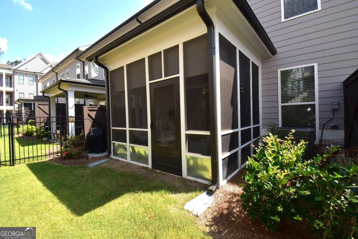This beautiful townhome features the Ellington plan, boasting a main level entry and a driveway. Key features of this property include: a 2-car garage with additional parking in the driveway, linear fireplace, built-in wine fridge with a 155-bottle capacity, custom pantry, two custom closets, screened-in porch with sliders, shiplap entry foyer, window screens, epoxy garage floor, kitchen cabinet pullouts, built-in family room cabinets and shelving, separate tub and shower with bench in the primary suite, hardwood floors throughout, fenced-in yard, and preparation for a future elevator. The amenities package in the neighborhood is the best Peachtree Corners has to offer with 4 large green spaces, pool that backs to the river walk, pavilion that overlooks the river walk, pickleball courts, clubhouse and much more!! Walk along the river walk to the Chattahoochee! Gated community!! Here today and gone tomorrow, don't miss it!!