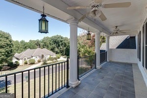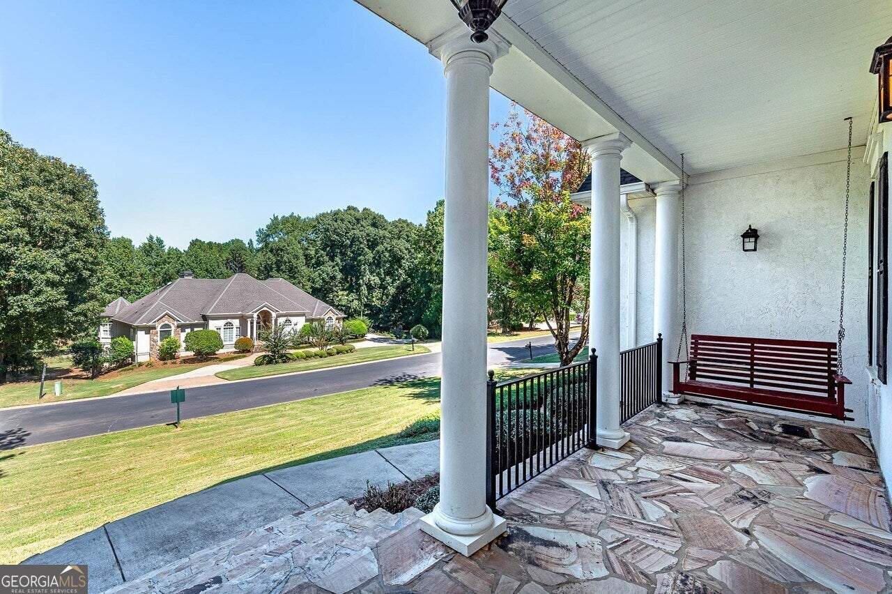 Welcome to 166 Glen Eagle Way, an exquisite estate located in the prestigious gated community of Eagles Landing Country Club. Nestled on a sprawling corner lot with lush new sod, this stately residence offers over 6,600 square feet of refined living space, thoughtfully designed for both grand entertaining and everyday comfort. The elegant main level is anchored by rich mahogany hardwood floors, soaring ceilings, and natural light that floods the formal living and dining rooms. A luxurious owner's suite on the main level provides a private retreat, complete with a spa-inspired bath featuring a jacuzzi tub, separate shower, and a custom-built walk-in closet. The chef's kitchen shines with stainless steel appliances and connects seamlessly to the expansive deck, where serene golf course views create the perfect backdrop for outdoor gatherings. Upstairs, a unique loft-style library and office space provides flexibility for work or leisure, while a Juliet balcony overlooks the manicured greens of the golf course. The home's five spacious bedrooms and five-and-a-half bathrooms are designed with comfort and privacy in mind. The fully finished terrace level is an entertainer's dream, offering a full bar, multiple lounge and recreation areas, and pre-wired home theater zones, ideal for game nights, movie screenings, or creating the ultimate man cave. The oversized laundry and mudroom, expansive three-car garage, and charming front porch with swing add both practicality and Southern charm. Recent updates include fresh paint, new carpet, two newer HVAC systems, and a roof just 6-7 years young, ensuring peace of mind for years to come. With ample space to fence in the backyard and even install a private pool, this estate offers unmatched potential in one of Henry County's most sought-after communities. Experience the lifestyle you've always dreamed of... golf, dining, and resort-style amenities right outside your door, with the privacy and elegance of a true country club estate.