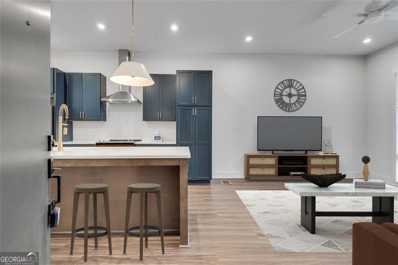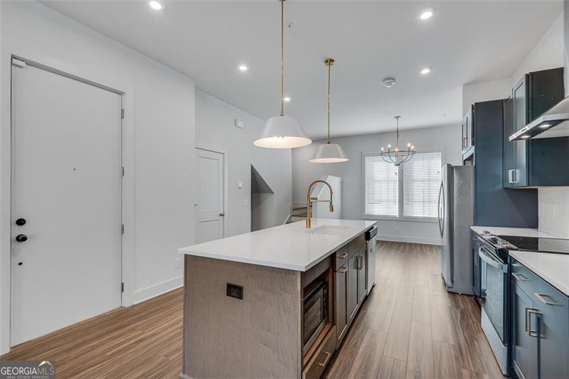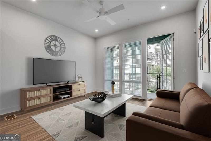 Welcome home! This open-concept design highlights a gourmet kitchen with quartz countertops and stainless steel appliances. The living room flows to a covered terrace, perfect for entertaining or relaxing. A first-floor flex space makes an ideal home office or workout room. Upstairs, the secondary bedroom features an ensuite bath and walk-in closet. The primary suite offers a sizable walk-in closet, luxurious bathroom, and a full wall of windows overlooking green spaces, tree top views, and some of the community amenities, free from other buildings blocking your view. Past the amenities, you'll almost be able to one of the final Beltline connections just around the corner from your front door. Taking the car? For convenience and privacy, the private tandem two-car garage provides storage and extra space unique to certain homes in the community. Longreen combines modern design with a walkable lifestyle close to restaurants, breweries, and entertainment, placing you at the heart of West Midtown living. Come explore today.