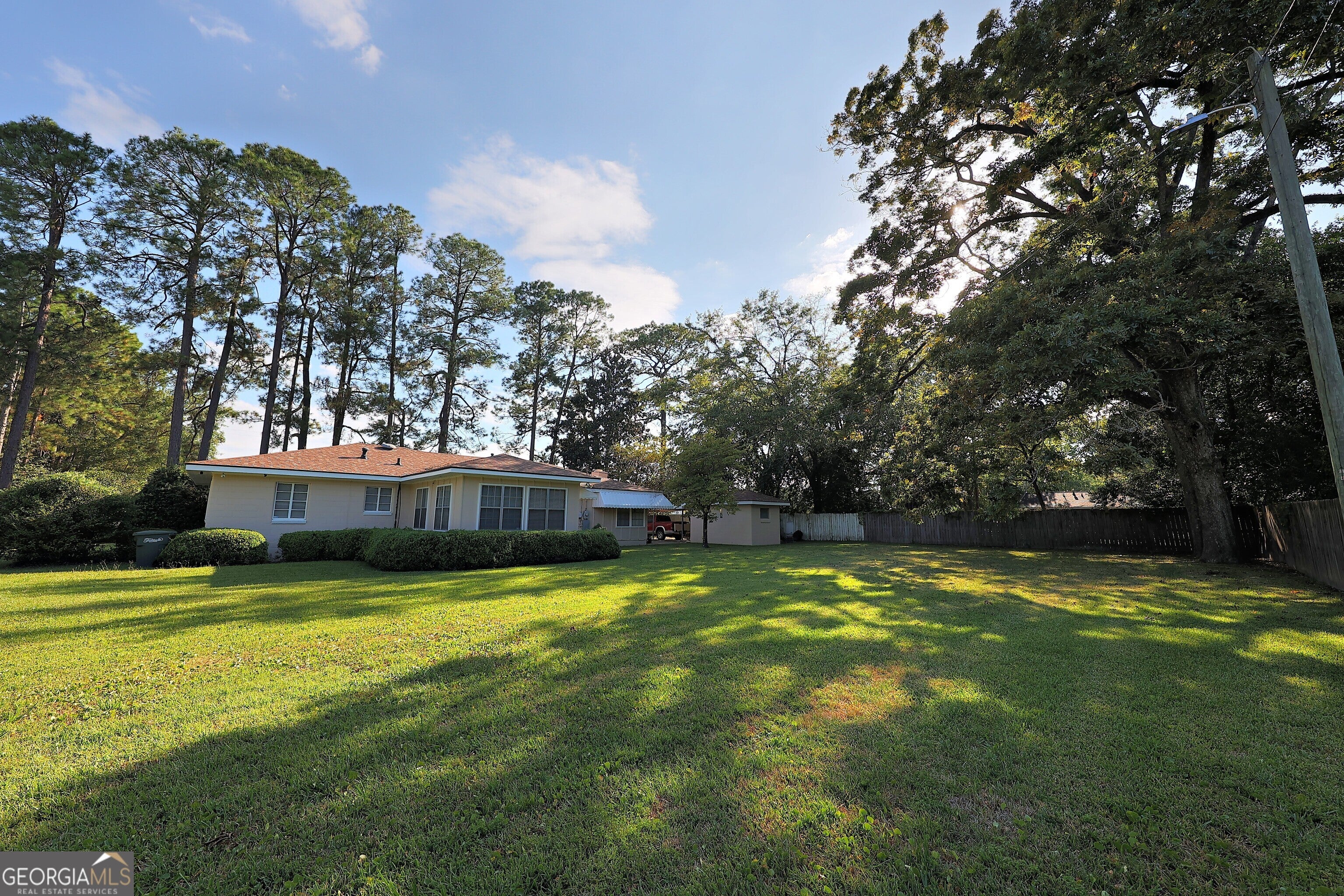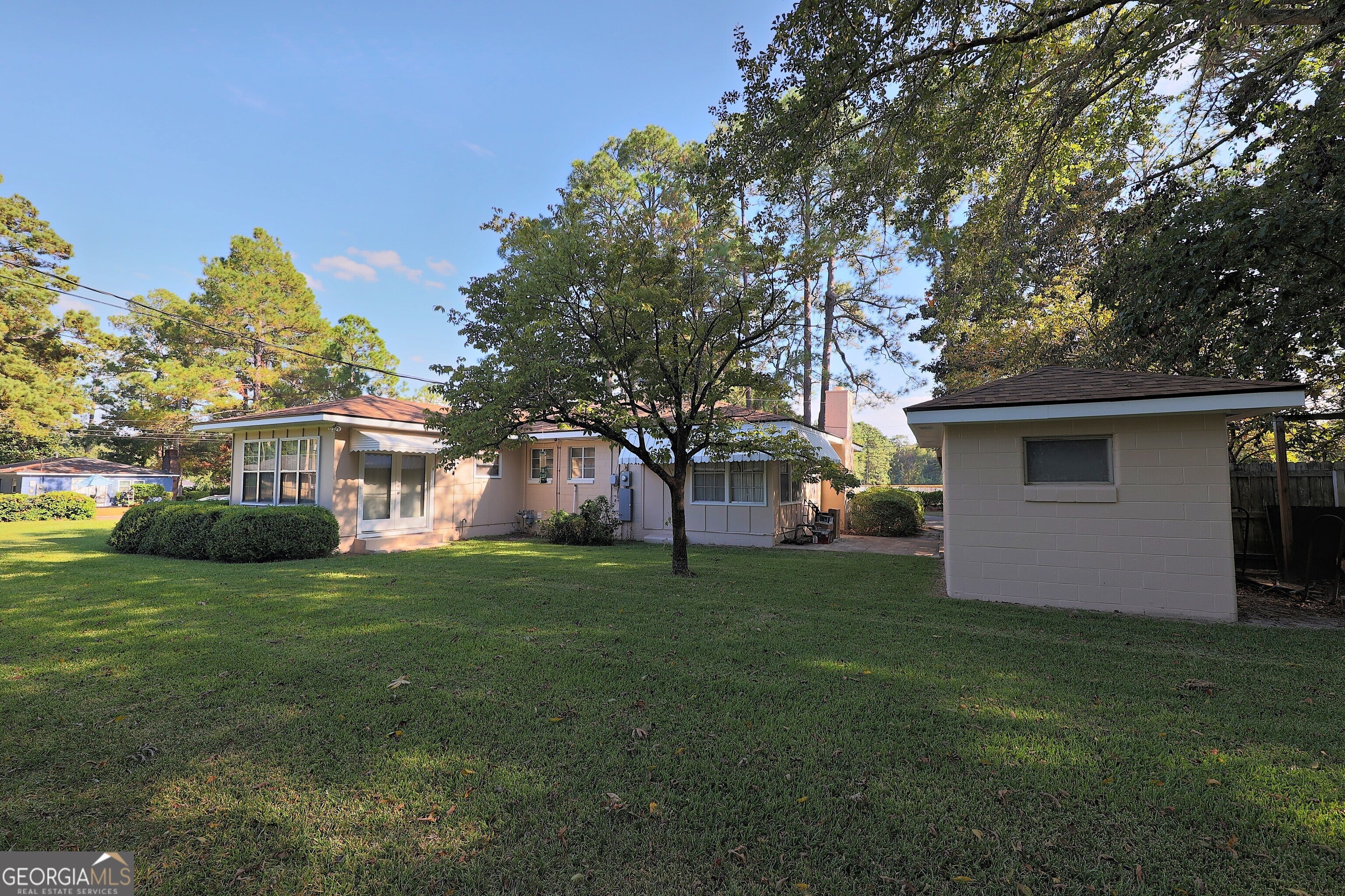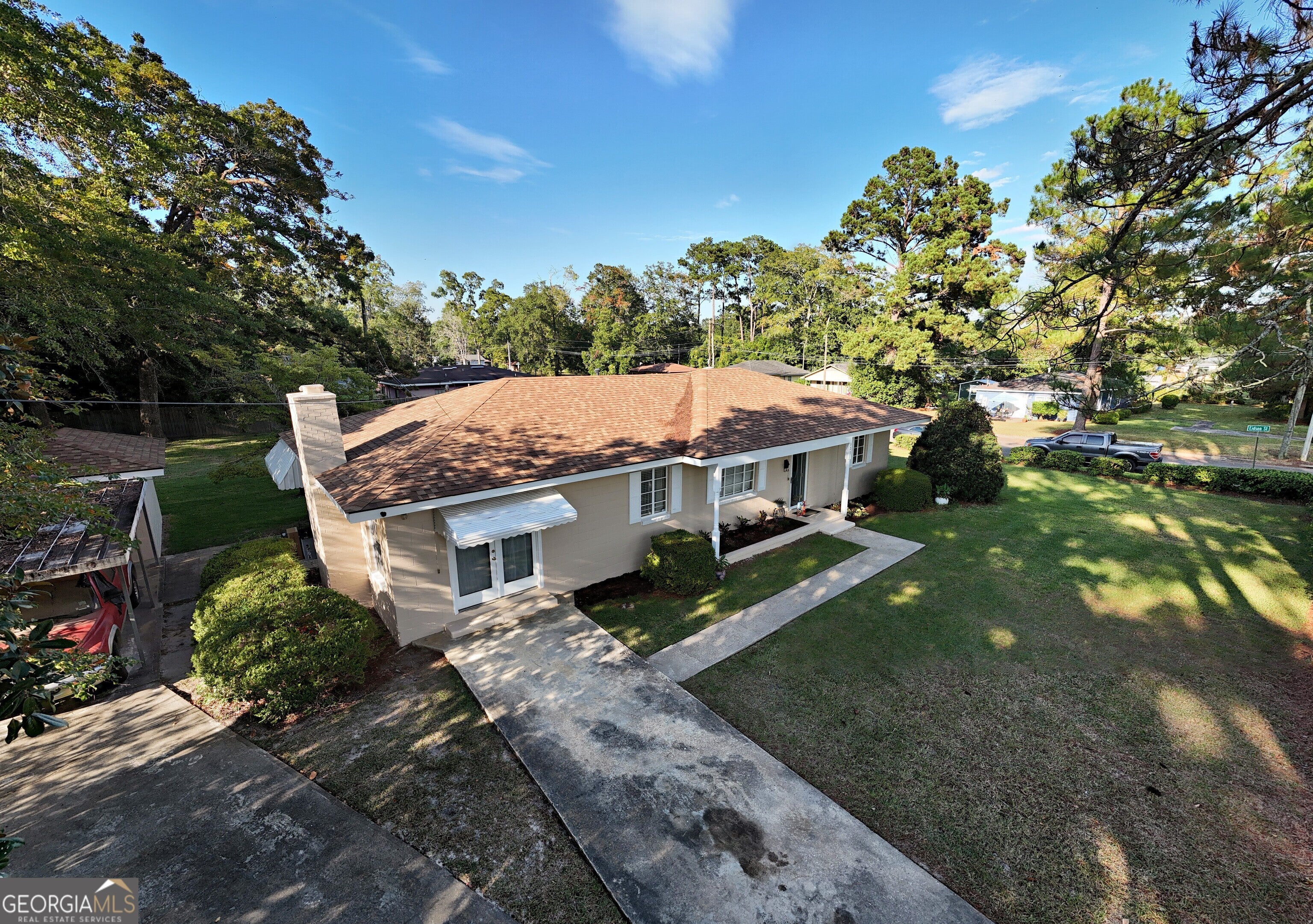 Stunning Mid-Century home on corner lot. Located across from the Thomas University ballfields at Balfour Park, this beautiful 1950's ranch has been well-loved and meticulously maintained. Only minutes from the historic Downtown Thomasville shopping district, where nationally and regionally known shops and restaurants attract visitors from across America and around the world. With interiors featuring Bellawood floors and tongue and groove pine ceilings, there isn't another home so elegantly appointed in this range, New paint inside and out as well as a new roof, HVAC and attractive landscaping. Spacious kitchen with a gas range. Gorgeous dining room, huge kitchen. Bright and airy master bedroom with large windows adjoins a large bonus space currently used as a home office but could function as a nursery, gym or hobby room. French doors open into the shaded backyard. A giant family room, anchored by an impressive wood burning fireplace, is truly the heart of the home, and certain to be the site of many happy gatherings. Outside, a 9x15 concrete storage building with attached carport will protect your vehicle and your toys. You won't find a better value in a home.