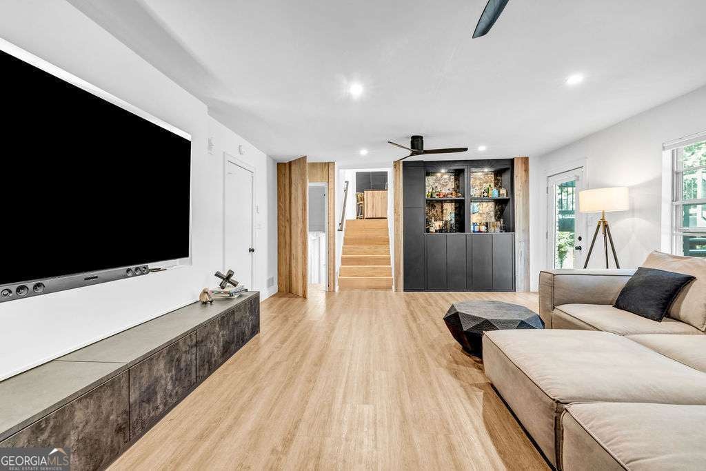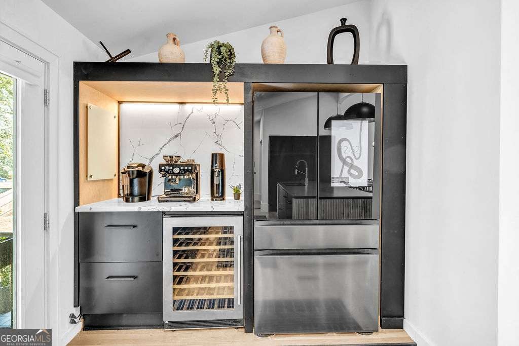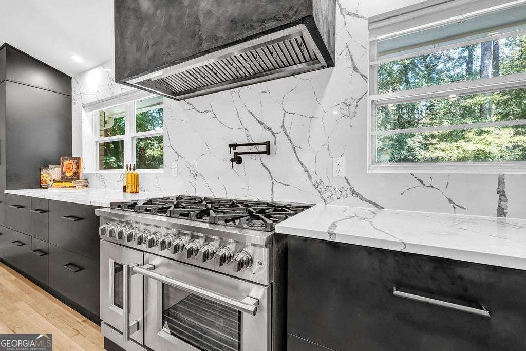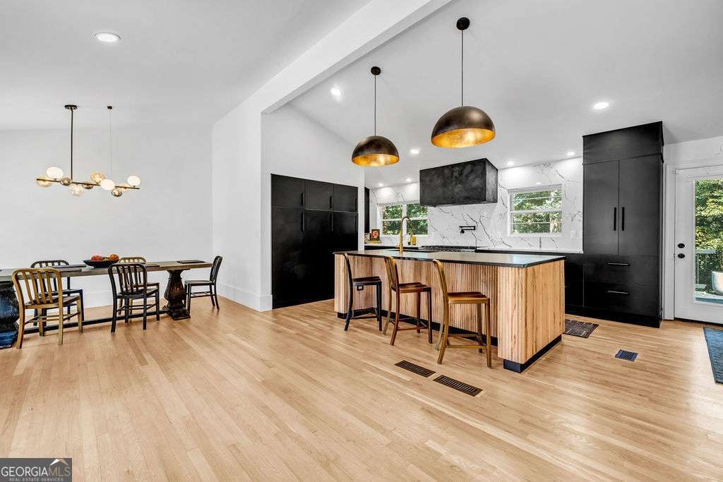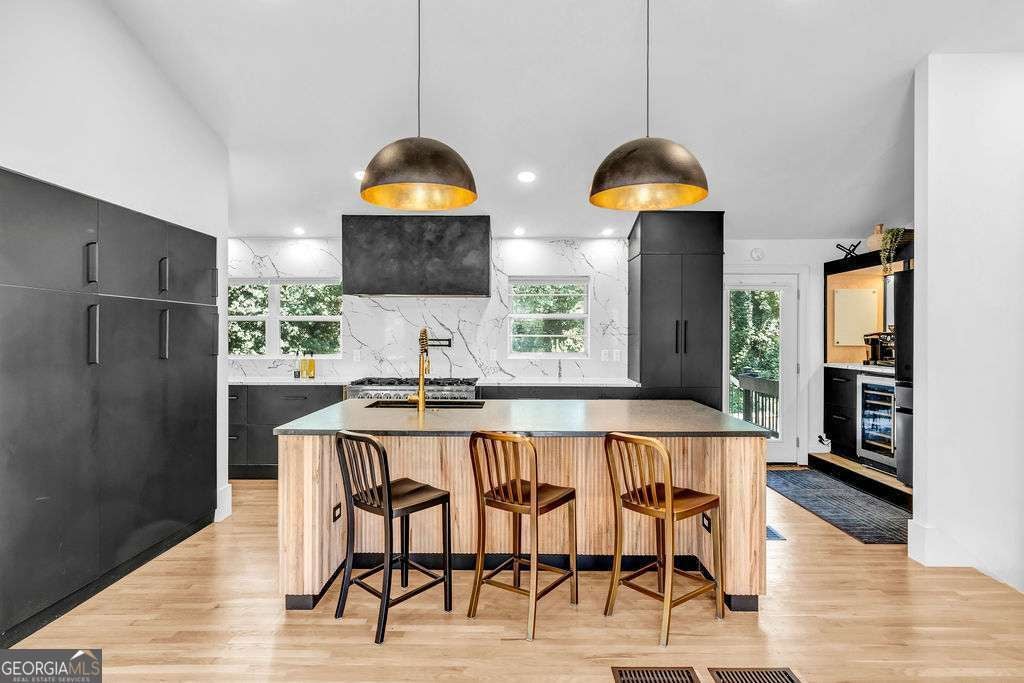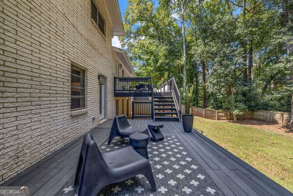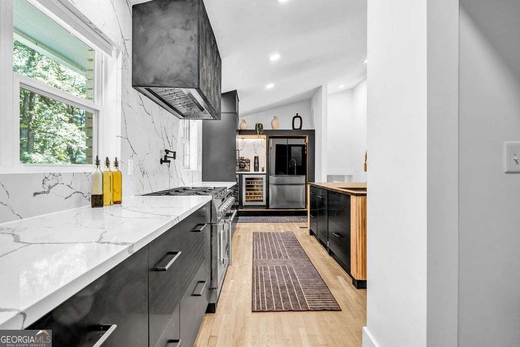 GORGEOUS 4 Level, 5 bed/ 3 bath Home with Chef's Kitchen & Designer Finishes in Atlanta GA! Stunning chef's kitchen, featuring a 48" 8-burner gas range with industrial hood, pot filler, oversized 8' island with black leathered quartz, built-in beverage station with wine fridge and an 11' vaulted walk-in pantry. Quartz counters and backsplash extend to the ceiling for a sleek finish! Serene primary suite boasts 11' vaulted ceilings, spa-like owners bath with double vanity, LED mirrors, walk-in shower, smart toilet, W/D hook-ups and an oversized two-sided closet with built-ins! both upstair secondary bedrooms feature vaulted ceilings, custom bookcases and ample storage. The spacious living room offers a fireplace, built-ins, a stylish bar with storage & lighting, and a secret door to the lower level- perfect for an added sense of privacy, secure spaces, or a fun surprise for guests! The fully finished lower level offers two additional bedrooms, a full bath, gym/flex space, laundry and barn doors for added style. This home is complete with refinished hardwood floors on upper levels & LVP on lower, adjustable can lights, new fans, abundant built-ins, and thoughtful upgrades . Enjoy the fully fenced backyard with multiple outdoor areas designed for both relaxation and entertaining. A two-level deck & private patio located beneath the kitchen deck - a perfect shaded retreat. New furnace & termite warranty in 2023. Move-in ready and FULL of high-end touches. NO HOA. Welcome Home!