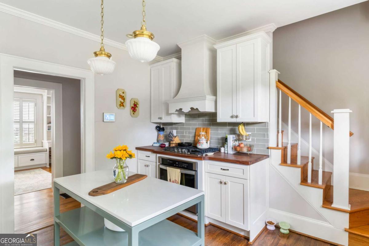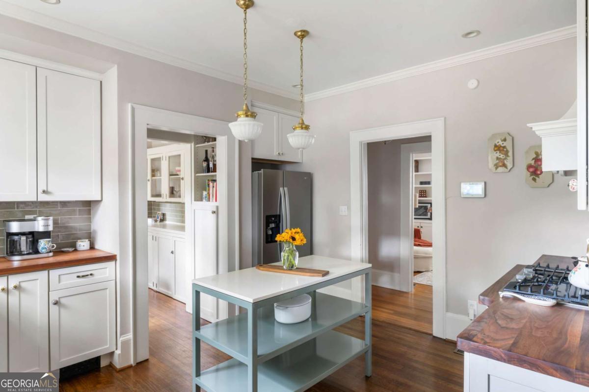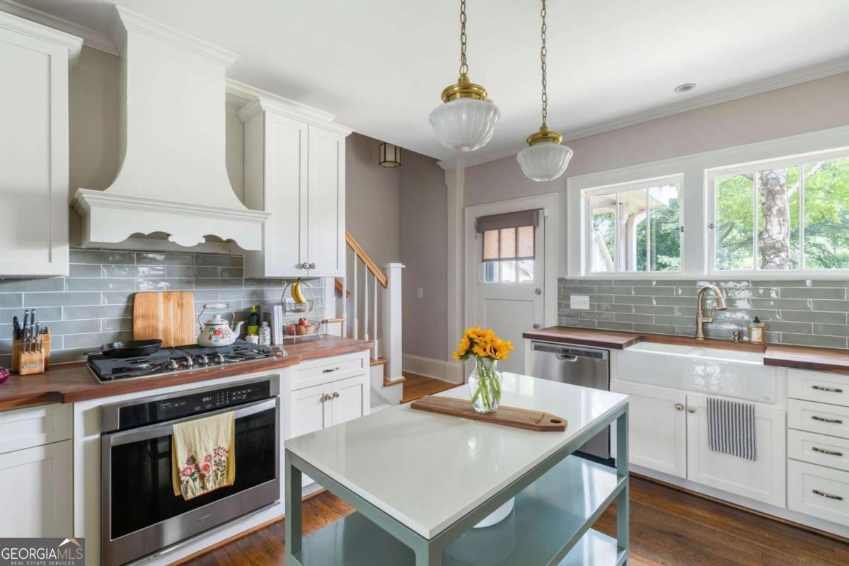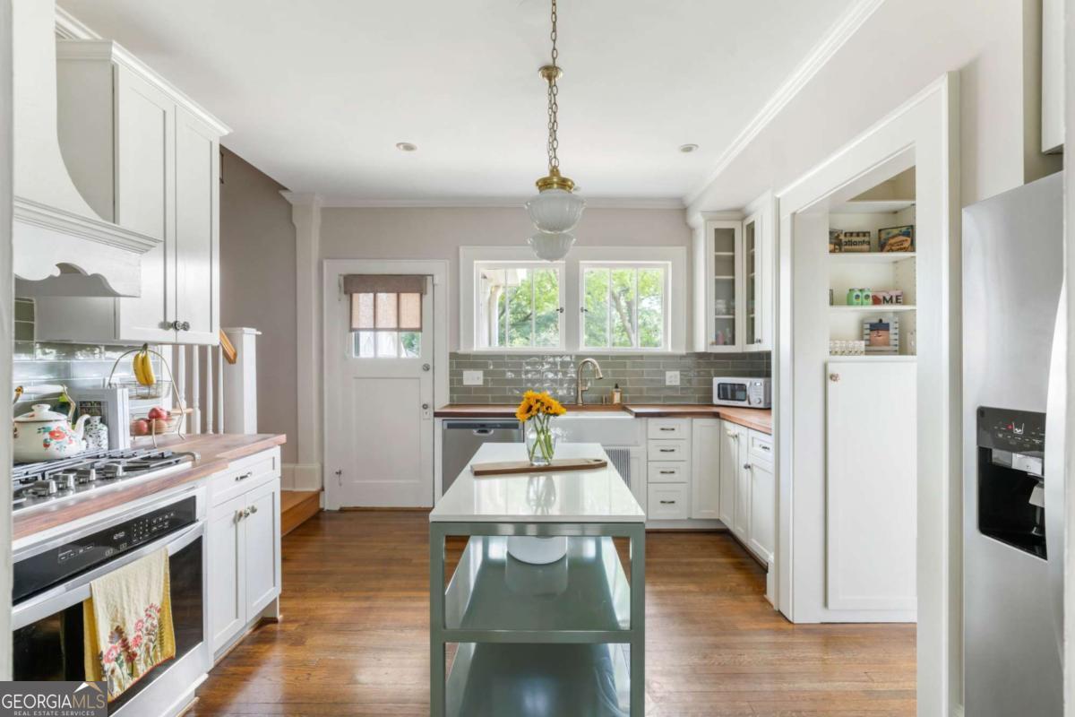 Step back in time with this charming 1920s home, perfectly situated just blocks from historic Marietta Square. Imagine starting your weekend with a stroll to the local farmers market, watching fireworks from your own front lawn on the 4th of July, immersing yourself in year-round festivals, and enjoying all the dining, shopping, and community events that make the Square so beloved. Inside, this four bedroom, two bath home radiates warmth and character with original hardwood floors, millwork, and a gas log fireplace. The kitchen is a true heart of the home - a space that invites you to simmer a pot of soup or savor your afternoon tea. Outfitted with classic white cabinetry, new walnut butcher block counters, quartz-topped custom island, and abundant natural light, it's a kitchen where memories are meant to be made. The primary suite occupies the second level and offers a private retreat with a full bath, while the finished lower basement level provides flexible space for a home gym, media room, or casual hangout - plus ample storage. Outdoors, the charm continues with a beautifully landscaped yard, a welcoming front porch perfect for morning coffee, and a detached two-car garage. This is more than a home. It's a lifestyle steeped in history, community, and everyday comfort, all within steps of the vibrant Marietta Square. Additional upgrades and features include: Updated light fixtures, new interior paint, new HVAC system with EcoBee thermostats, tankless water heater, new garage doors and wall panels, and full irrigation system with new front sod.