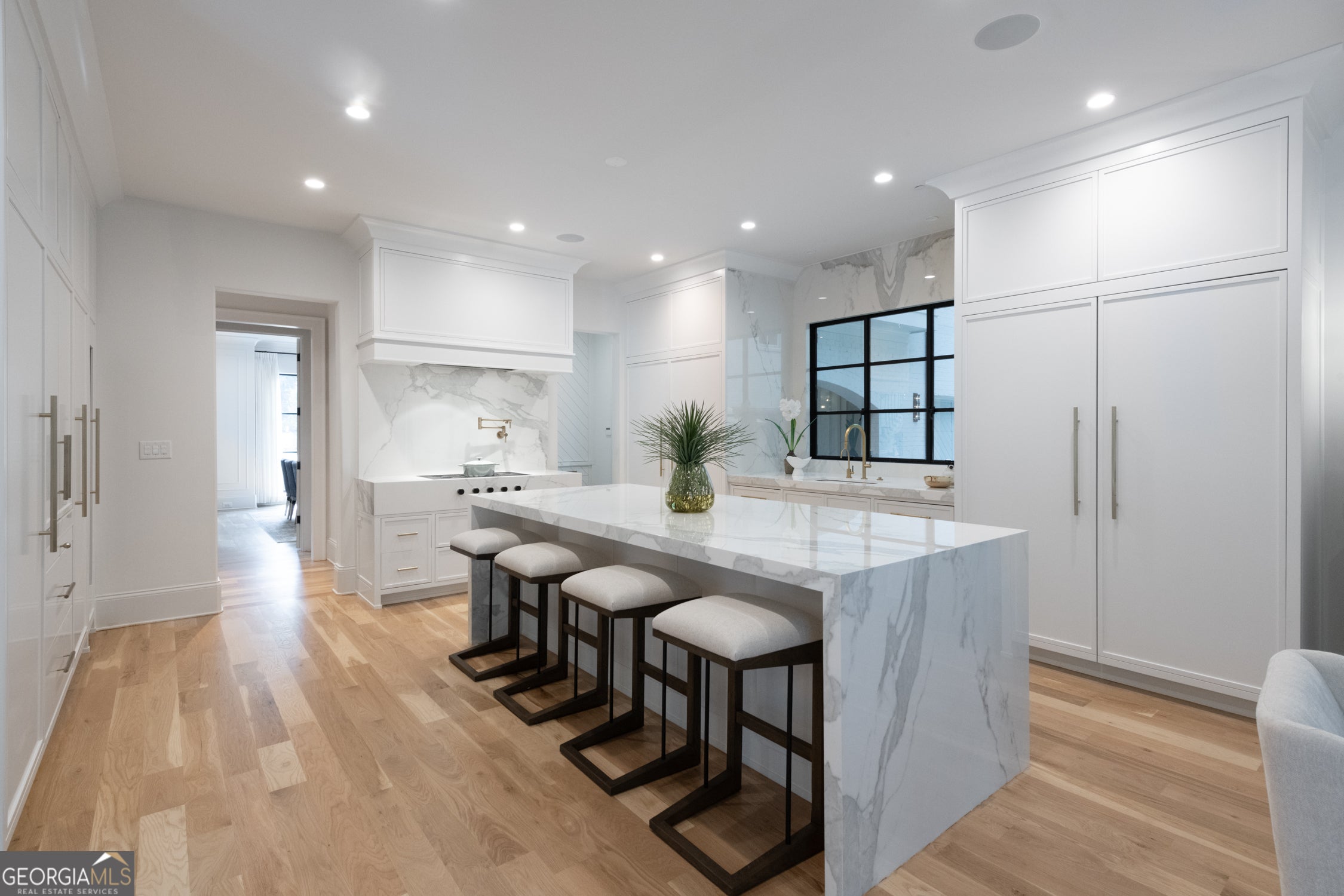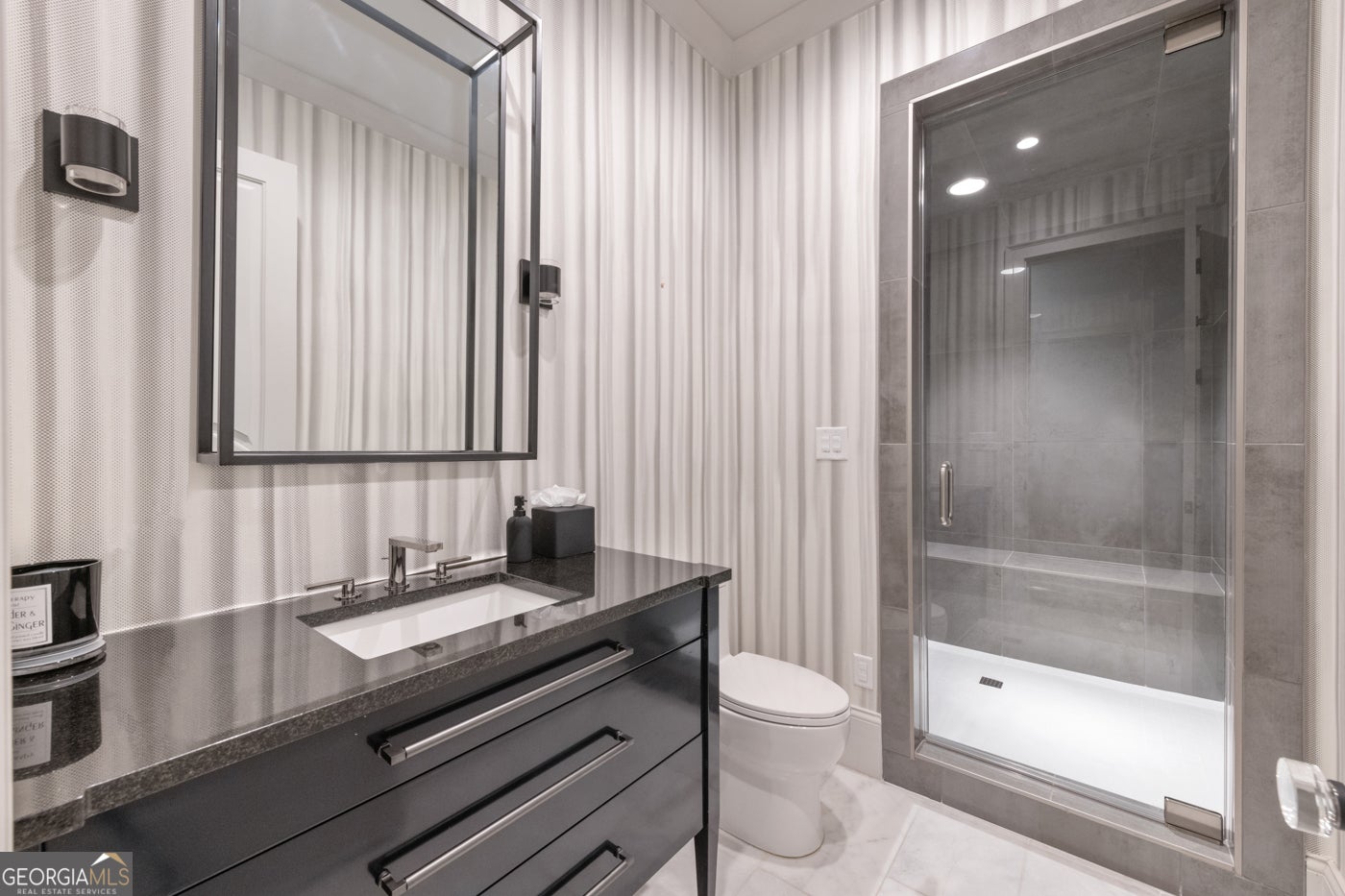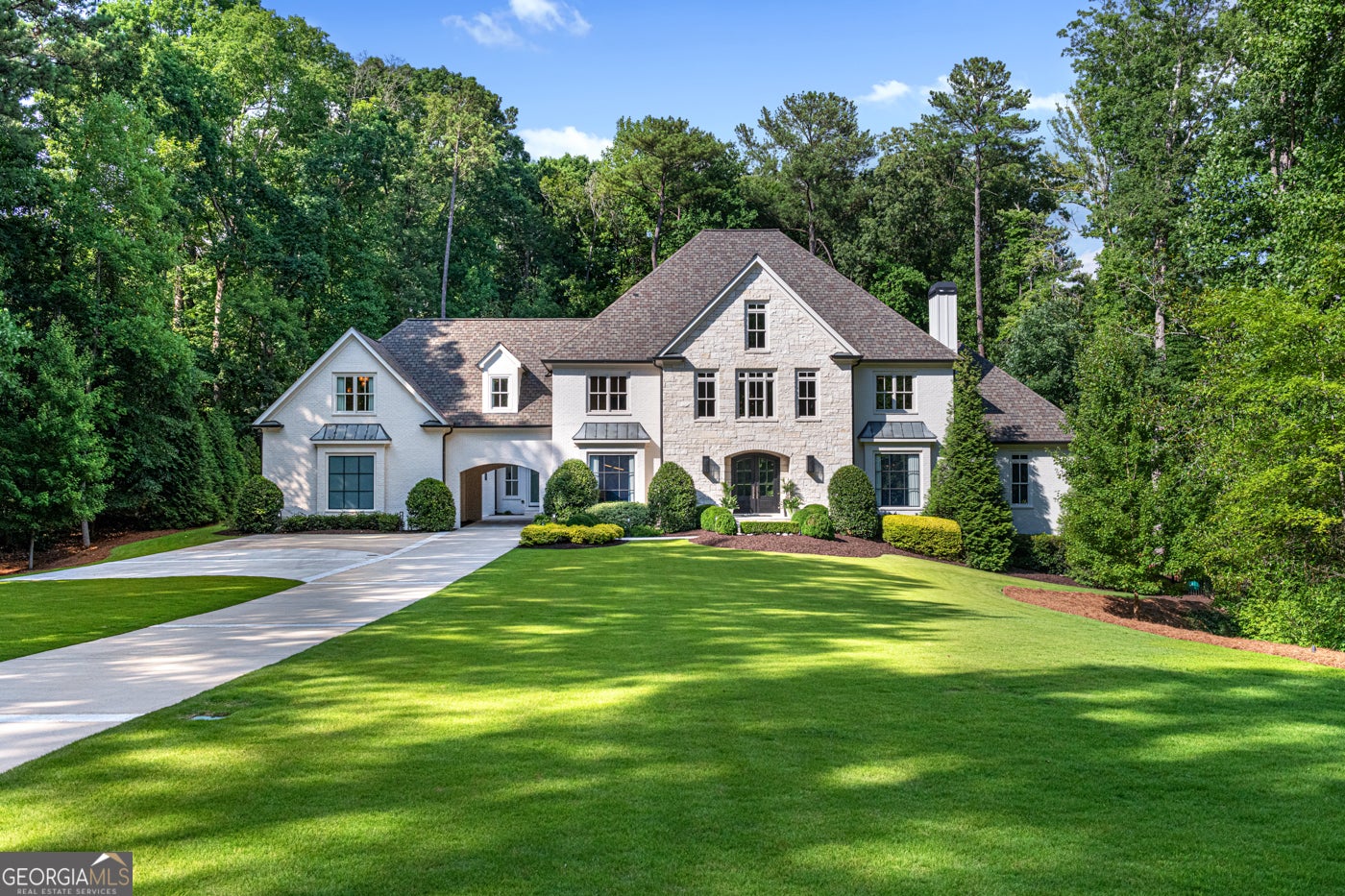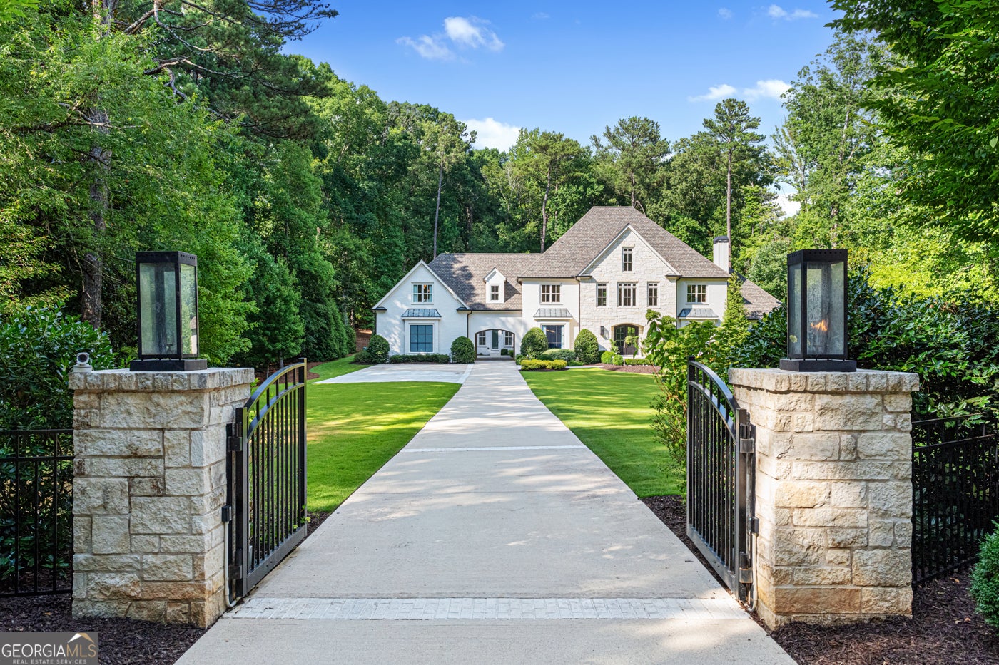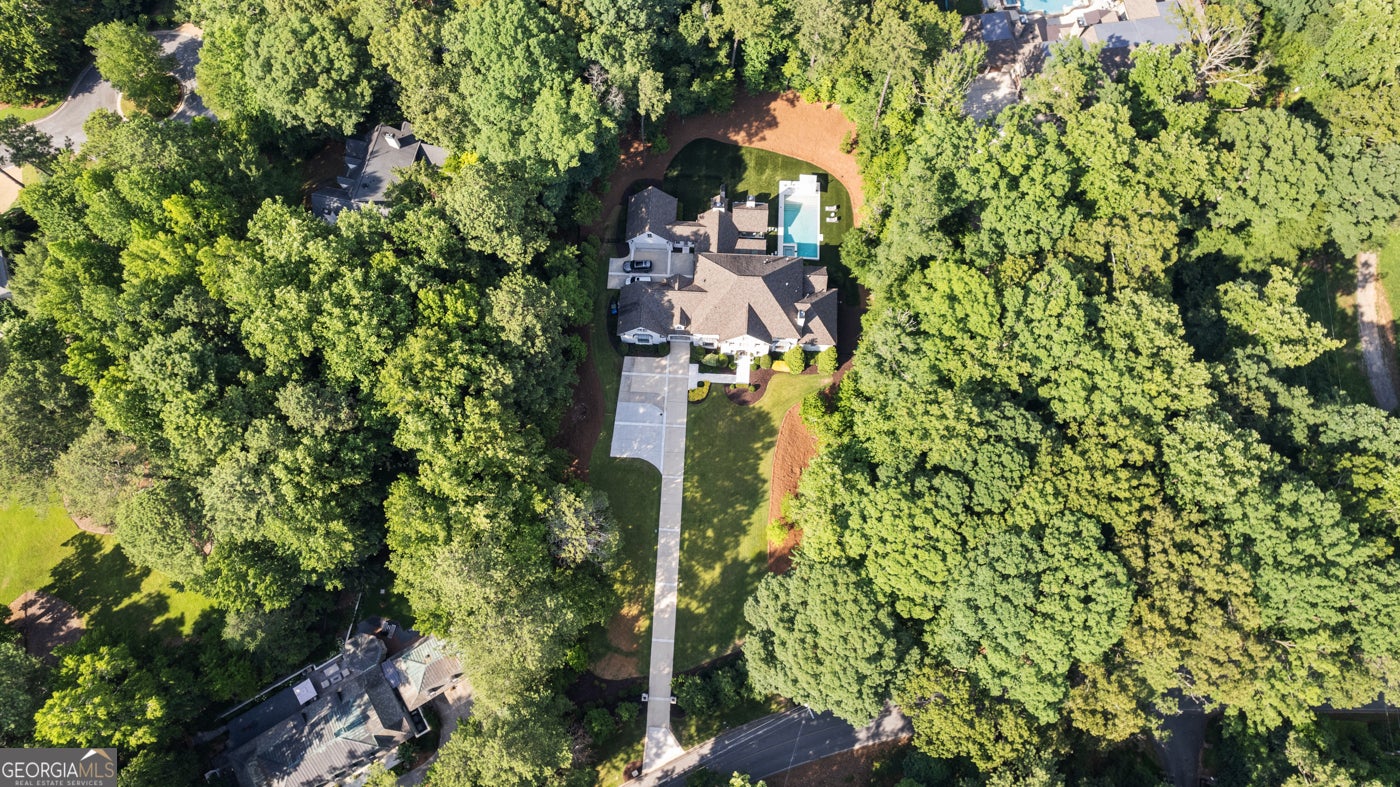 Tucked behind private gates on an expansive 2.1-acre estate in the prestigious Buckhead neighborhood, this exquisite residence is a stunning example of timeless design and refined living. Every element of the home has been thoughtfully curated to blend classical architecture with modern luxury. A dramatic two-story foyer greets you with a sweeping curved staircase and floods of natural light, setting the tone for the sophistication within. To one side, a richly appointed study showcases bespoke floor-to-ceiling millwork and a striking view of the private front landscape. On the other, the formal dining room impresses with detailed trim work, soaring ceilings, and elegant proportions ideal for both intimate gatherings and large-scale entertaining. The main living room offers a harmonious balance of grandeur and comfort, featuring a tray ceiling, a bold stone fireplace, and a wall of windows that seamlessly merge indoor and outdoor living. Adjacent is the chef's kitchen, a true centerpiece of the home, anchored by a stunning marble waterfall island and outfitted with top-tier appliances concealed within custom cabinetry. A burnished brass pot filler, sleek vent hood, and wine refrigerator complete this space designed for both form and function. Flowing naturally from the kitchen, the light-filled family room is a haven for relaxed living, with vaulted ceilings and expansive windows that frame views of the beautifully landscaped walk out turf backyard and open gracefully to an outdoor veranda with automated screens. The main-level primary suite is a serene retreat with a vaulted ceiling and wooded vistas. Its en-suite bath evokes a boutique spa experience, featuring a sculptural stone soaking tub, a dramatic glass-enclosed marble shower, dual vanities with ambient lighting, and his-and-hers dressing rooms finished in rich custom cabinetry. Upstairs, five well-appointed bedrooms each feature private en-suite baths. A separate guest suite includes its own living space and bathroom, offering a versatile area perfect for extended stays, children's activities, or a private lounge. The home also includes an elevator that serves all levels, leading to an impressive terrace level designed for indulgence and leisure. Highlights include a glass-front, climate-controlled wine cellar, a professional-grade home theater, a full fitness suite with a mirrored studio for dance, barre, or yoga, and an additional living area complete with a full kitchen and guest accommodations. Outdoors, this estate continues to elevate the lifestyle with a resort-style saltwater pool and tanning shelf, expansive flat lawn, and dual covered pavilions featuring a wood-burning fireplace and vaulted wood ceilings ideal for alfresco dining and year-round enjoyment. A gated area offers the perfect space for pets or play. This is a rare opportunity to own a truly bespoke residence in one of Atlanta's most sought-after addresses an estate that defines elegance, privacy, and timeless sophistication.