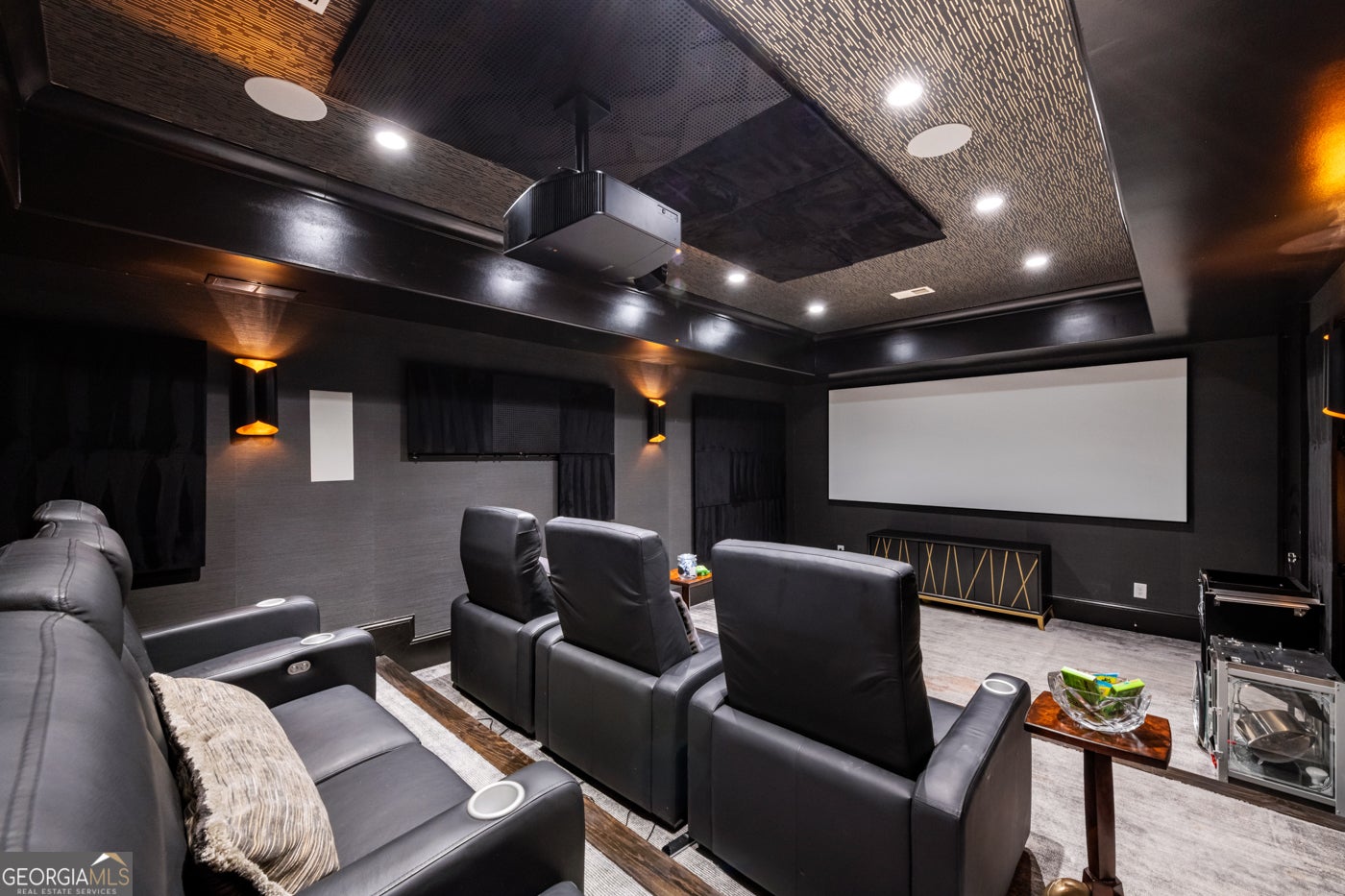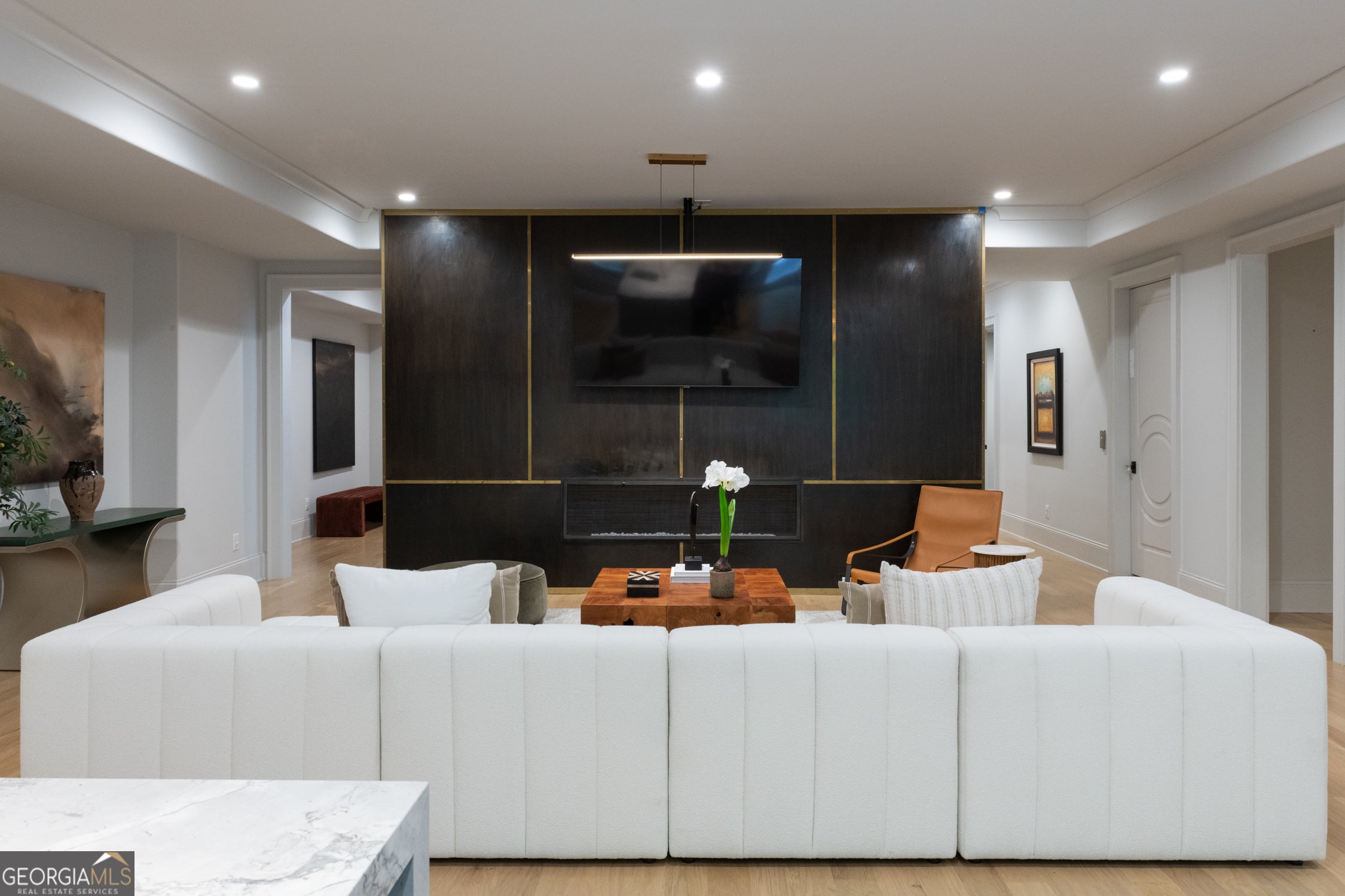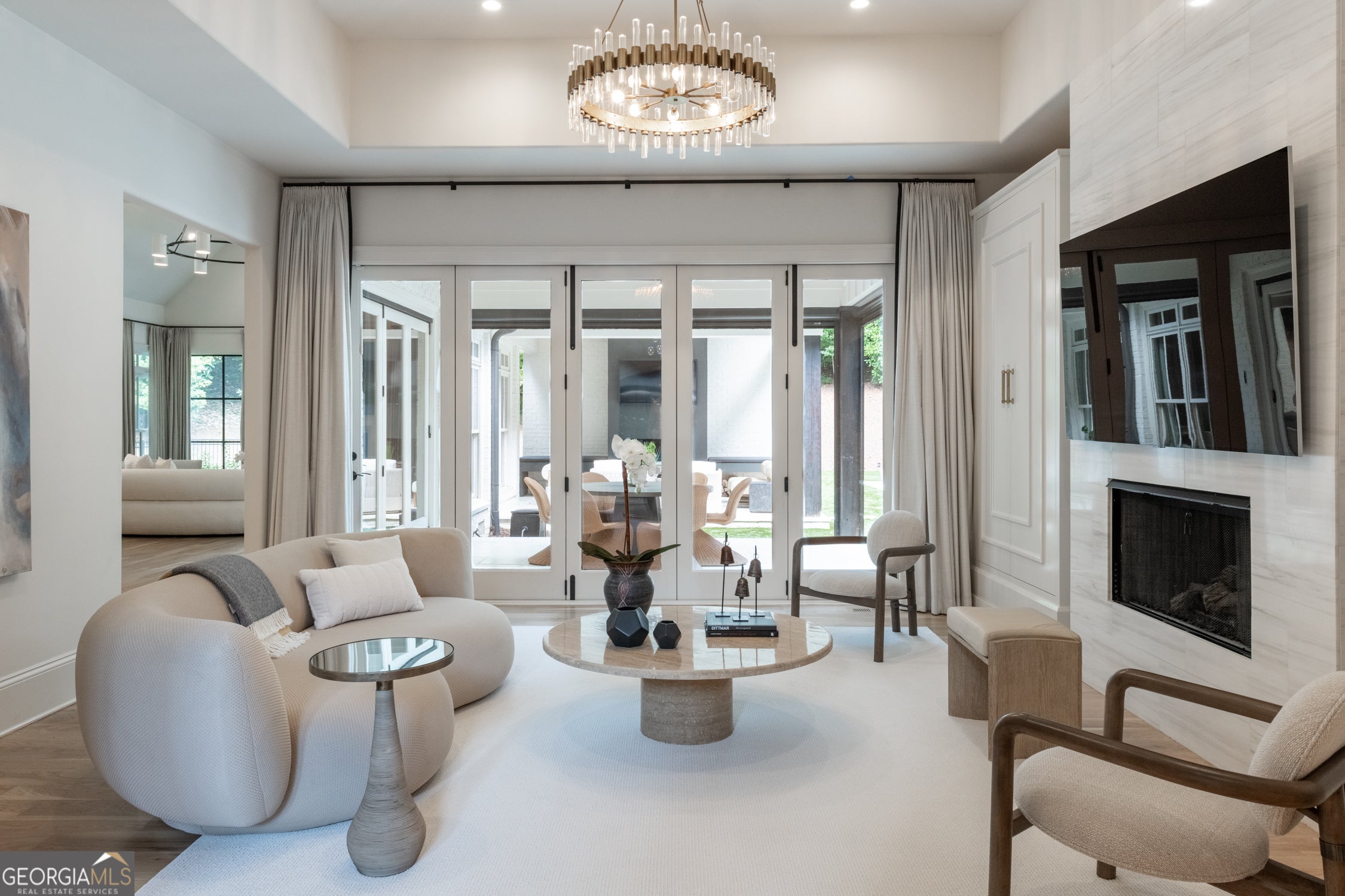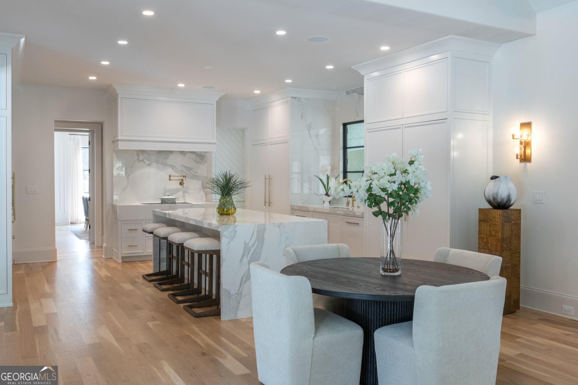 Tucked behind private gates on an expansive 2.1-acre estate in the prestigious Buckhead neighborhood, this exquisite residence is a stunning example of timeless design and refined living. Every element of the home has been thoughtfully curated to blend classical architecture with modern luxury. A dramatic two-story foyer greets you with a sweeping curved staircase and floods of natural light, setting the tone for the sophistication within. To one side, a richly appointed study showcases bespoke floor-to-ceiling millwork and a striking view of the private front landscape. On the other, the formal dining room impresses with detailed trim work, soaring ceilings, and elegant proportions ideal for both intimate gatherings and large-scale entertaining. The main living room offers a harmonious balance of grandeur and comfort, featuring a tray ceiling, a bold stone fireplace, and a wall of windows that seamlessly merge indoor and outdoor living. Adjacent is the chef's kitchen, a true centerpiece of the home, anchored by a stunning marble waterfall island and outfitted with top-tier appliances concealed within custom cabinetry. A burnished brass pot filler, sleek vent hood, and wine refrigerator complete this space designed for both form and function. Flowing naturally from the kitchen, the light-filled family room is a haven for relaxed living, with vaulted ceilings and expansive windows that frame views of the beautifully landscaped walk out turf backyard and open gracefully to an outdoor veranda with automated screens. The main-level primary suite is a serene retreat with a vaulted ceiling and wooded vistas. Its en-suite bath evokes a boutique spa experience, featuring a sculptural stone soaking tub, a dramatic glass-enclosed marble shower, dual vanities with ambient lighting, and his-and-hers dressing rooms finished in rich custom cabinetry. Upstairs, five well-appointed bedrooms each feature private en-suite baths. A separate guest suite includes its own living space and bathroom, offering a versatile area perfect for extended stays, children's activities, or a private lounge. The home also includes an elevator that serves all levels, leading to an impressive terrace level designed for indulgence and leisure. Highlights include a glass-front, climate-controlled wine cellar, a professional-grade home theater, a full fitness suite with a mirrored studio for dance, barre, or yoga, and an additional living area complete with a full kitchen and guest accommodations. Outdoors, this estate continues to elevate the lifestyle with a resort-style saltwater pool and tanning shelf, expansive flat lawn, and dual covered pavilions featuring a wood-burning fireplace and vaulted wood ceilings ideal for alfresco dining and year-round enjoyment. A gated area offers the perfect space for pets or play. This is a rare opportunity to own a truly bespoke residence in one of Atlanta's most sought-after addresses an estate that defines elegance, privacy, and timeless sophistication.