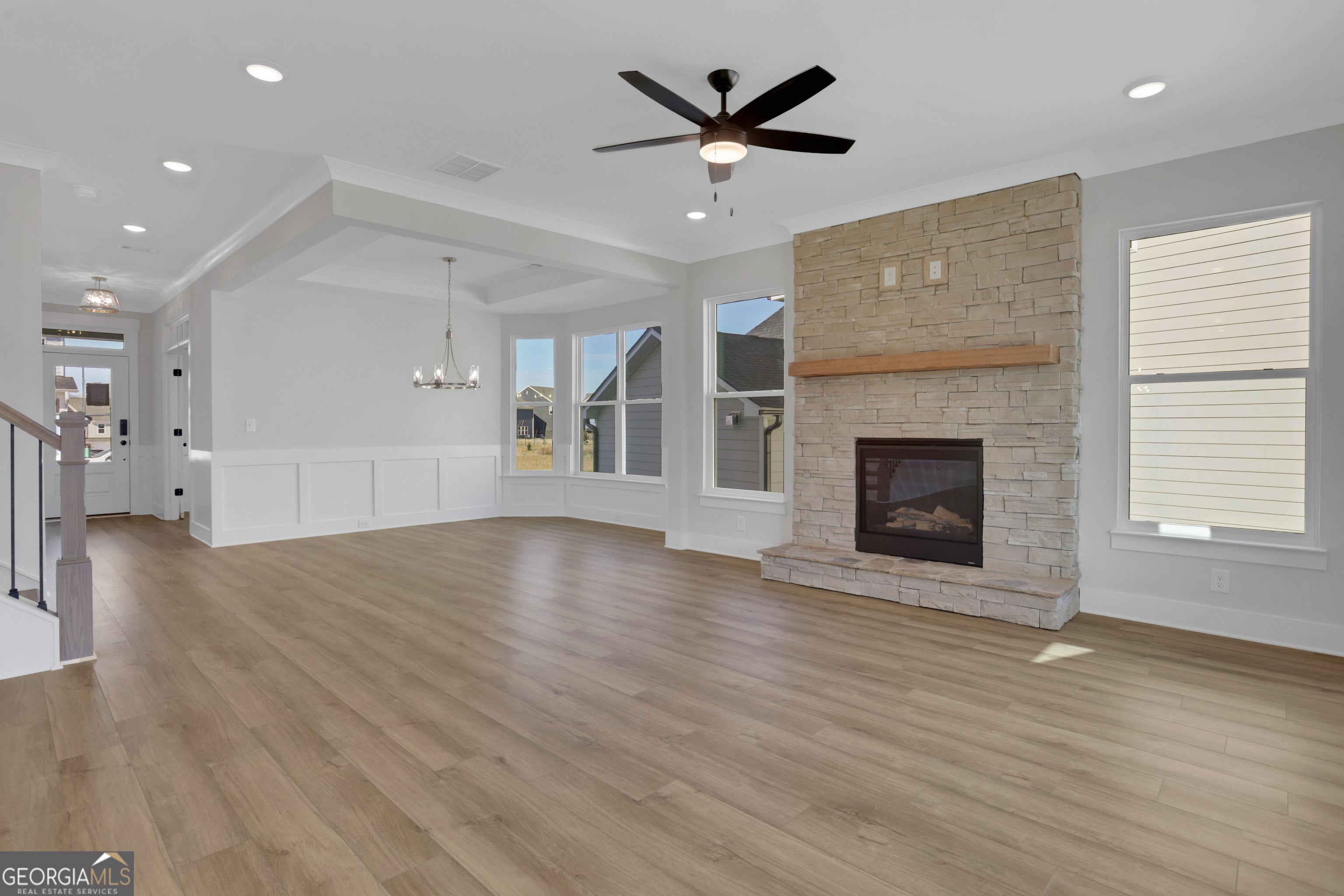 Receive $10,000 closing costs with our partner lender (on contracts written by 3/31/26). Fall in love with the Drexel by Eastwood Homes in the desirable Twin Lakes community! This three-story showstopper is thoughtfully designed with timeless details, flexible spaces, and a backyard you'll never want to leave. The main level greets you with a private office for quiet focus, a formal dining room with a charming bay window, and a welcoming living room anchored by a stacked-stone fireplace and cedar mantel. The open breakfast room flows seamlessly to a covered back porch overlooking a spacious, deep backyard - perfect for kids, pets, or weekend gatherings. At the heart of the home, the gourmet kitchen shines with stained cabinetry, crisp white quartz countertops, gold fixtures, and eye-catching accent tile. A convenient powder bath adds extra function for family and guests. Upstairs, the second floor offers four generous bedrooms, including the primary suite with a spa-worthy bathroom featuring a luxury shower designed with a modern farmhouse feel. Two additional full baths and a versatile loft make this floor perfect for everyday living. The third floor extends your living space even further with an additional bedroom, full bath, and a versatile loft - ideal for guests, a private retreat, or a creative escape. Life at Twin Lakes is just as special, with two sparkling pools, a clubhouse, fitness center, playgrounds, and scenic walking trails. Best of all, if you have a golf cart, you can cruise right to the Publix located at the community entrance for everyday convenience. The Drexel brings together modern elegance, flexible living, and the kind of backyard space you've been dreaming of - a home that truly has it all!