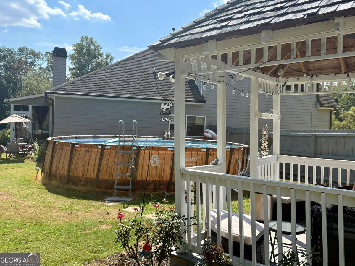 Welcome Home!! This beautiful 4 bedroom 3 bathroom house is in a quiet cul-de-sac. This spacious home combines comfort, versatility, and outdoor living. A cozy porch welcomes you into the open-concept living room, dining room, and kitchen, complete with vaulted ceilings and a beautiful gas fireplace-perfect for relaxing or entertaining. The main level includes the master suite with a spa-like bathroom featuring a double vanity, separate tub and shower, and a large walk-in closet. Two additional bedrooms and a second full bathroom are also on the main level, along with a separate office and a dedicated laundry room. Upstairs, a fourth bedroom offers its own full bathroom-ideal for guests or a teen suite. The garage has been converted into a climate-controlled, carpeted game room but can still function as a garage if needed. Outdoor living is a dream with a screened-in porch, gazebo, large above-ground pool, two fountains, separate shed, and a fully fenced backyard. This yard also keeps your fur babies safe with an invisible fence around the perimeter. This home perfectly blends comfort, style, and functionality- schedule your showing today!!