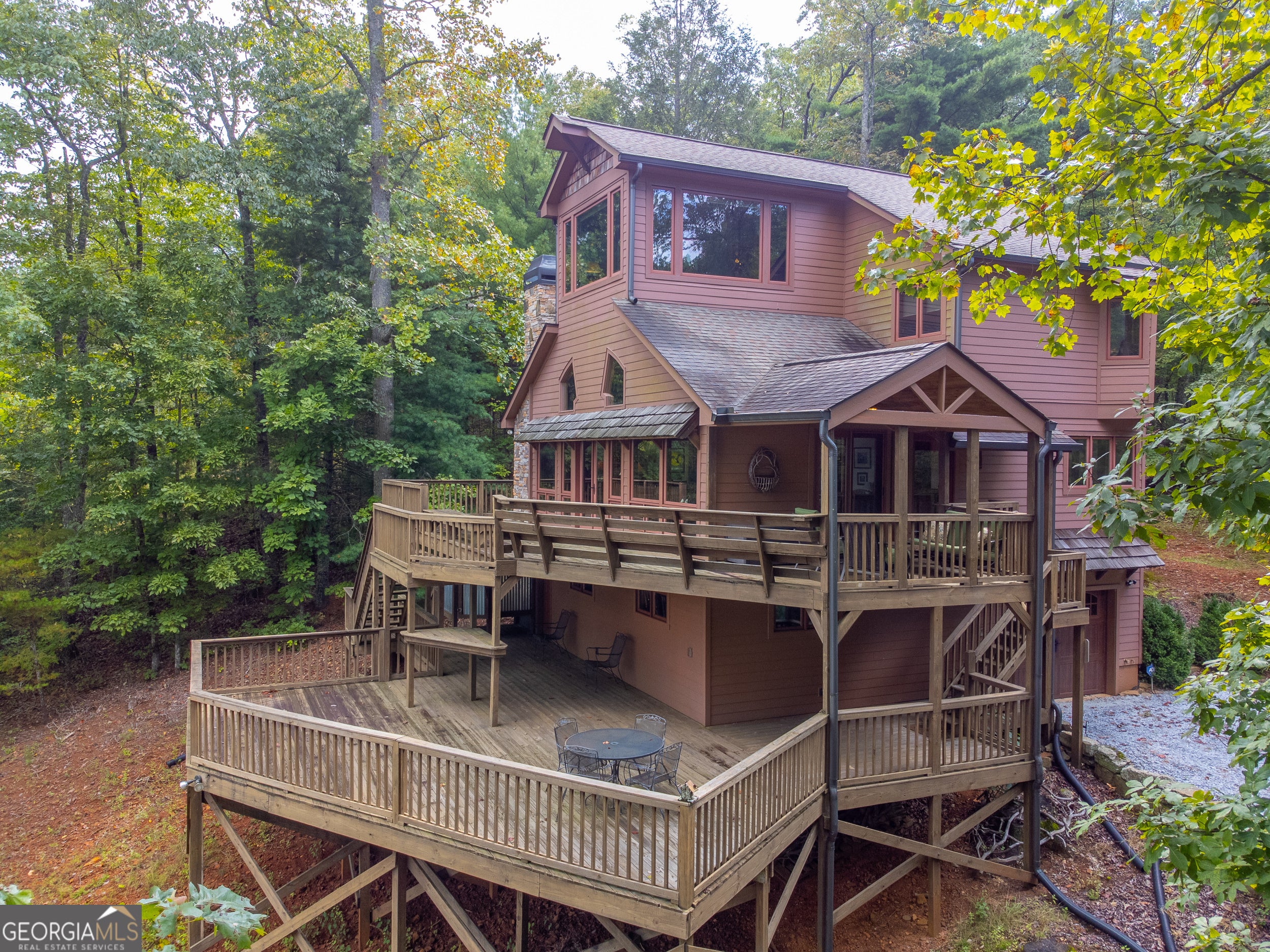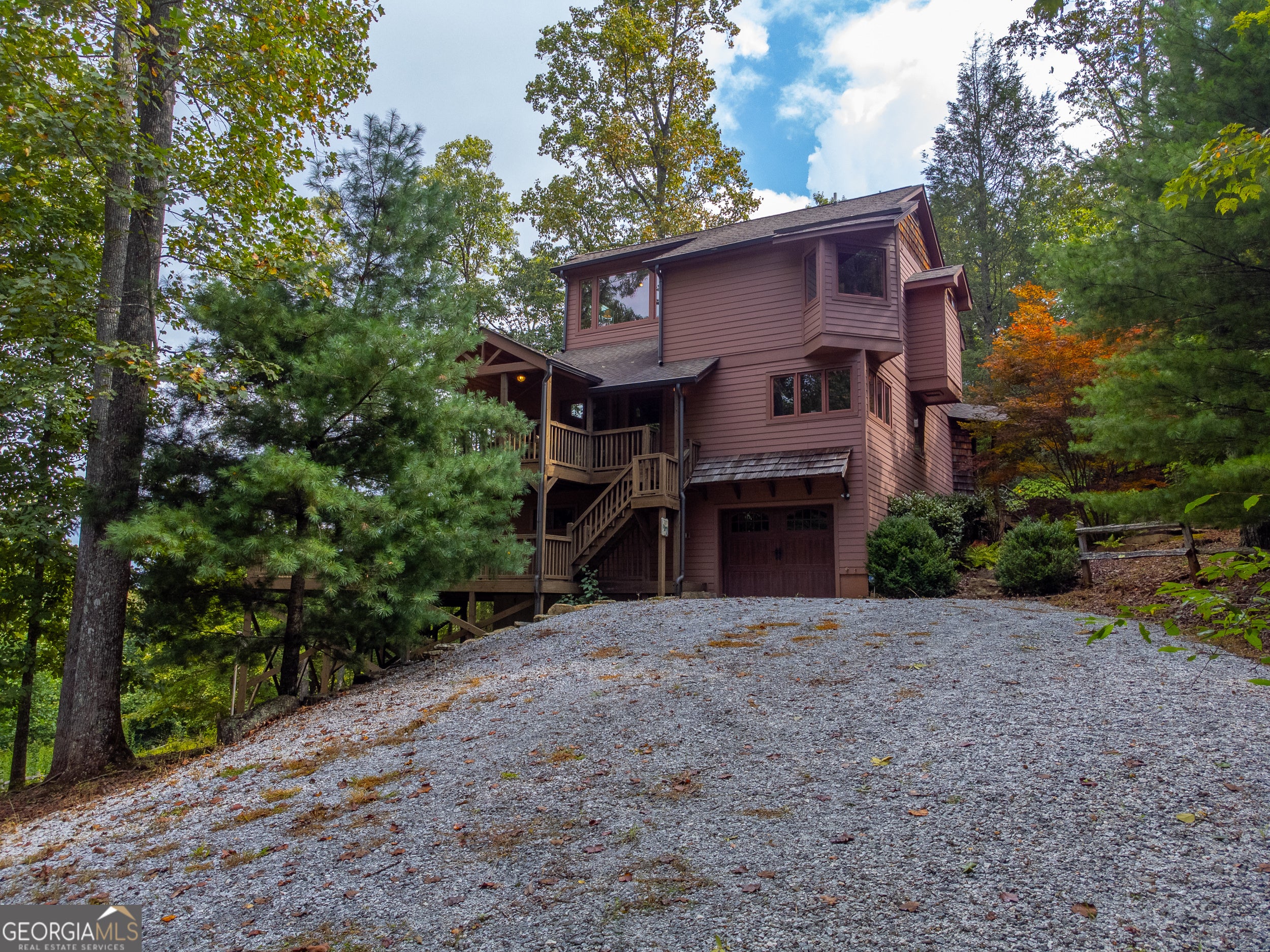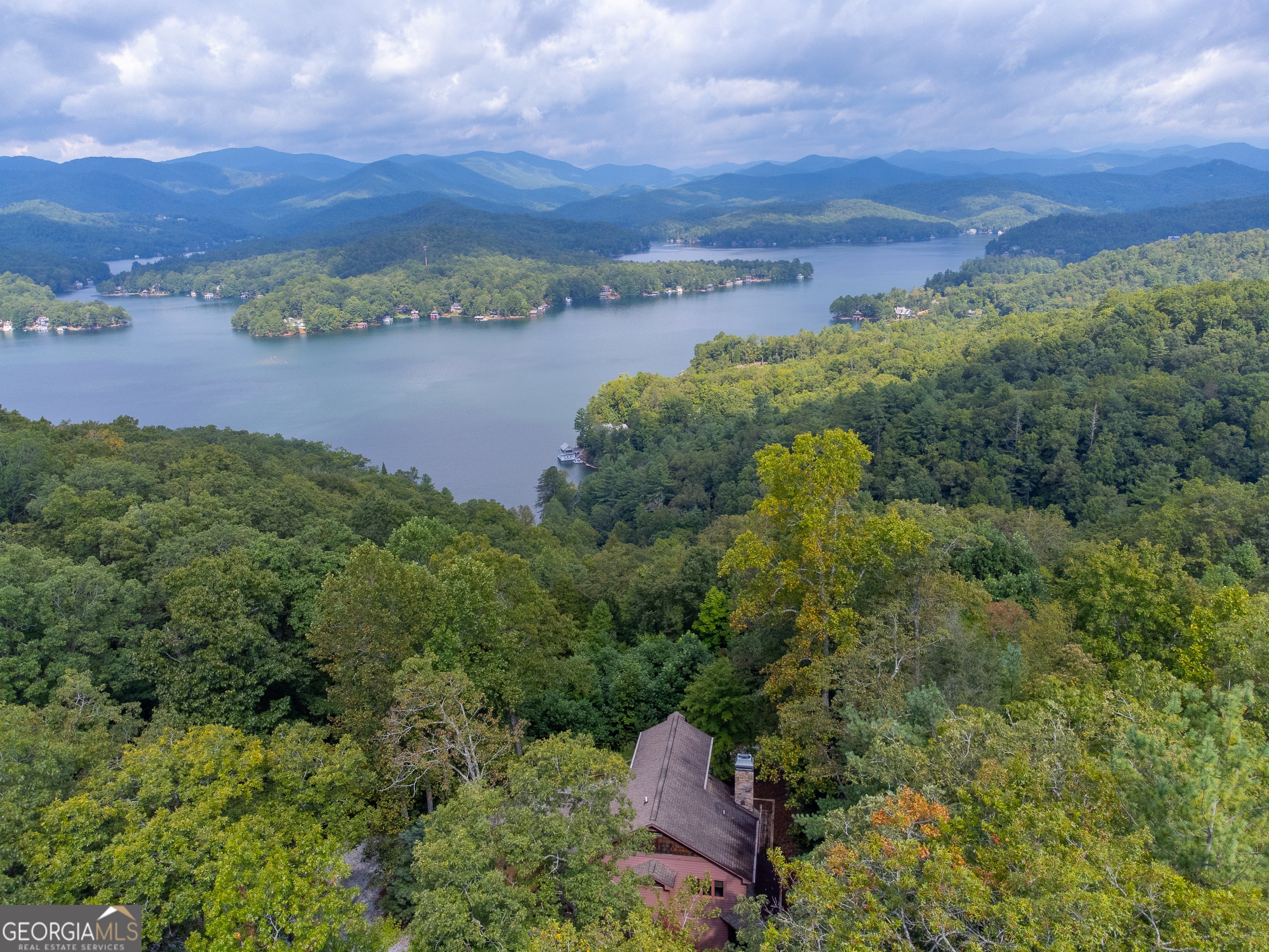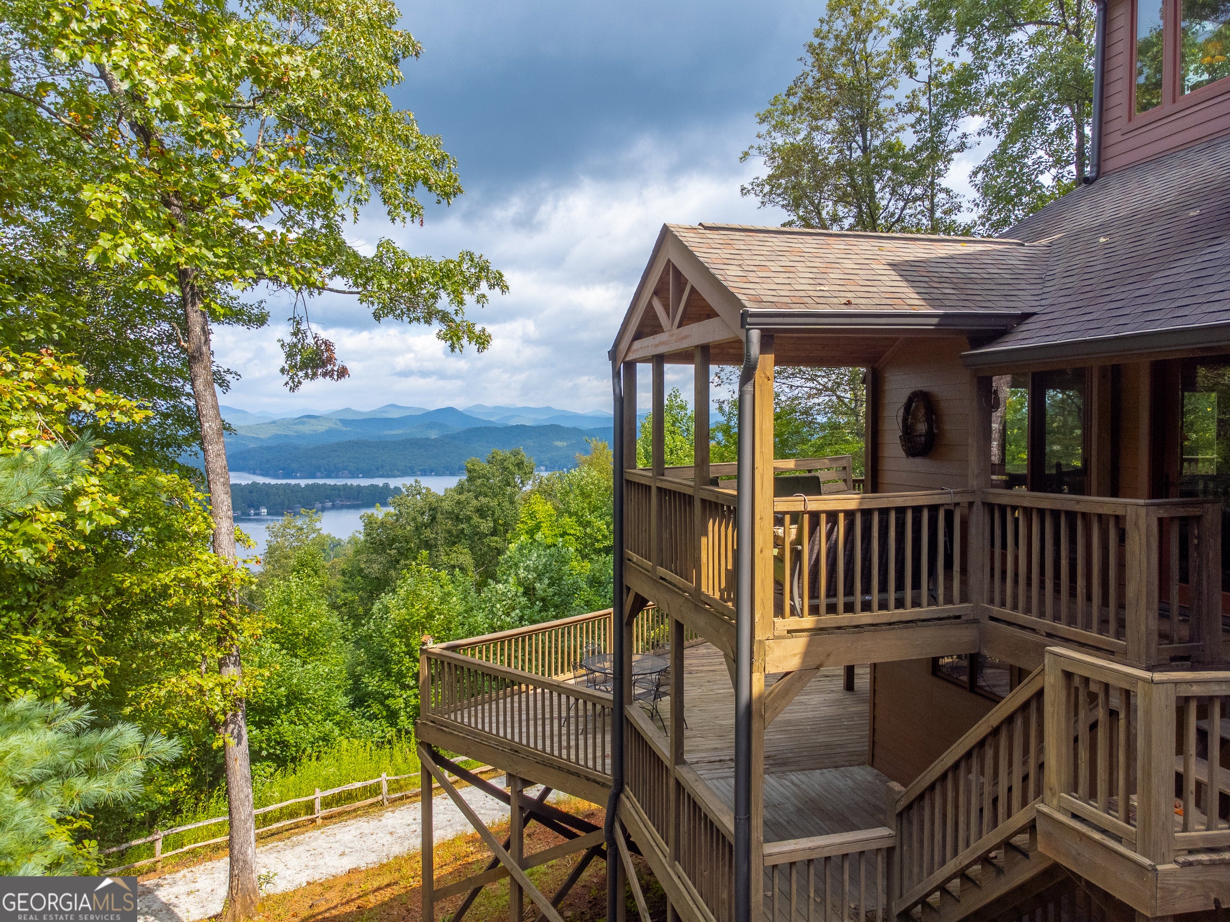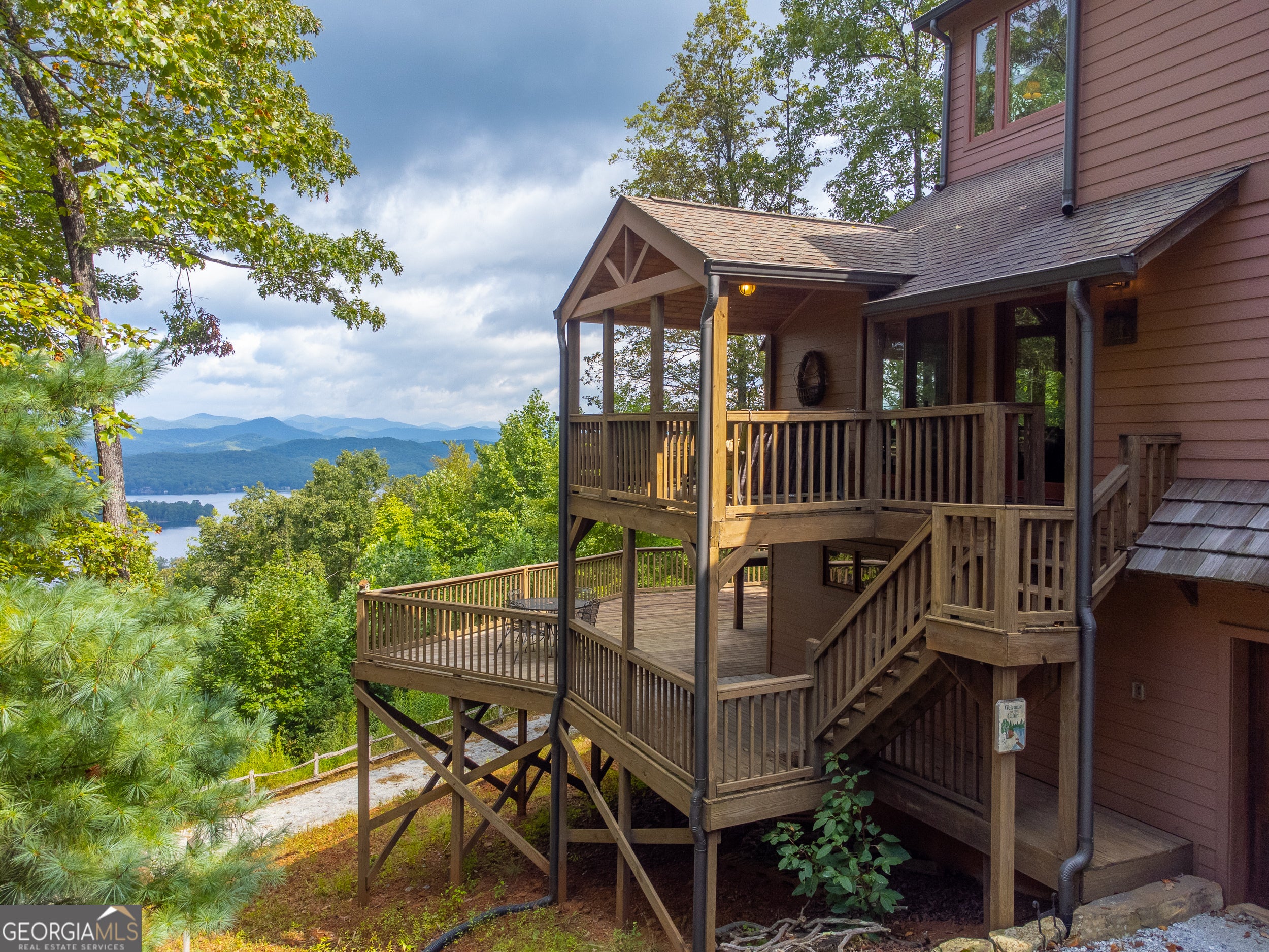 Enjoy an incredible weekend get-a-way in this 3 BR,2.5 ba mountain treehouse with majestic Lake Burton and distant mountain views. A fieldstone foyer with half bath introduces a quaint and charming living room with stacked stone fireplace, wet bar, wrap-around porch and views from every deck. The country kitchen boasts hand painted Mexican tiles, oven/range, dishwasher, double sinks, trash compactor, breakfast bar and separate dining area. Tongue and groove pine paneling throughout the house adds to the ambiance. The second floor has two guest bedrooms (one with window seat and lake views) with shared bath and hallway bunkbeds. You don't want to miss the Crow's Nest owner's suite with panoramic lake and mountain views, full bath with double vanity, river rock shower, utility closets and closet nooks. The lowest level is an outside entrance two-car garage with stack washer and dryer and outdoor shower.