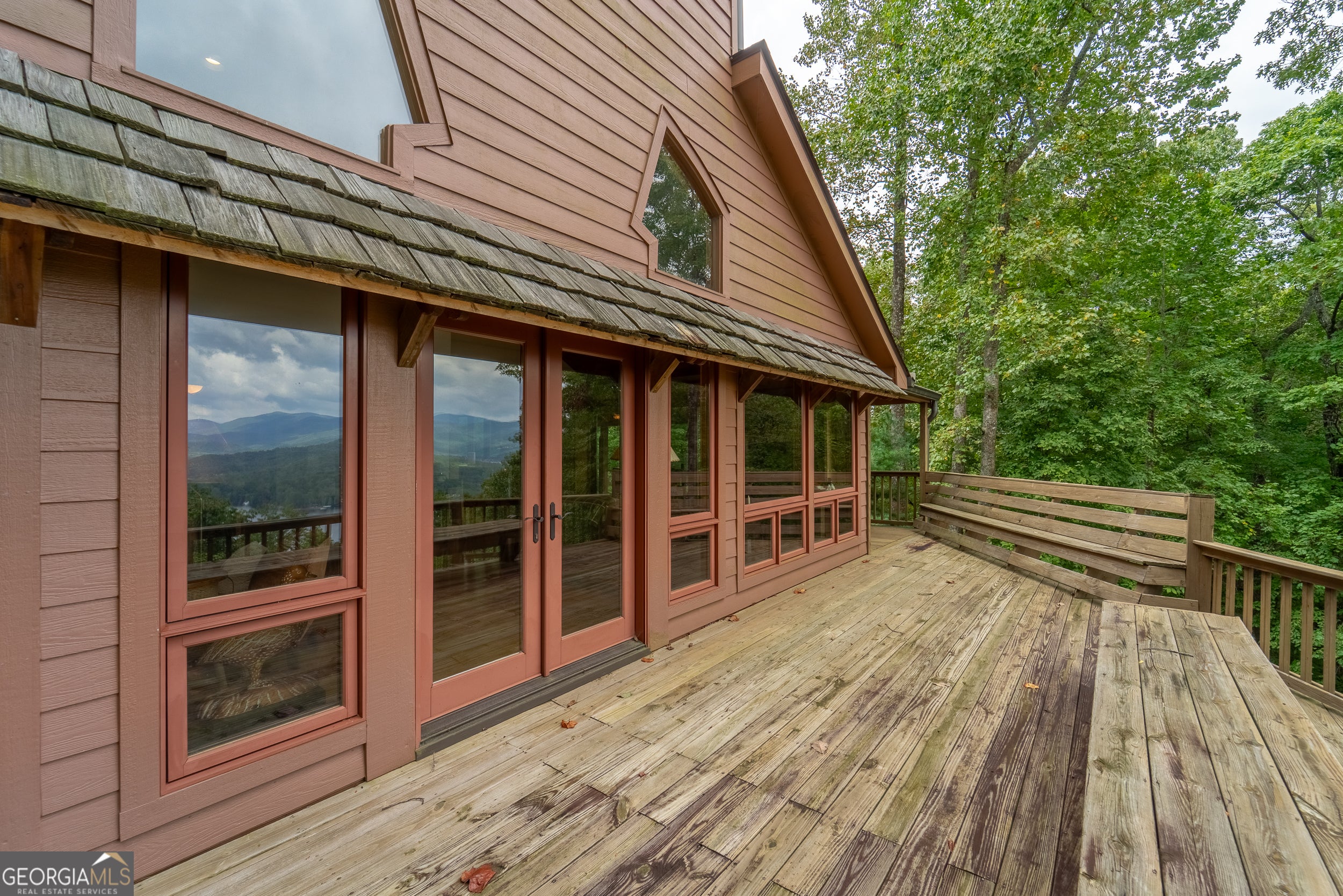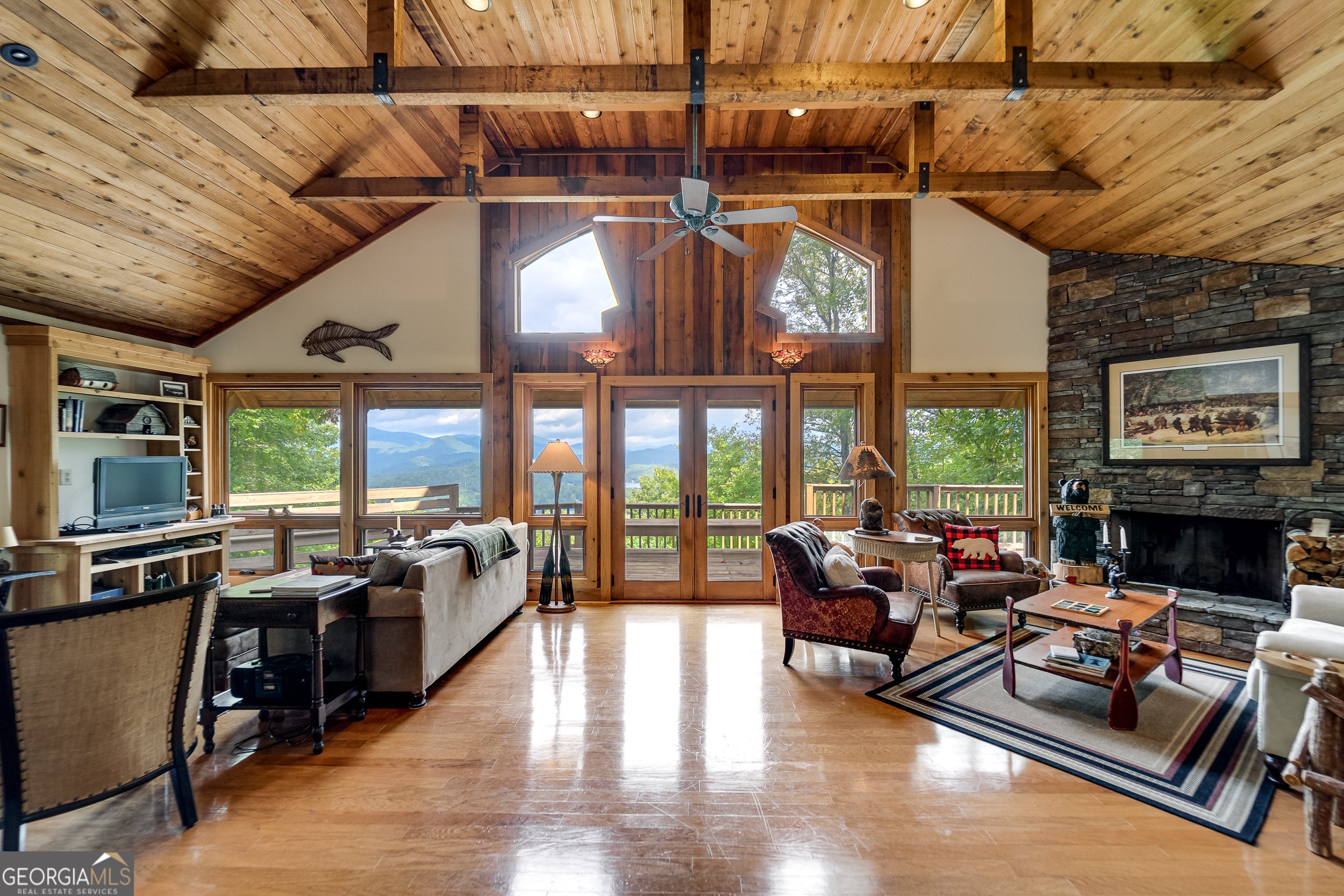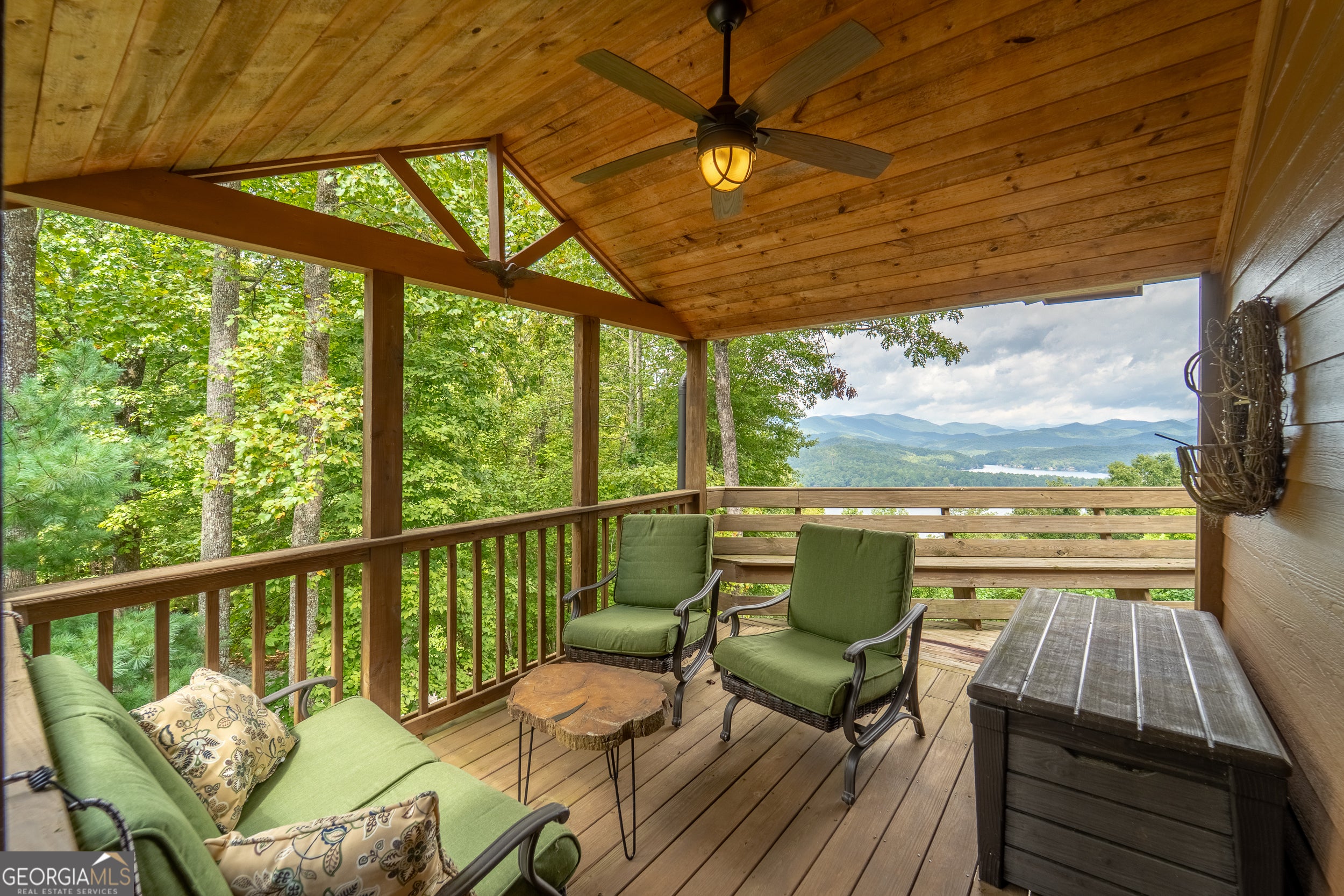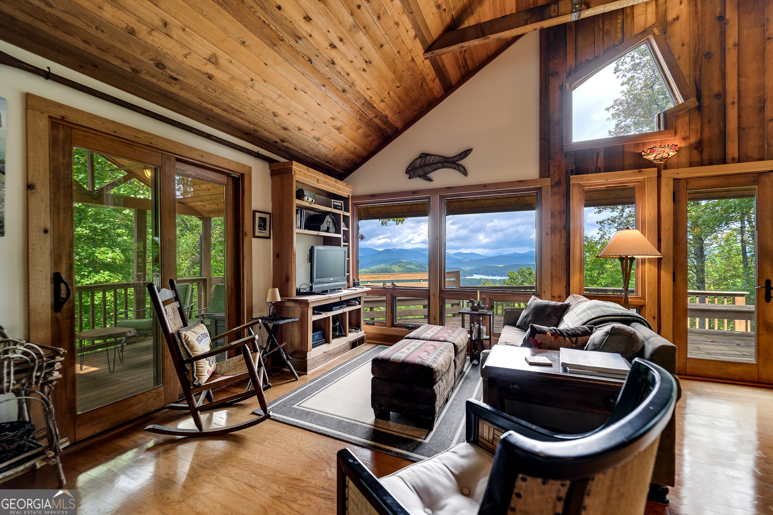 Enjoy an incredible weekend get-a-way in this 3 BR,2.5 ba mountain treehouse with majestic Lake Burton and distant mountain views. A fieldstone foyer with half bath introduces a quaint and charming living room with stacked stone fireplace, wet bar, wrap-around porch and views from every deck. The country kitchen boasts hand painted Mexican tiles, oven/range, dishwasher, double sinks, trash compactor, breakfast bar and separate dining area. Tongue and groove pine paneling throughout the house adds to the ambiance. The second floor has two guest bedrooms (one with window seat and lake views) with shared bath and hallway bunkbeds. You don't want to miss the Crow's Nest owner's suite with panoramic lake and mountain views, full bath with double vanity, river rock shower, utility closets and closet nooks. The lowest level is an outside entrance two-car garage with stack washer and dryer and outdoor shower.