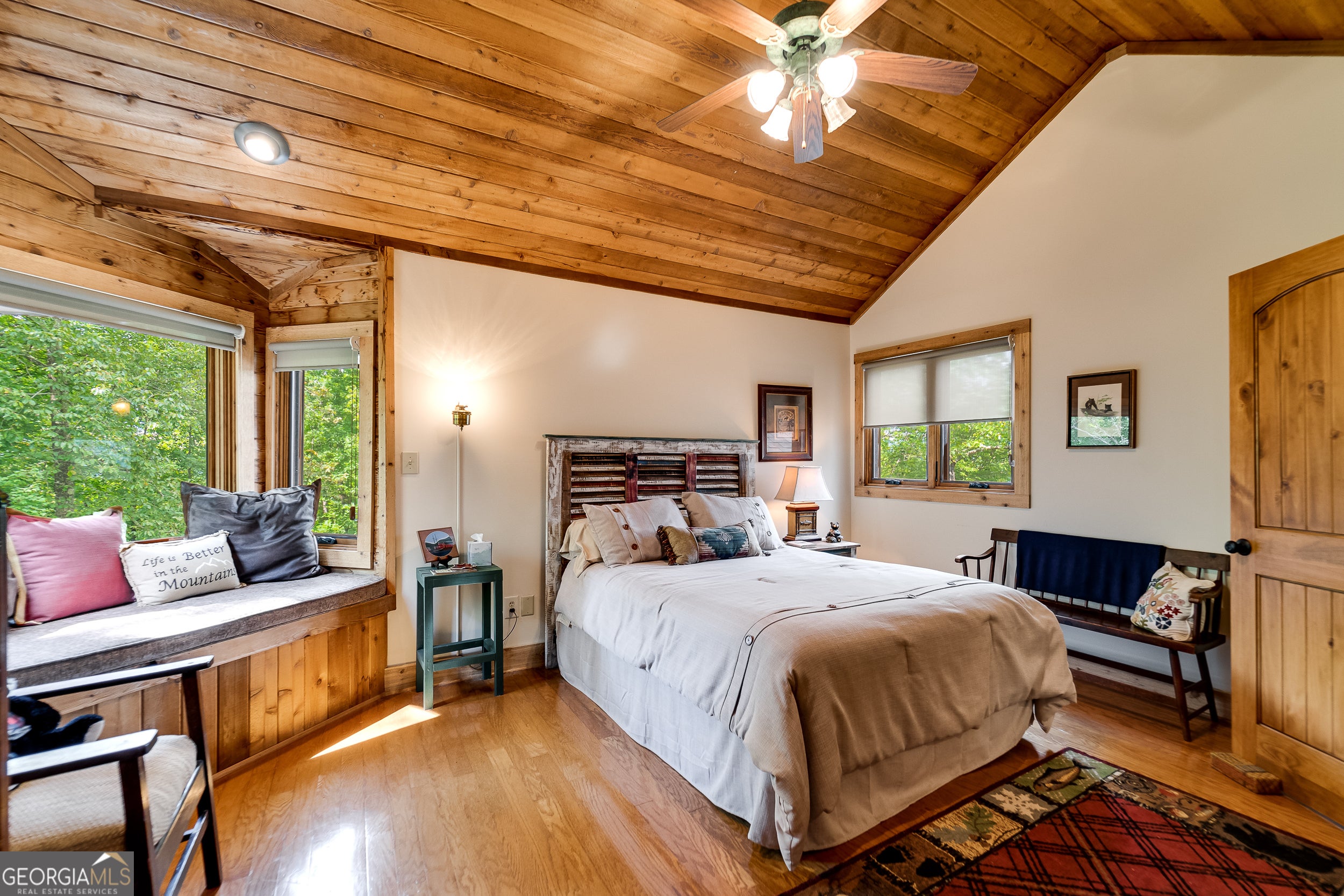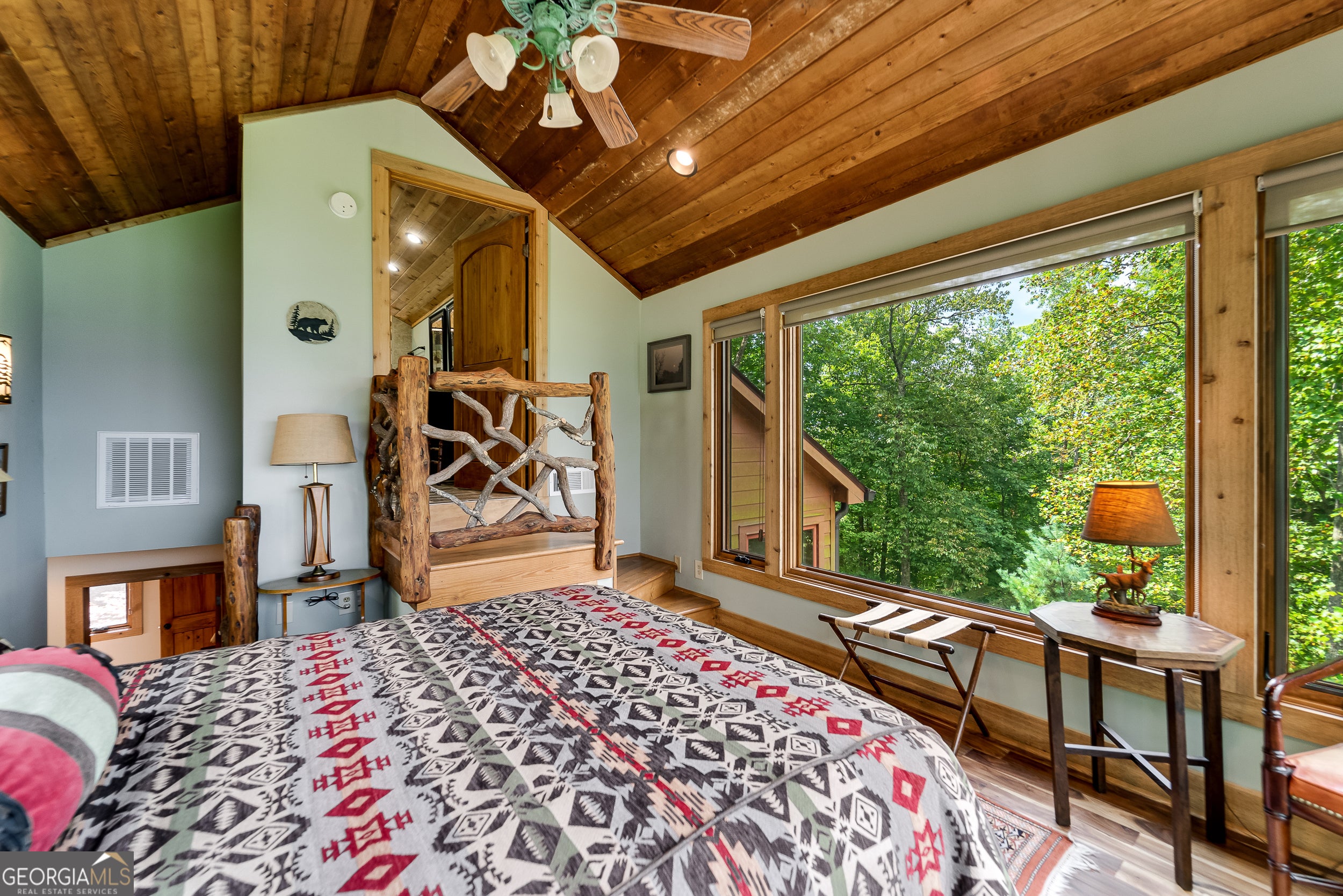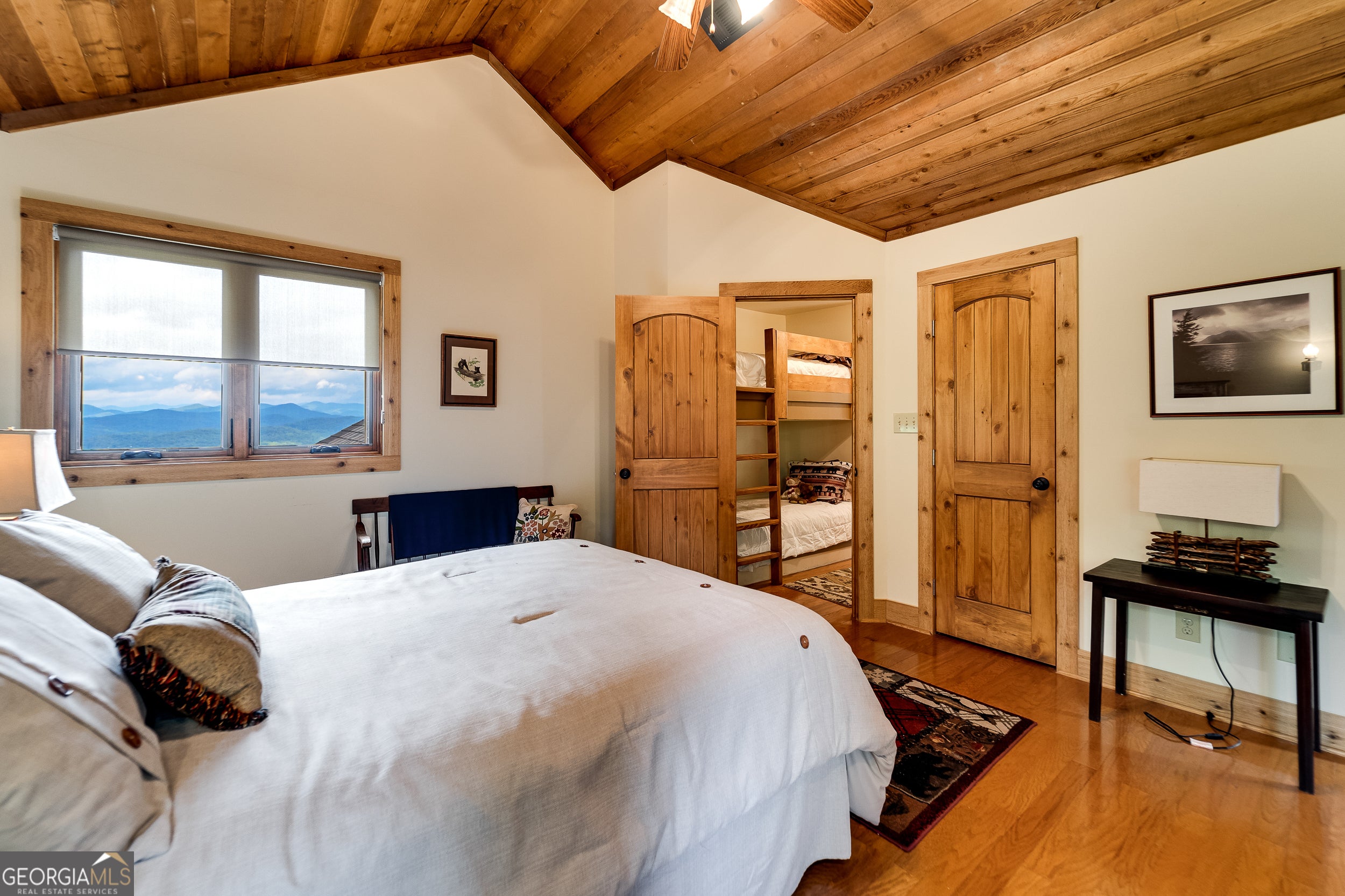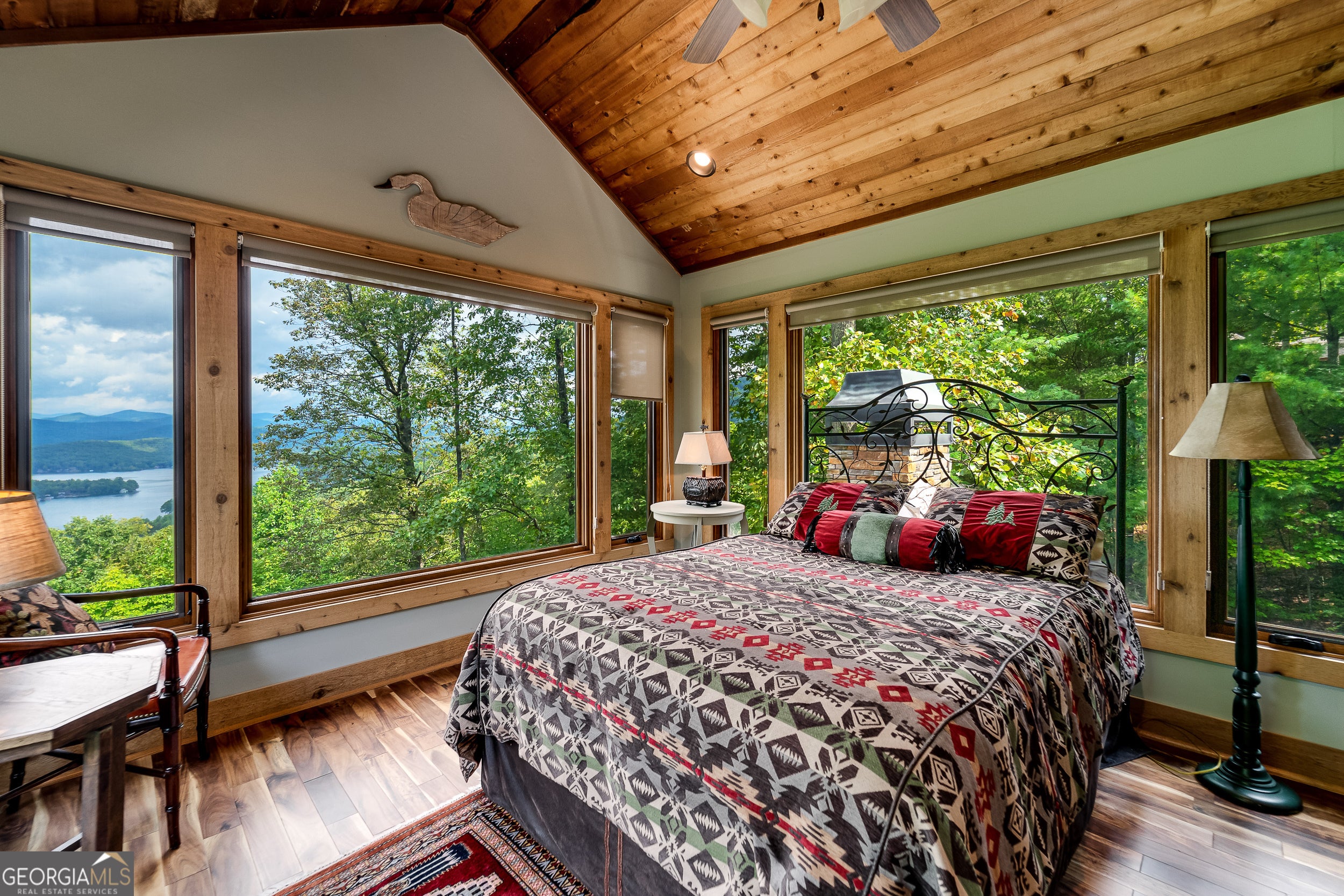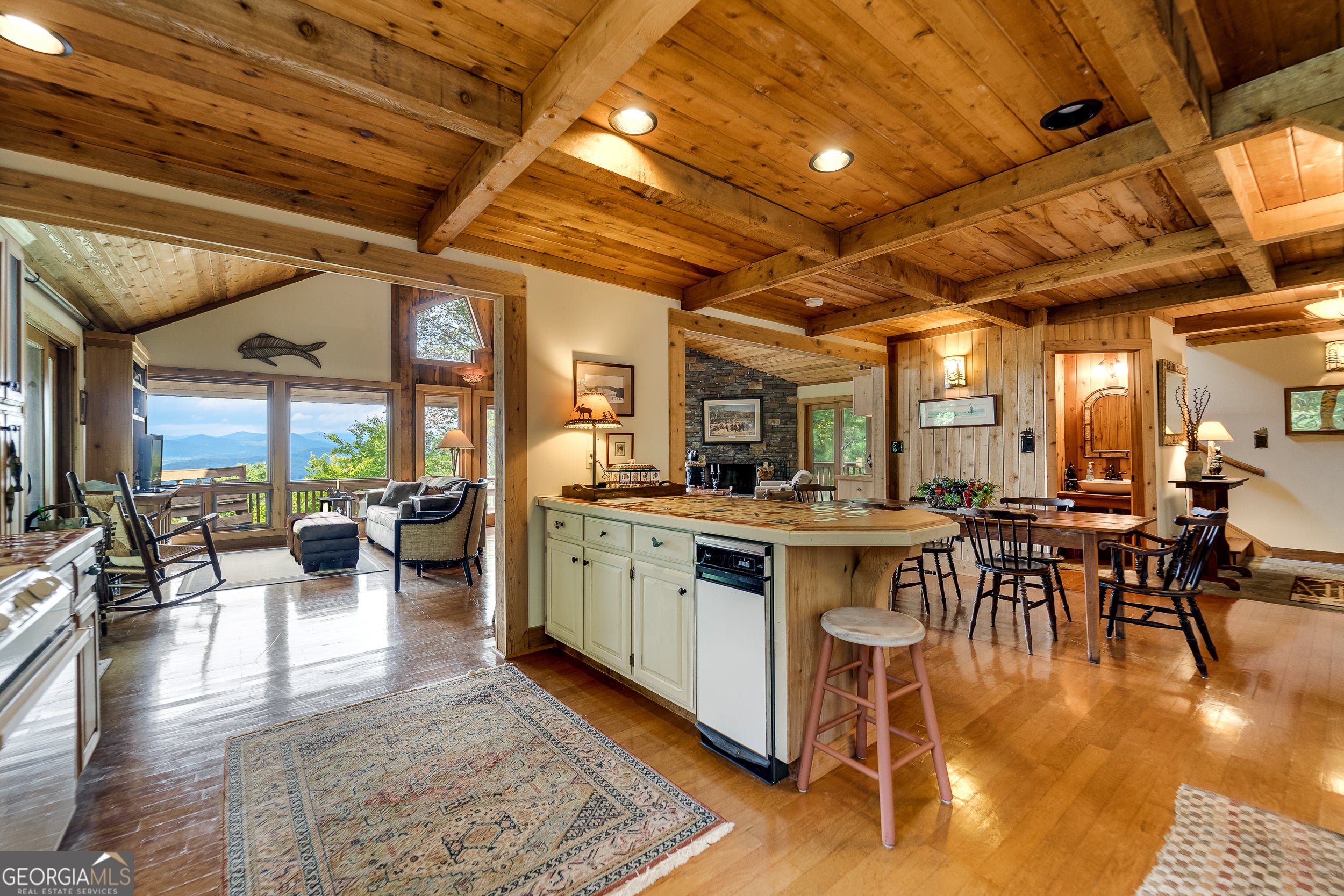 Enjoy an incredible weekend get-a-way in this 3 BR,2.5 ba mountain treehouse with majestic Lake Burton and distant mountain views. A fieldstone foyer with half bath introduces a quaint and charming living room with stacked stone fireplace, wet bar, wrap-around porch and views from every deck. The country kitchen boasts hand painted Mexican tiles, oven/range, dishwasher, double sinks, trash compactor, breakfast bar and separate dining area. Tongue and groove pine paneling throughout the house adds to the ambiance. The second floor has two guest bedrooms (one with window seat and lake views) with shared bath and hallway bunkbeds. You don't want to miss the Crow's Nest owner's suite with panoramic lake and mountain views, full bath with double vanity, river rock shower, utility closets and closet nooks. The lowest level is an outside entrance two-car garage with stack washer and dryer and outdoor shower.