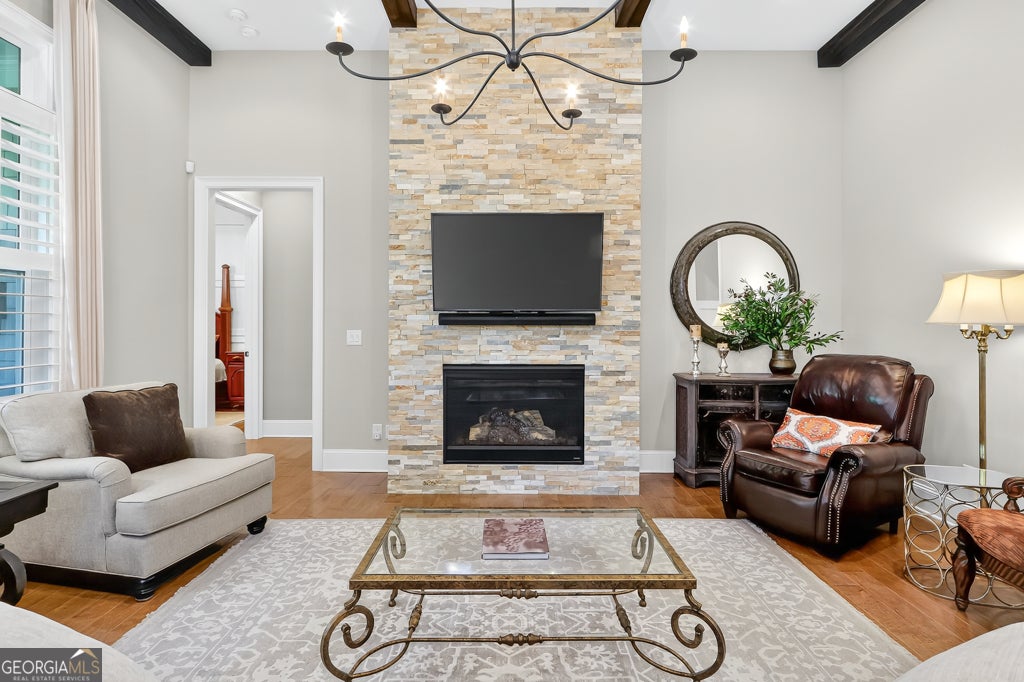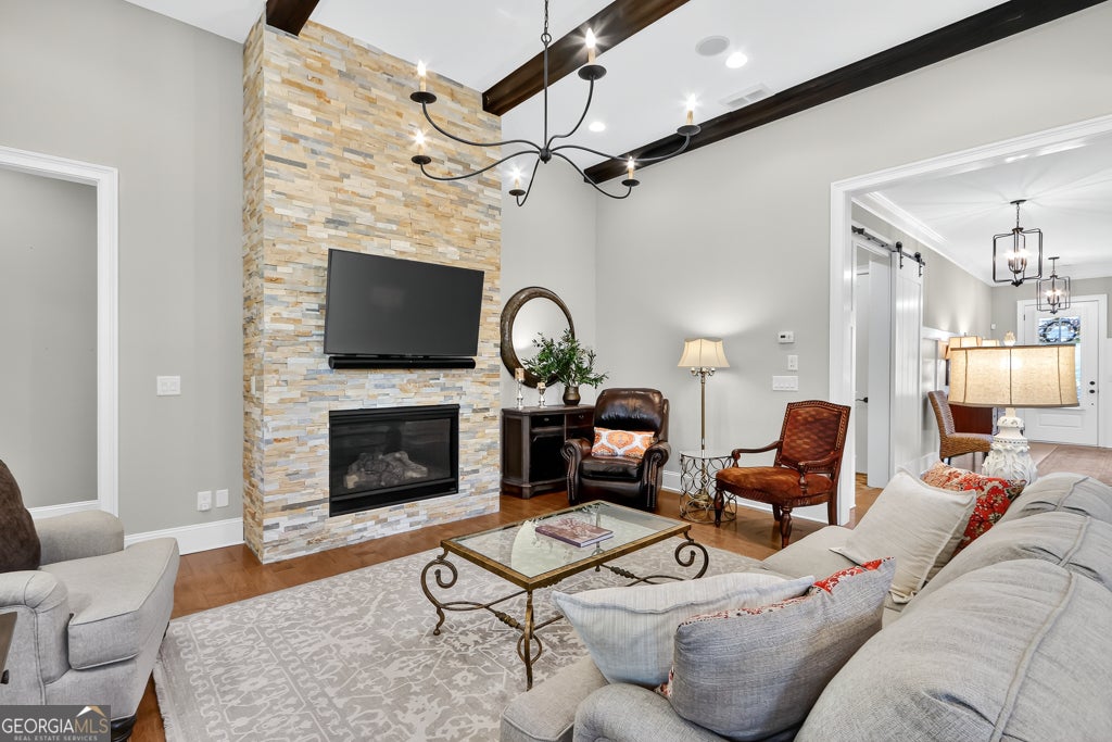 Nestled inside the gated 55+ community of Edenton, this 3-bedroom, 3.5-bath townhome offers a graceful blend of charm and comfort. From the moment you step inside, you're welcomed by a bright front room with custom built-ins, an inviting space that can serve as a home office, library, or simply a quiet spot to unwind. The heart of the home is the family room, where wood beams highlight the soaring ceiling and a striking stone fireplace brings warmth and character. Hardwood floors connect each space, leading into the kitchen where stone countertops, stainless steel appliances, and a large island make cooking and gathering effortless. The cheerful eat-in area is filled with light, perfect for everyday meals or weekend brunch. Upstairs, the primary suite is a retreat of its own. The spa-like bath offers dual vanities, a soaking tub, and a walk-in shower, while the built-in closet organization keeps everything neatly in place. Just beyond the bedrooms, a generous common area with built-ins offers flexible space for reading, studying, or simply relaxing. A covered patio extends your living space outdoors, ideal for morning coffee or evenings with friends. Beyond your doorstep, Edenton welcomes you with a pocket park, a cozy outdoor fireplace, and intimate seating nooks, all tucked within the privacy of a gated community designed for active adults. Bright, airy, and move-in ready, this townhome is filled with thoughtful details that make everyday living feel both easy and special.