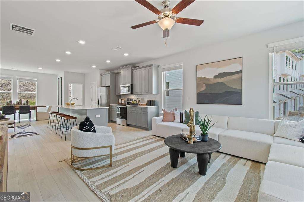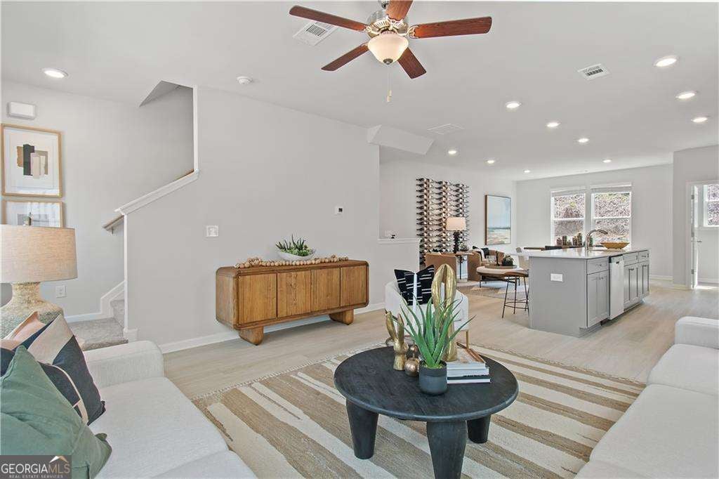Discover this impressive three-story townhome featuring 3 bedrooms and 3.5 baths, plus a spacious game room perfect for entertaining. The ground level includes a large game room, a half bath, and access to a covered back patio. On the second level, enjoy a beautifully designed kitchen with ample cabinetry, a large island, Quartz countertops, a tile backsplash, and a full suite of stainless-steel appliances. The kitchen overlooks the breakfast and family rooms, making it ideal for gatherings, and there's a convenient powder room on this level. The third floor is your private retreat, with a roomy Owner's suite featuring tray ceilings, dual walk-in closets, and a luxurious spa-like bathroom with a double vanity. Two additional spacious bedrooms, pre-wired for ceiling fans, and a full bathroom are also on this level. The laundry area includes a washer and dryer. Additional features include a one-car garage with an opener, a one-car parking pad, and window screens and blinds throughout. Conveniently located just 2.5 miles from the airport, 9 minutes from downtown Atlanta, and 12 minutes from the College strip and Mercedes-Benz Stadium. You'll also be close to the future Aerotropolis and Airport City, with excellent access to major highways, Marta, and the Atlanta Beltline Eastside Trail. Monticello offers luxury townhome living with a low-maintenance lifestyle. *Photos are representative and may not reflect the actual townhome being built.* Please note: If the buyer is represented by a broker/agent, DRB REQUIRES the buyer's broker/agent to be present during the initial meeting with DRB's sales personnel to ensure proper representation.