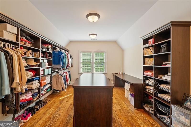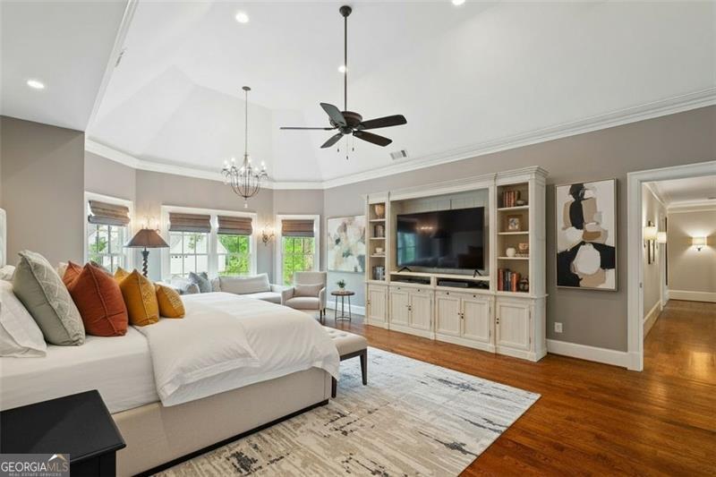 - Interior FeaturesHigh Ceilings, Bookcases, Double Vanity, Tray Ceiling(s), Wet Bar, Walk-In Closet(s), Pulldown Attic Stairs