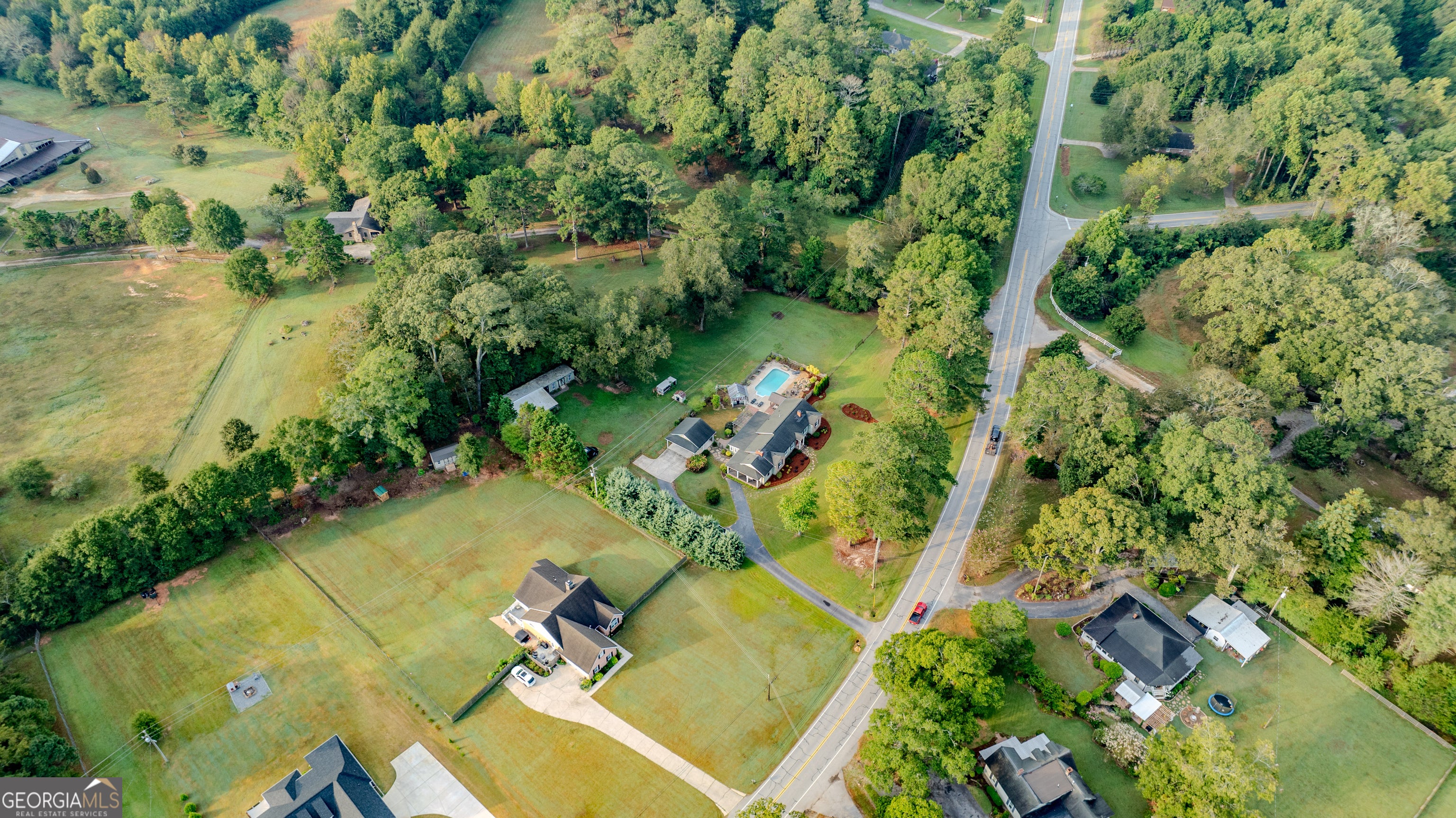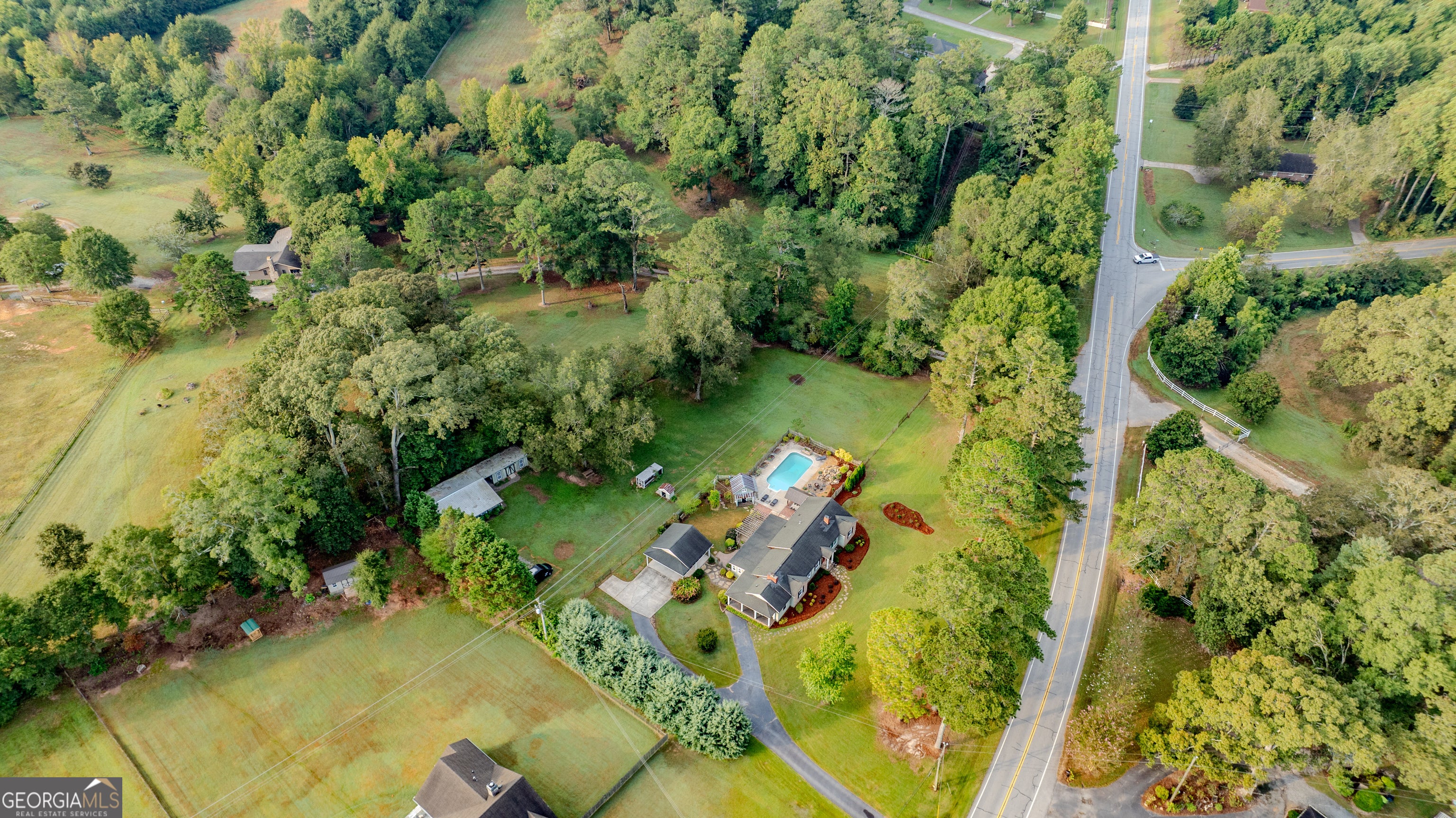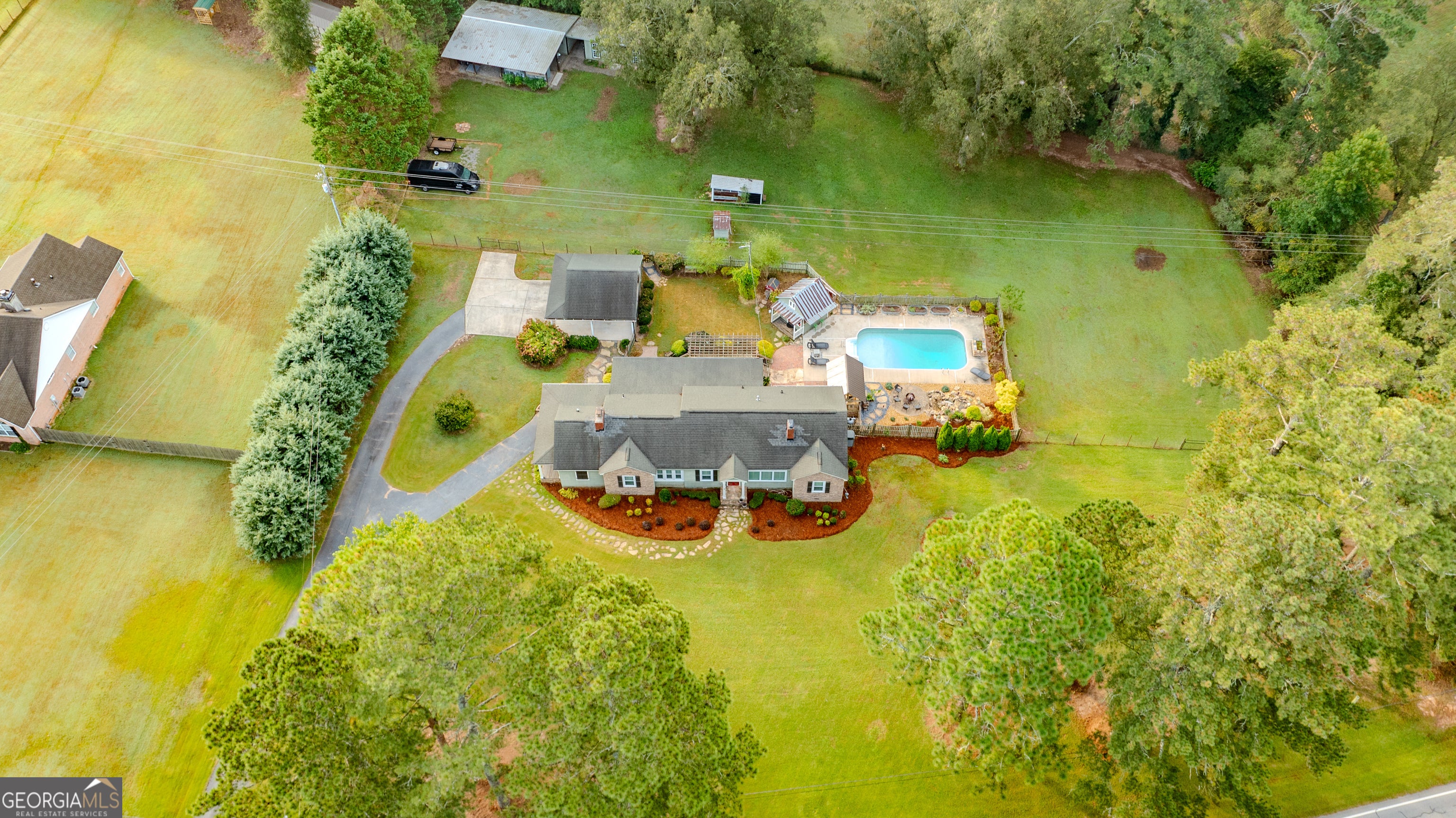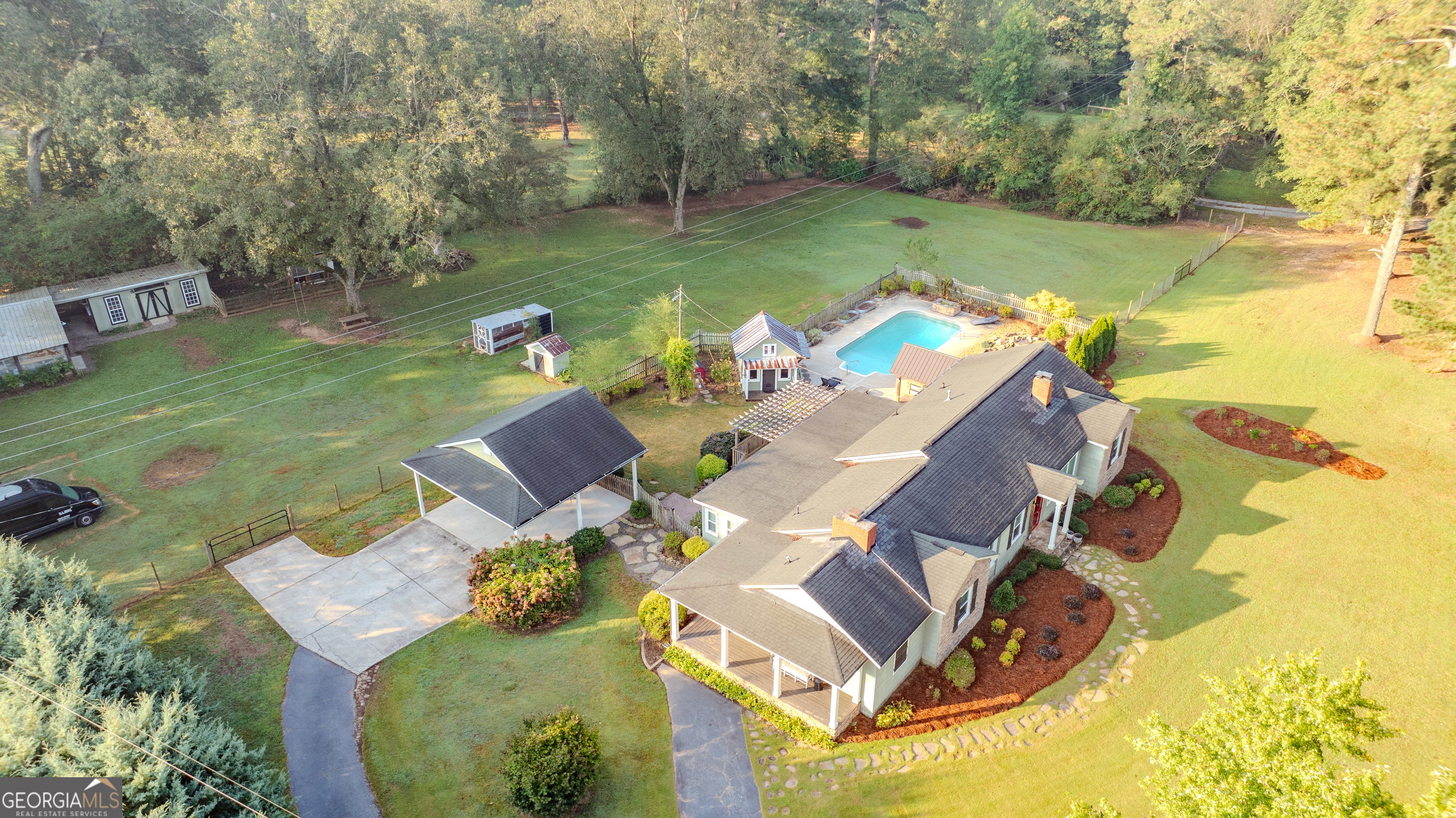 NEW ROOF! NEW SEPTIC SYSTEM! BEAUTIFUL FARMHOUSE WITH A POOL ON A SPACIOUS AND PRIVATE TWO-ACRE LOT. Gorgeous hardwood floors, plantation shutters, updated kitchen with marble countertops, new appliances and fixtures, beautiful cabinets, large island, coffee nook, living room with brick fireplace, built-in bookshelves, separate dining room with built-in china cabinet, glass transoms, beadboard ceilings, big den w/ lovely natural light, powder room with laundry in hall. Roomy master bedroom with brick, wood-burning fireplace, exposed beams, fantastic master bath with walk-in tiled shower, soaking tub, walk-in closet with built-ins, private entrance to wrap around porch. Split bedroom plan with nice-sized bedrooms. Screened porch off back foyer entrance. New 6mil moisture plastic barrier in the crawl space. Foam insulation in crawl space and in the attic. All windows are new energy saving windows. Backyard oasis with back deck with pergola, 16 x 32 pool, outdoor kitchen, pool house, speakers, outdoor shower, fire pit area, waterfall, fenced backyard, chicken coops, kennel, workshop, with power (240 amp), barn with stables, storage space, ample parking for RV. Enjoy life in the country while being close enough to downtown Newnan, Ashley Park and I-85.