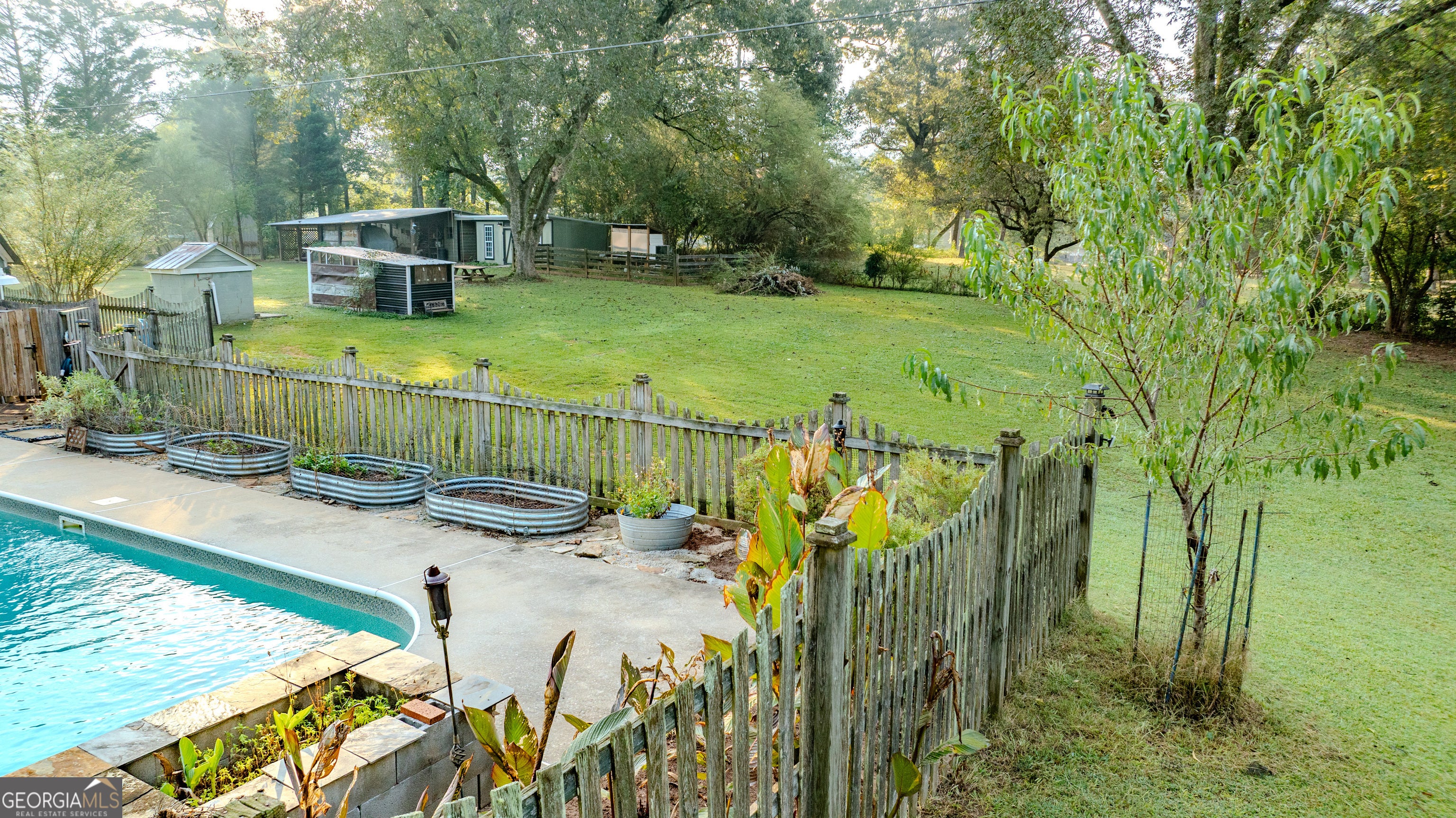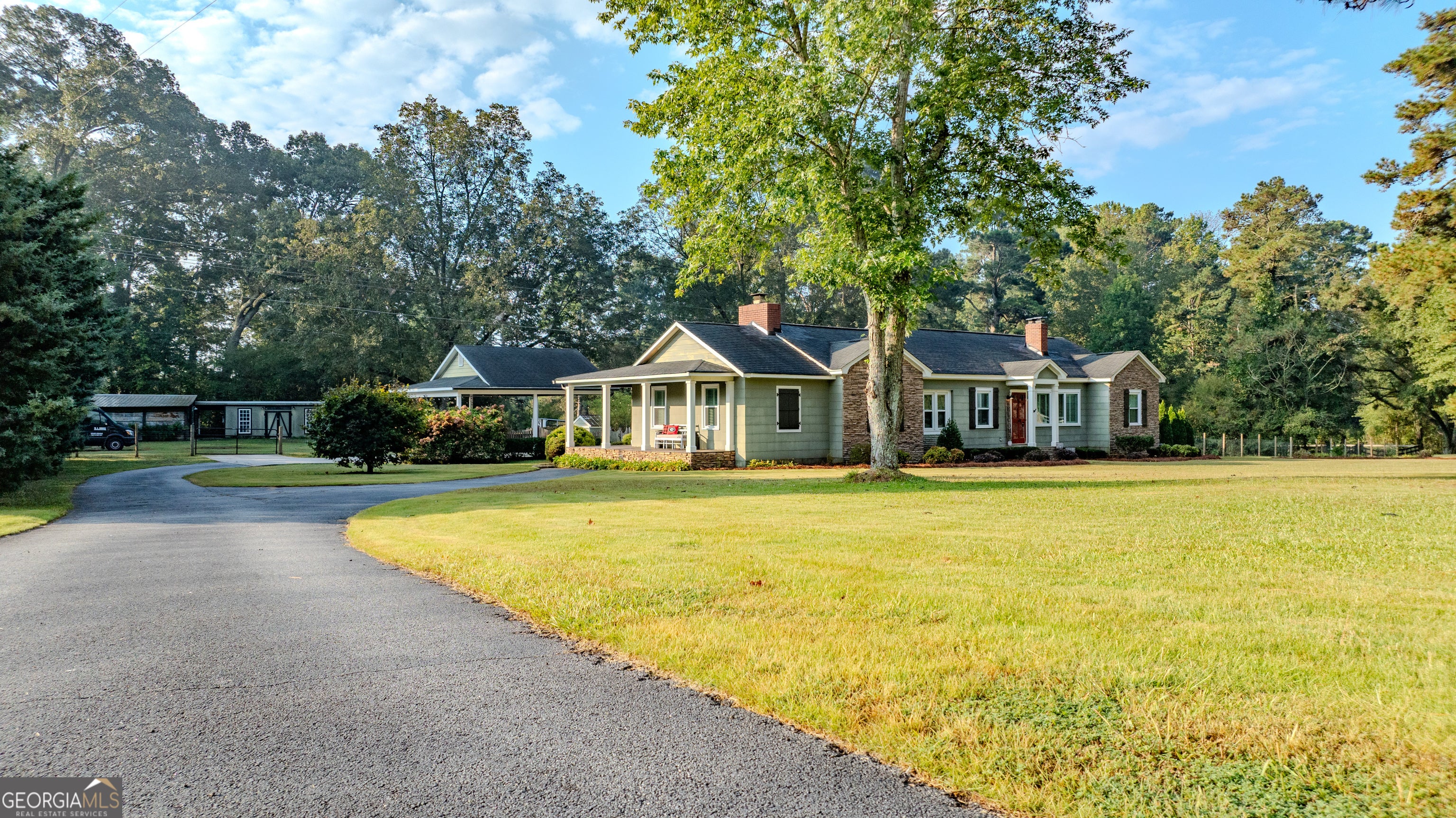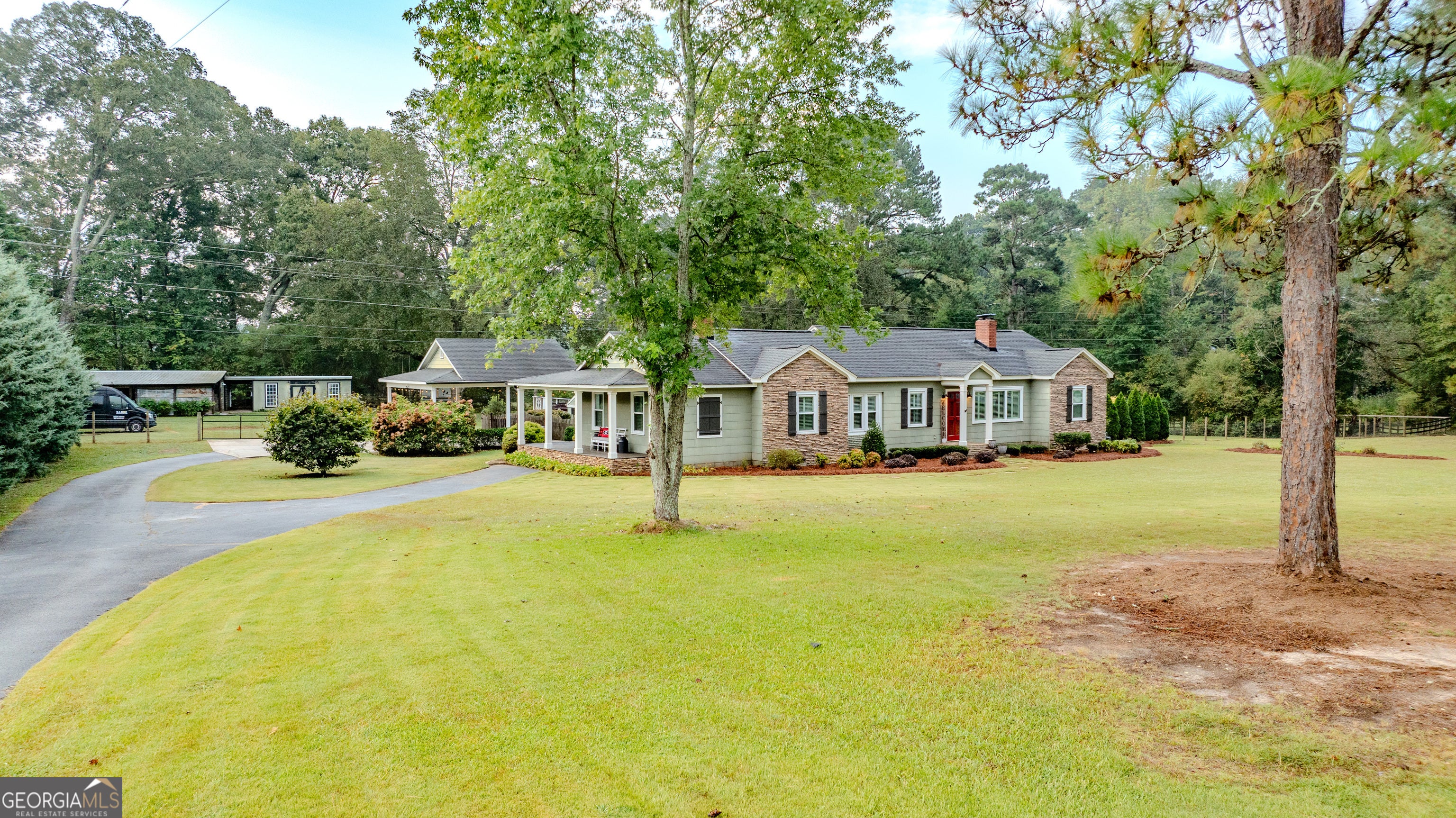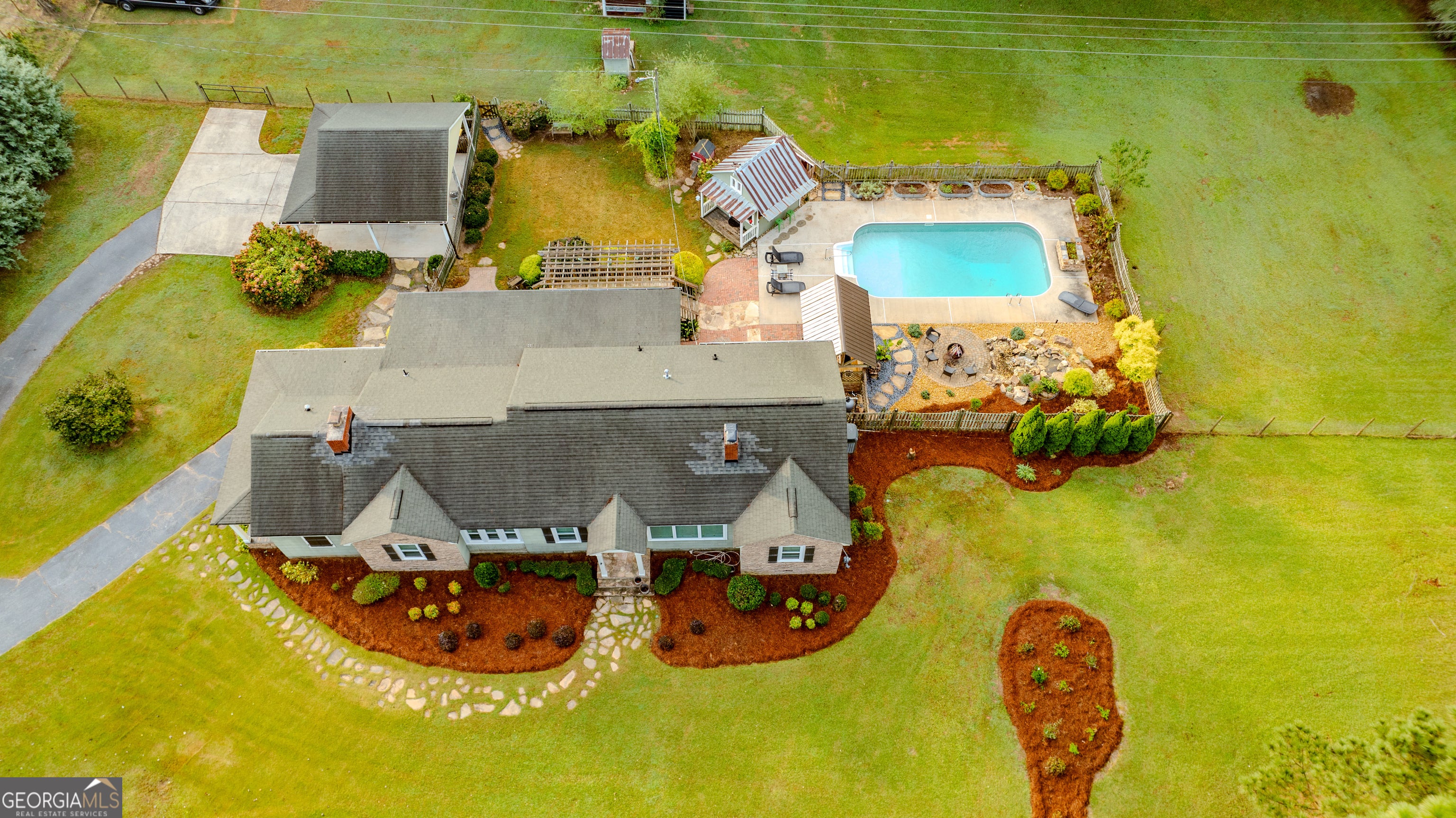 NEW ROOF! NEW SEPTIC SYSTEM! BEAUTIFUL FARMHOUSE WITH A POOL ON A SPACIOUS AND PRIVATE TWO-ACRE LOT. Gorgeous hardwood floors, plantation shutters, updated kitchen with marble countertops, new appliances and fixtures, beautiful cabinets, large island, coffee nook, living room with brick fireplace, built-in bookshelves, separate dining room with built-in china cabinet, glass transoms, beadboard ceilings, big den w/ lovely natural light, powder room with laundry in hall. Roomy master bedroom with brick, wood-burning fireplace, exposed beams, fantastic master bath with walk-in tiled shower, soaking tub, walk-in closet with built-ins, private entrance to wrap around porch. Split bedroom plan with nice-sized bedrooms. Screened porch off back foyer entrance. New 6mil moisture plastic barrier in the crawl space. Foam insulation in crawl space and in the attic. All windows are new energy saving windows. Backyard oasis with back deck with pergola, 16 x 32 pool, outdoor kitchen, pool house, speakers, outdoor shower, fire pit area, waterfall, fenced backyard, chicken coops, kennel, workshop, with power (240 amp), barn with stables, storage space, ample parking for RV. Enjoy life in the country while being close enough to downtown Newnan, Ashley Park and I-85.
