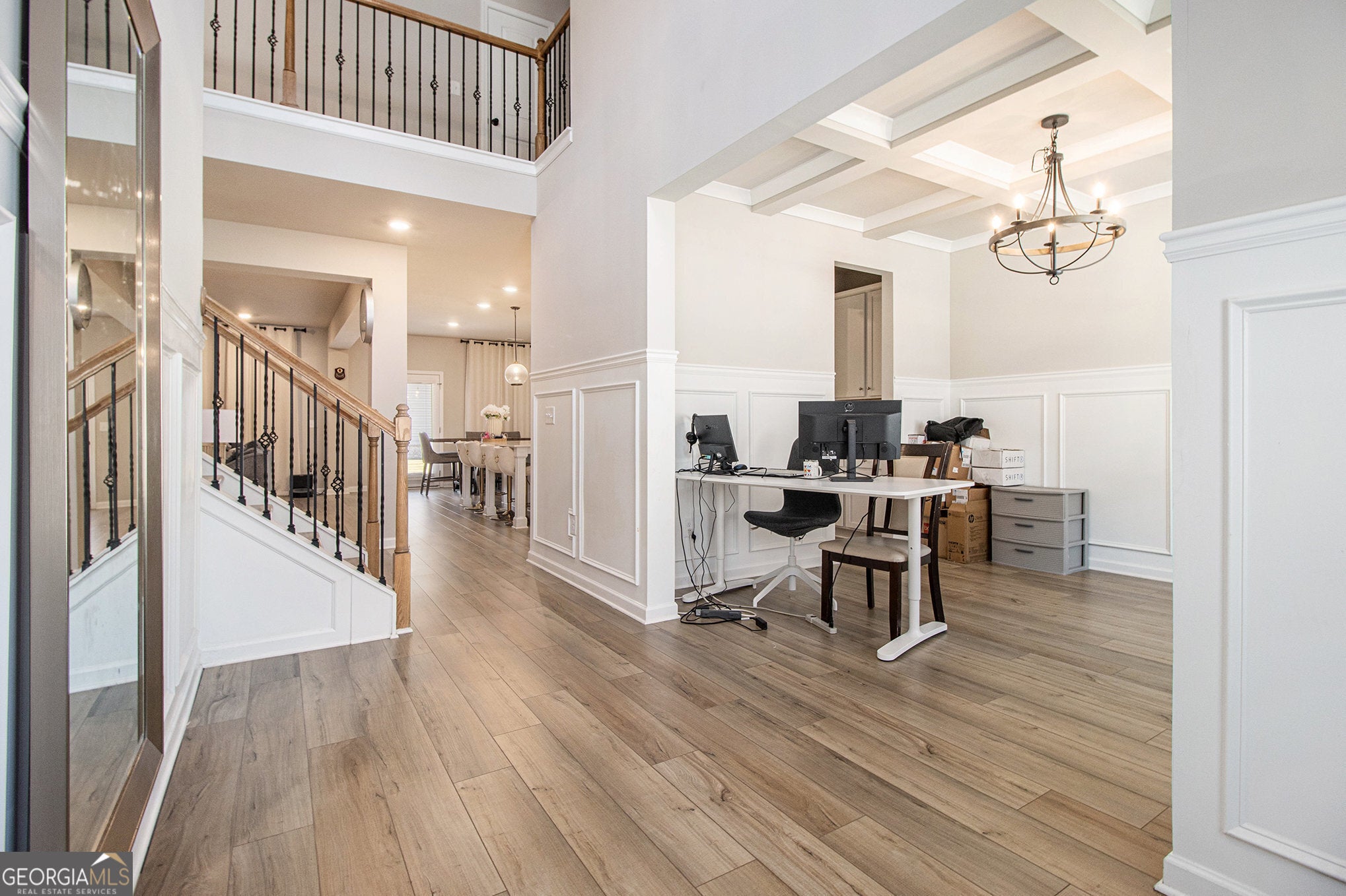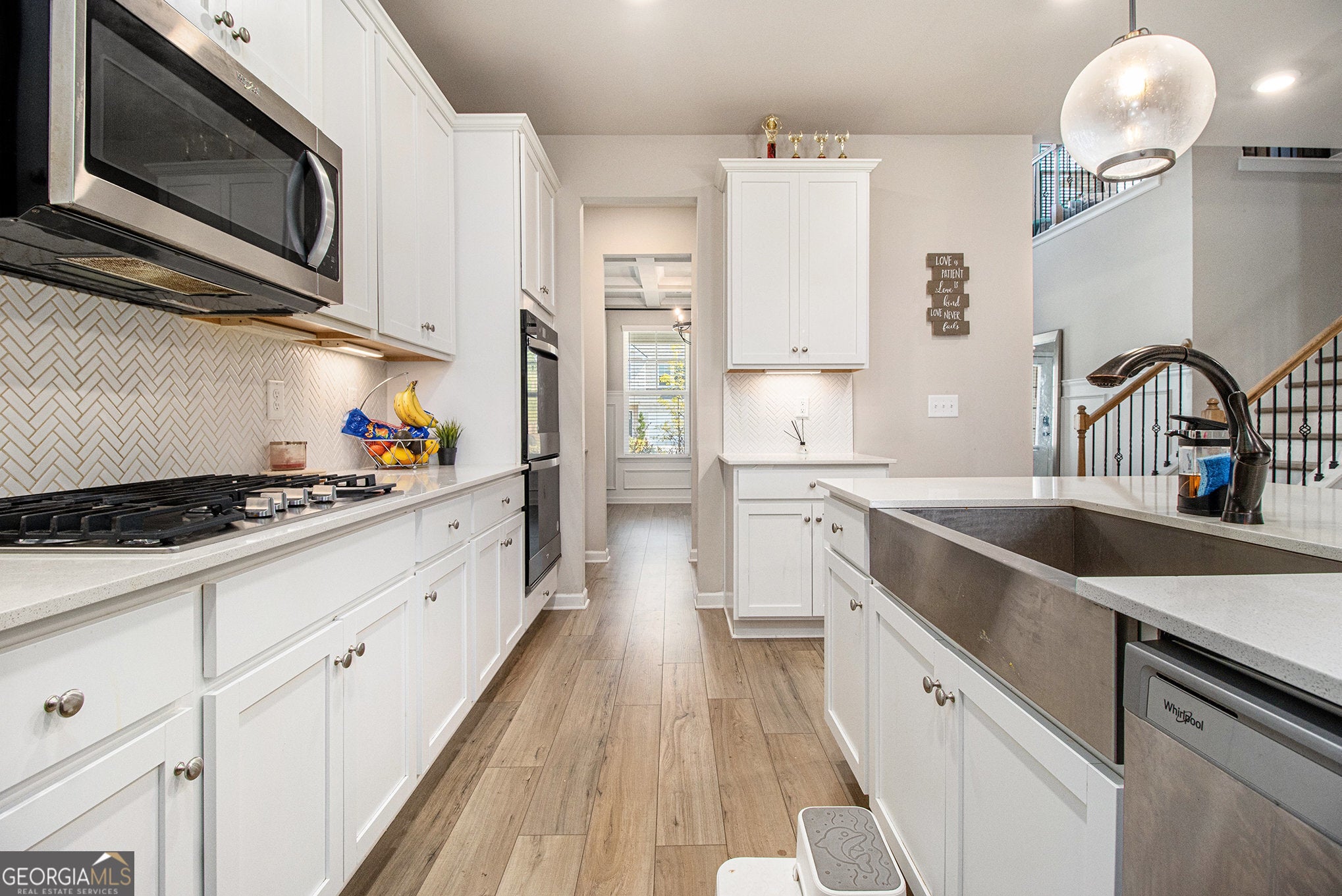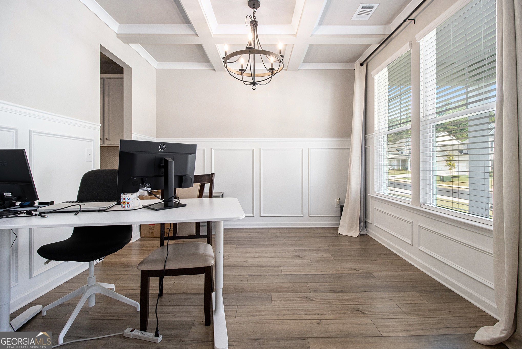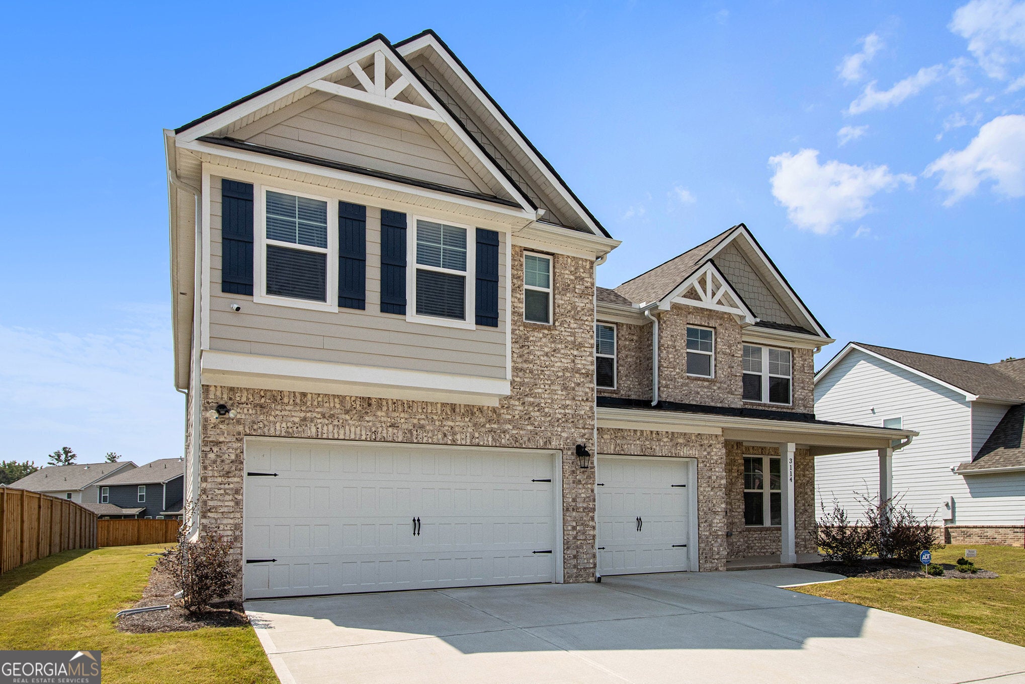 Step into sophistication with this LIKE-NEW Rosemary II floor plan, a stunning brick-front Craftsman-style home located in the prestigious Twins Shoals community. This exquisite residence boasts 5 bedrooms, 4.5 baths, and a spacious 3-car garage, along with numerous premium upgrades designed for both elegance and comfort. A dramatic two-story foyer with picture-frame molding sets the tone upon entry, leading you into an expansive open-concept great room and dining area. Impressive architectural details-majestic columns, coffered ceilings, and 2" faux wood blinds-add a refined touch throughout. At the heart of the home, the gourmet kitchen is a true chef's dream, featuring stainless steel appliances, an oversized island, a farmhouse sink, double ovens, quartz countertops, a walk-in pantry, a butler's pantry, and beautiful tile backsplash, all surrounded by abundant white cabinetry for optimal storage. Luxury vinyl plank flooring extends throughout the main level, enhancing the home's seamless flow and modern appeal. The formal dining room elevates every occasion with its elegant coffered ceiling and detailed trim work. A private guest suite on the main floor includes its own bath and walk-in closet-perfect for visitors or multi-generational living. Upstairs, a versatile loft offers additional living or entertaining space. The owner's suite is an indulgent retreat featuring a sitting area, vaulted ceilings, an oversized walk-in closet, and a spa-like bath with dual vanities, a soaking garden tub, and a fully tiled walk-in shower with ceramic flooring. Outdoors, enjoy a generous covered patio with a ceiling fan-ideal for creating a serene backyard oasis for gatherings or relaxation. Twins Shoals offers a private, tranquil setting in highly desirable South Fulton with easy access to I-285, Hartsfield-Jackson Airport, and Camp Creek Marketplace's shopping and dining options. Downtown Atlanta is just 25 minutes away, making this home the perfect blend of luxury, convenience, and lifestyle.