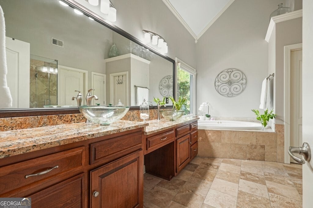 - Interior FeaturesHigh Ceilings, Pulldown Attic Stairs, Separate Shower, Soaking Tub, Vaulted Ceiling(s), Walk-In Closet(s)