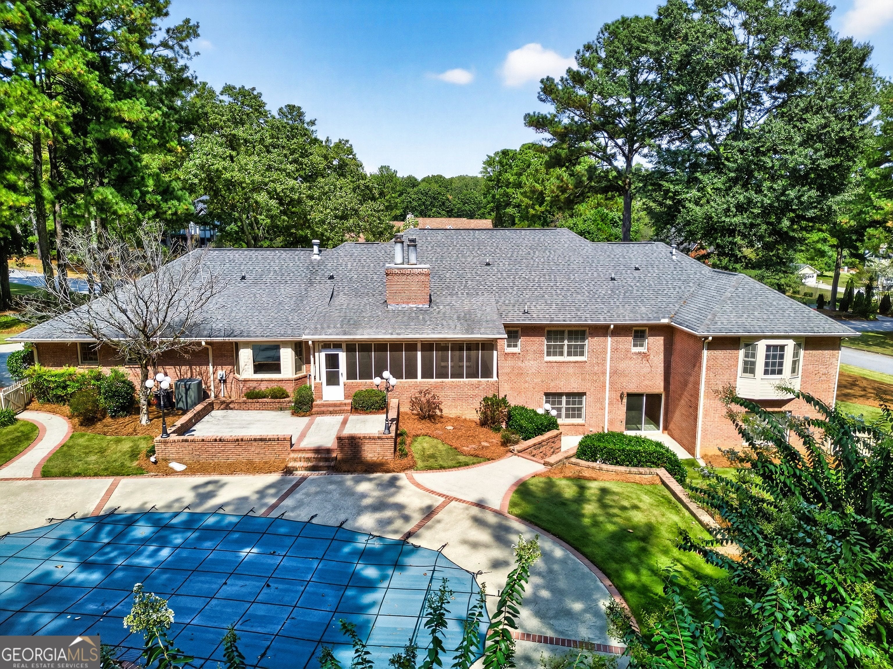 A true Estate in every sense, this all-brick, sprawling ranch offers elegance, scale, and comfort on a prominent corner lot with circular driveway. Designed for gracious living and unforgettable entertaining, this home blends timeless architecture with resort-style amenities. Four oversized bedrooms on main level, including serene owner's suite. Grand formal living and dining room, ideal for hosting gatherings large or small. Inviting family room with vaulted ceilings, wood beams and brick fireplace. Bright functional kitchen with seamless flow to entertain. Oversized laundry room and mudroom with abundant storage. Relaxing screened in porch overlooking the estate grounds. The finished terrace level is the ultimate entertainment hub. Sprawling area with fireplace and bar, two additional bedrooms and private office. Rich wood-paneled finishes for timeless character. Generous unfinished areas for storage or customization, and easy walk-out to access the beautiful grounds. DID I MENTION THERE IS A WALK-UP ATTIC (UNFINISHED!) Step outside to your backyard oasis built for entertaining: A beautiful tiled Gunite pool with spa, perfectly paired with an expansive patio for lounging and entertaining. A dedicated pool house with restroom, makes this retreat as functional as it is luxurious. This home has been well taken care of. The crawl area has new vapor barrier and new humidifier. THIS PROPERTY IS MORE THAN A HOME- IT'S AN ENTERTAINERS DREAM ESTATE. WITH SO MUCH IN THIS BEAUTY, THE BEST WAY TO APPRECIATE IS COME SEE IT FOR YOURSELF TODAY AND ADD YOUR PERSONAL TOUCH! THEY DONT BUILD THEM LIKE THIS ANYMORE!!!!!!!! This home comes with a transferable lifetime warranty from ALL AMERICAN WATERPROOFING BRAND NEW ROOF JUST INSTALLED AND NEW GUTTERS