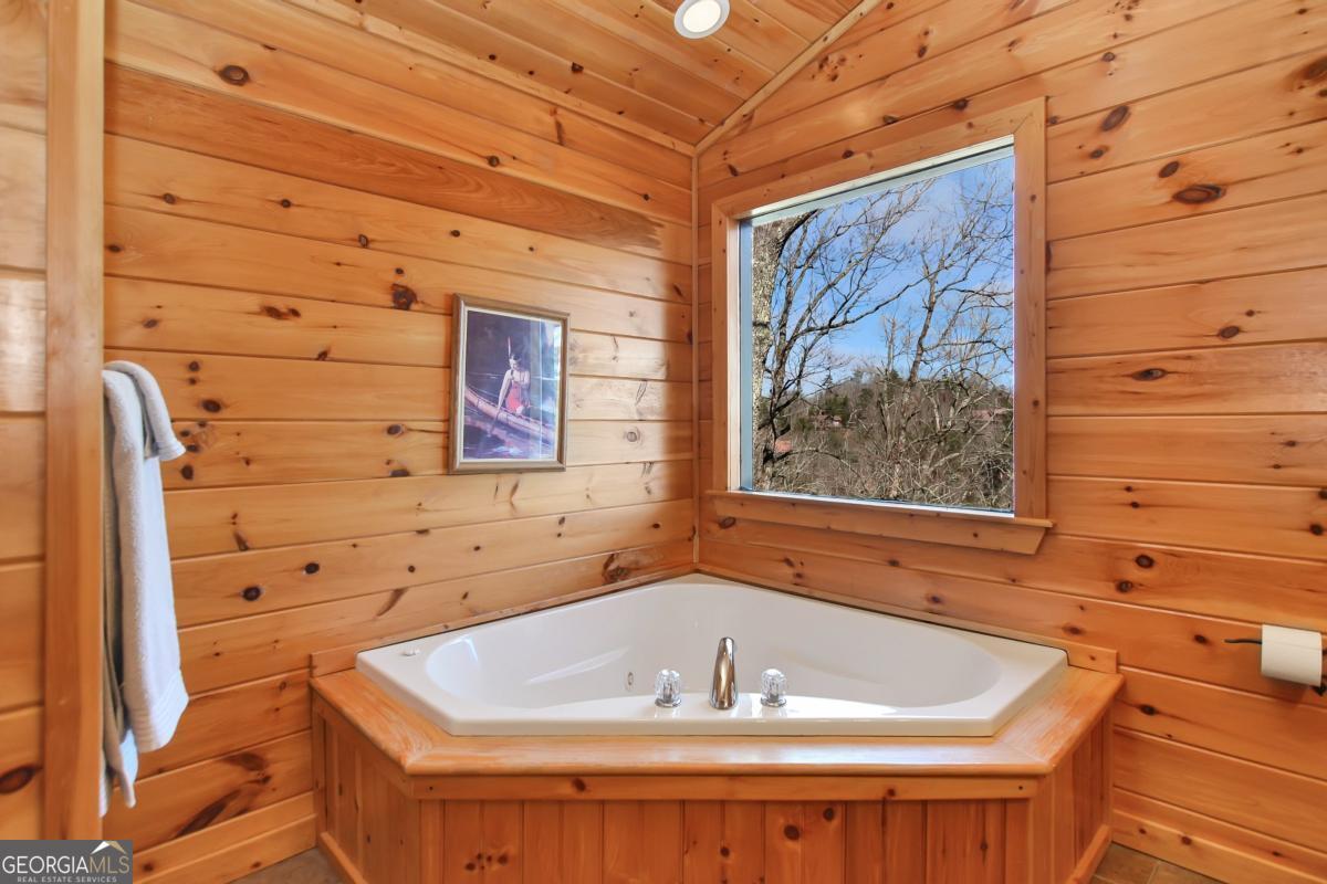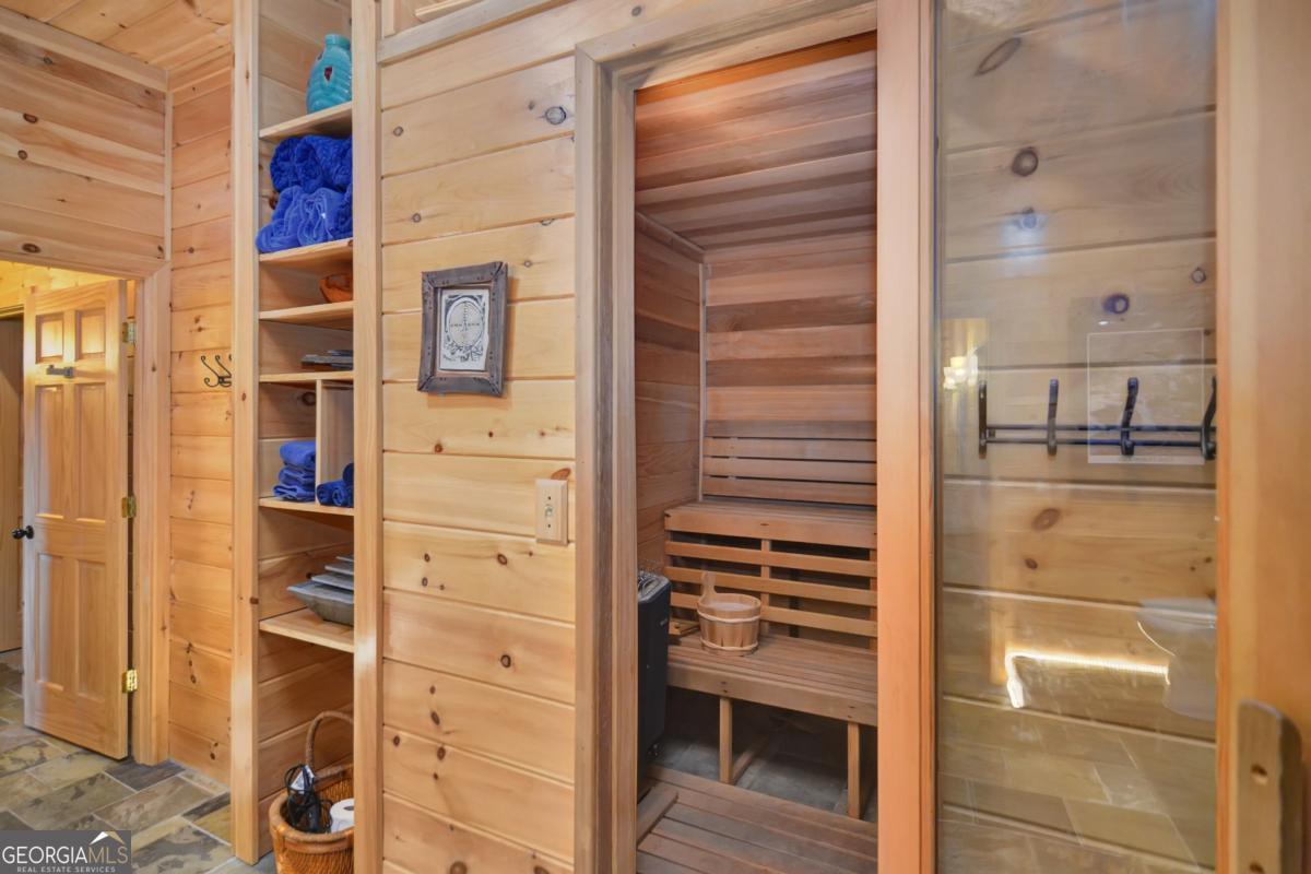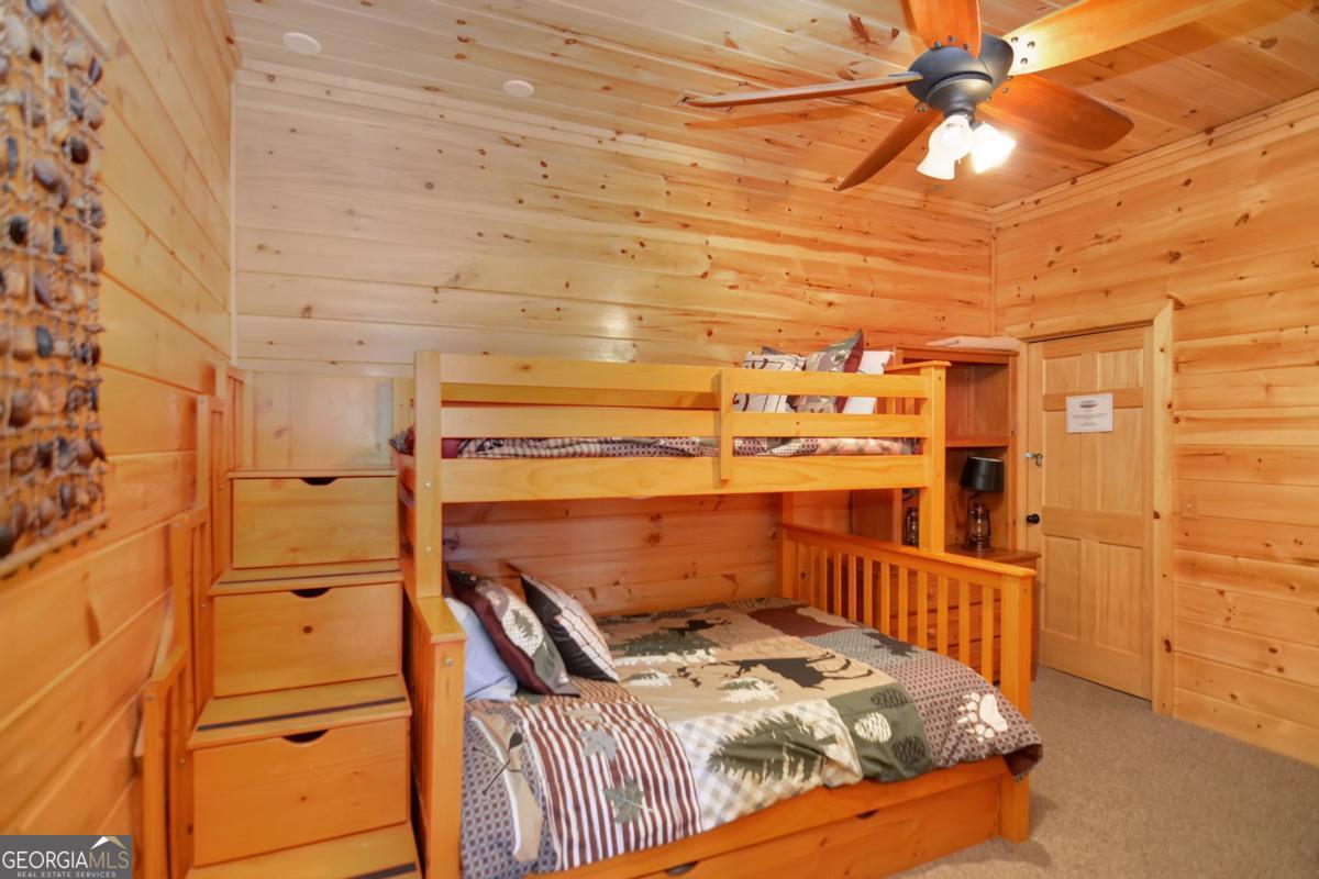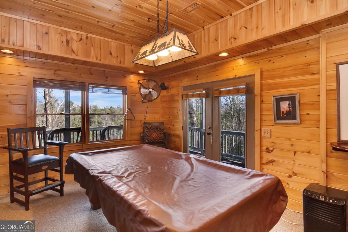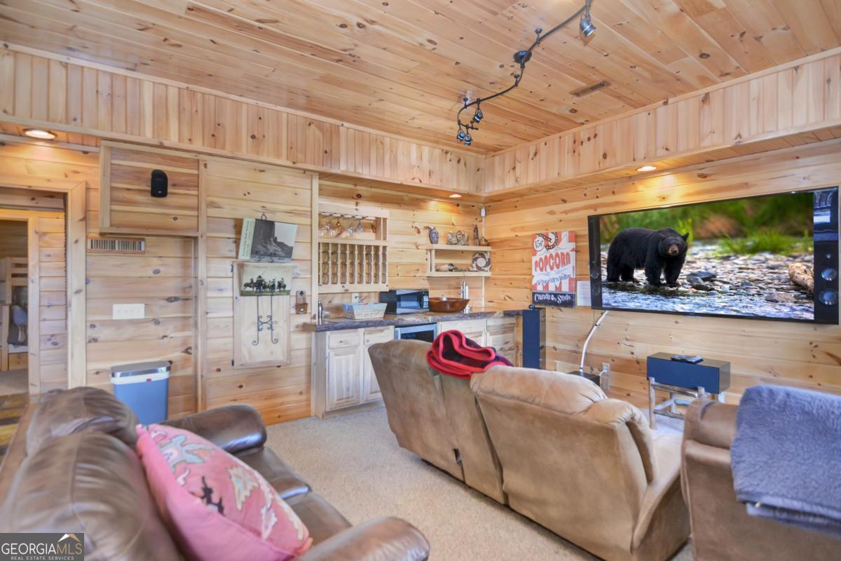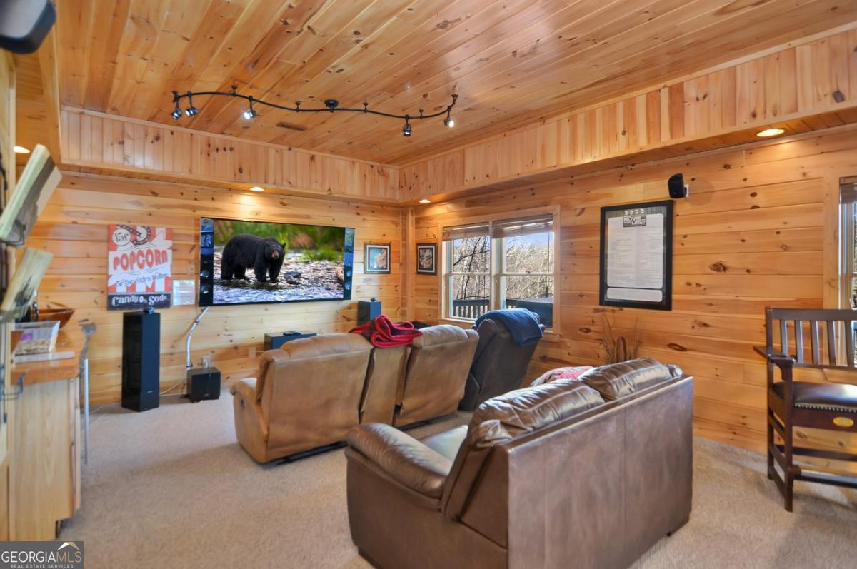 Welcome to The Grin Inn Bear It Lodge in the sought-after Mountain Tops of Blue Ridge! This stunning prow-front cabin checks every box-paved community roads, high-speed internet, and ONLY THREE MILES from the boutiques and dining of downtown Blue Ridge. NEW ROOF + BRAND NEW HOT TUB! Currently an active short-term rental with excellent annual income, this lodge is being sold fully furnished and turn-key-ready for both investors and families looking for a mountain retreat. Inside, the open concept great room, gourmet kitchen, and dining area flow seamlessly together, creating a warm and inviting gathering space. The chef's kitchen boasts stainless steel Jenn-Air appliances, a large center island, and custom cabinetry. With four spacious bedrooms-including two master suites-three full baths, and a convenient half bath on the main level, there's room for everyone. Downstairs is an entertainer's dream: a private home theater with 80" flat screen, surround sound, reclining seating, and a professional pool table, plus a wet bar and wine cooler. After a day of mountain adventures, unwind in the Swedish-style sauna or soak in the brand-new hot tub under the stars. Whether you're seeking a proven income-producing investment or a luxurious personal getaway, this lodge is mountain living at its finest!