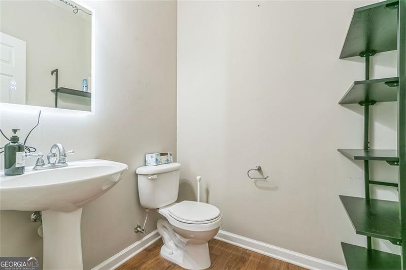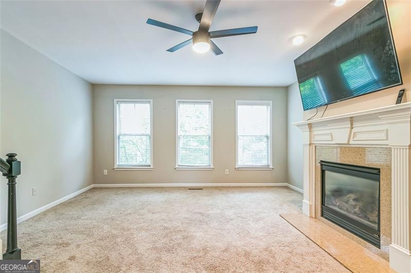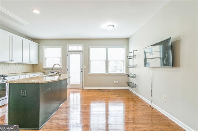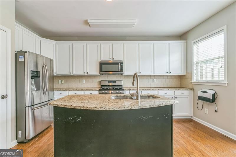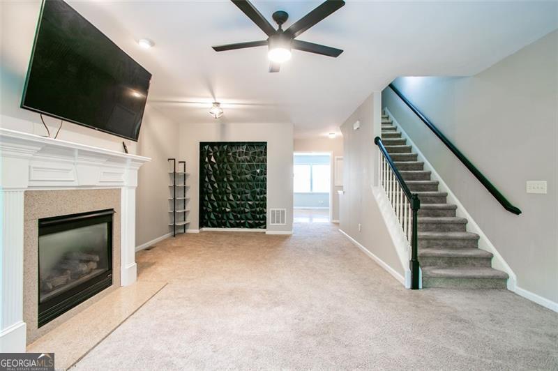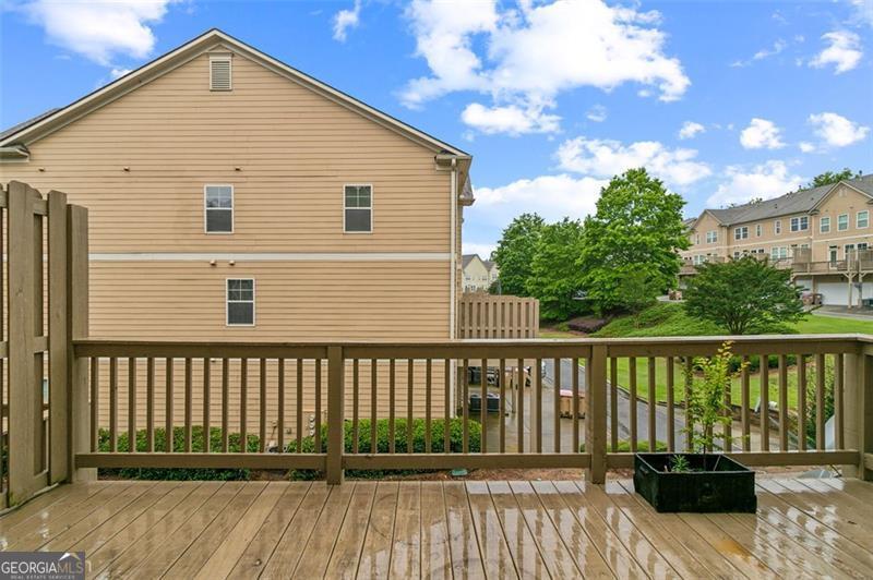 Motivated Seller!!! Welcome to your next home in Suwanee's premier Village Grove community. This beautifully maintained 3BR/3.5BA townhome offers three spacious levels with an open-concept layout and thoughtful upgrades throughout. The kitchen features bright white cabinetry with matte black hardware, granite countertops, stainless steel appliances, and a striking custom black island with dual sinks-complemented by brand new flooring installed in July 2025. Two metal basket ladder shelves offer stylish open storage, and just off the kitchen, a private deck provides the perfect spot for morning coffee or evening relaxation. Black-and-white handrails with gold-tone hardware add a refined touch that echoes the home's modern finishes. Each bedroom includes a ceiling fan and its own custom paint accent wall. A bold accent wall in the main living area is flanked by two built-in ladder-style bookcases-ideal for a home office or bar setup. Additional features include three mounted TVs that remain with the home, a Whirlpool washer, and updated matte black hardware in the main bathrooms. The spacious owner's suite includes a spa-like bath and a walk-in closet. Steps from Sims Lake Park and walkable to the new Town Center on Main, this swim/tennis community is served by North Gwinnett's award-winning schools and offers green spaces, trails, and HOA-covered exterior maintenance for hassle-free living.