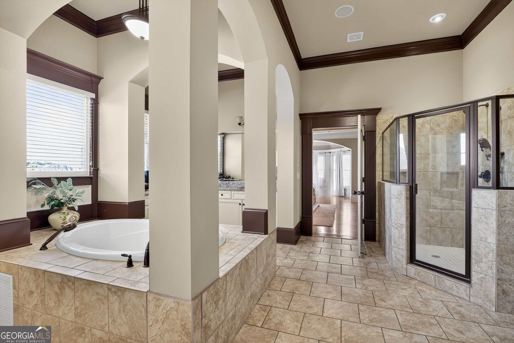- Interior FeaturesBookcases, High Ceilings, Pulldown Attic Stairs, Rear Stairs, Separate Shower, Soaking Tub, Tray Ceiling(s), Two Story Foyer, Vaulted Ceiling(s), Walk-In Closet(s)