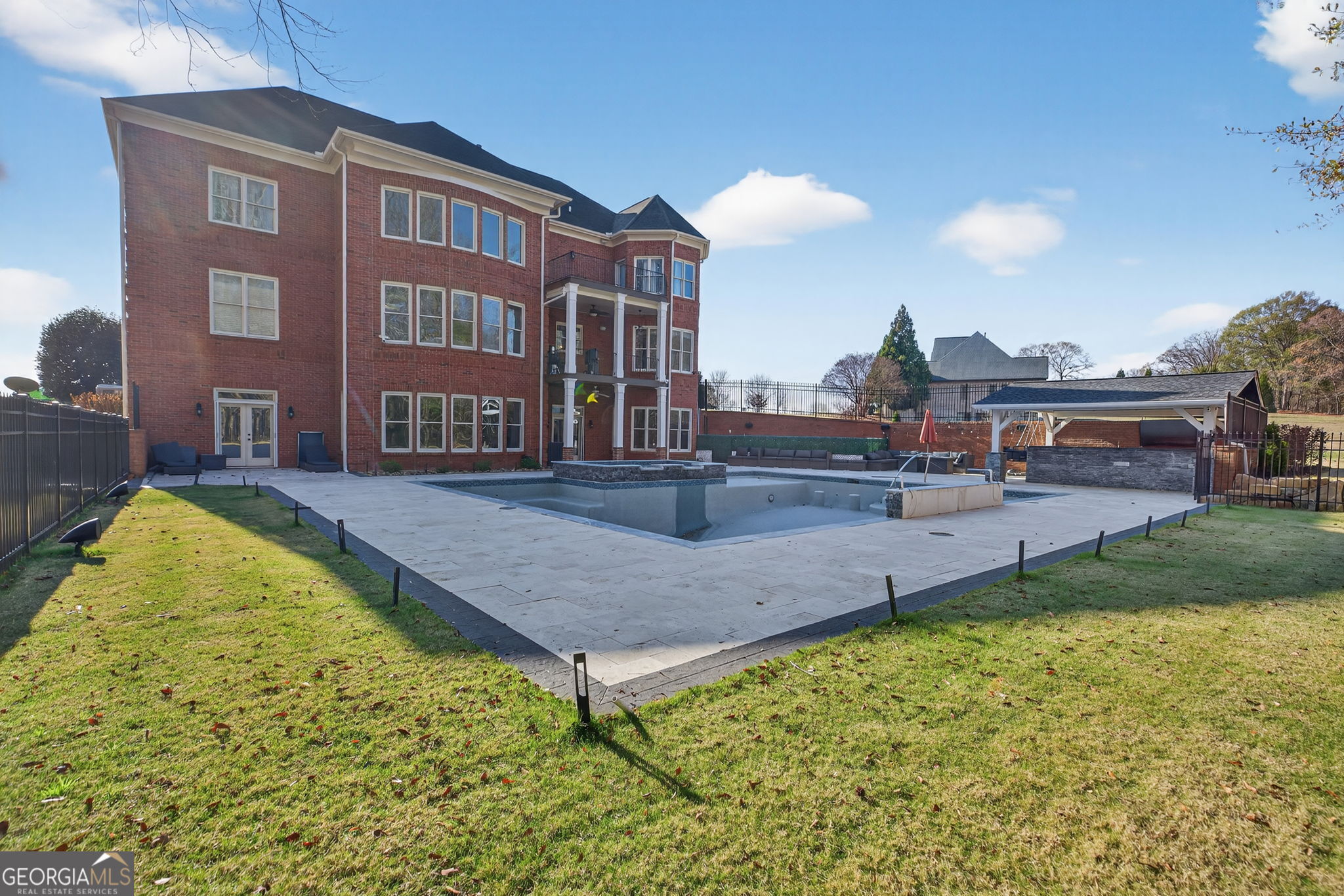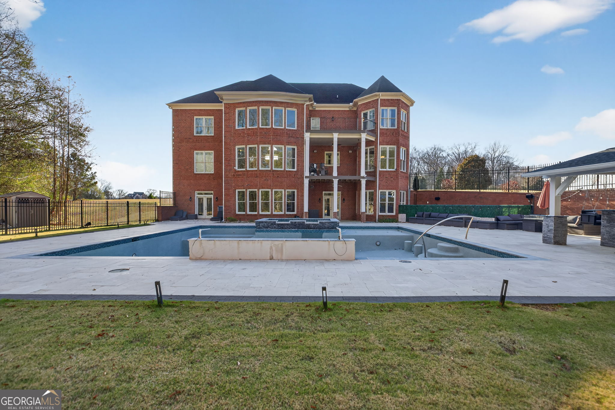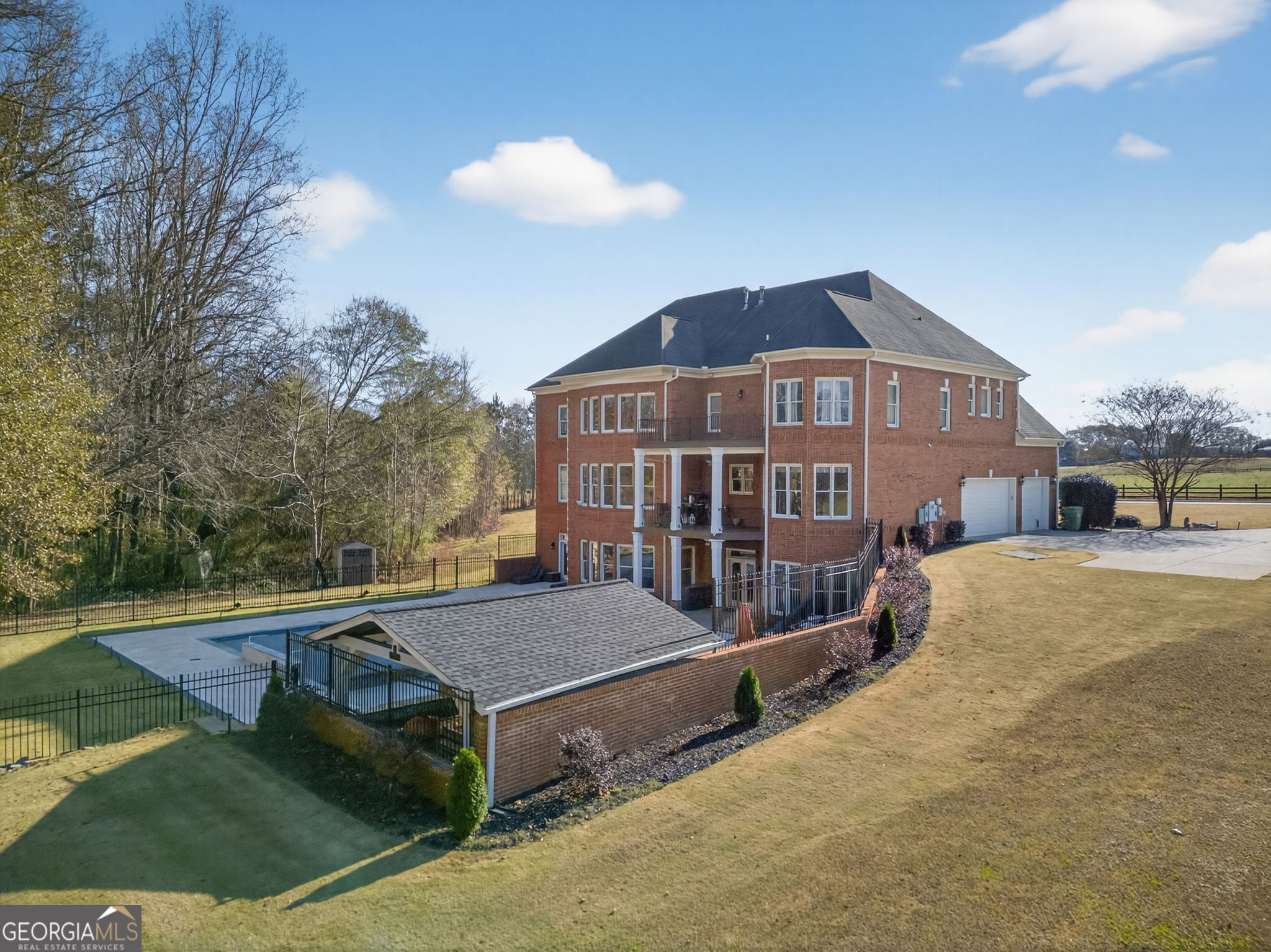 Experience exceptional living in this breathtaking full-brick, colonial-style estate nestled on 5+ acres in the highly sought-after Estates at Holly Hills. From the moment you arrive, the home's stately presence, massive front porch, and beautifully landscaped grounds make an unforgettable impression. Step inside to discover soaring ceilings, rich millwork, expansive living areas, and oversized windows that flood the home with natural light. The chef-inspired kitchen features high-end cabinetry, premium appliances, a large island, and a seamless flow into the keeping room-perfect for entertaining. The property now boasts a brand-new, stunning 22' x 40' heated pool with striking 8' x 44' edges, offering a luxury resort-style escape right in your backyard. Complementing this outdoor retreat is a gourmet outdoor kitchen, ideal for hosting gatherings, grilling, and enjoying long summer evenings by the water. Additional highlights include spacious bedrooms, spa-like baths, multiple flex rooms, a dedicated office, a large laundry room on the main level, and abundant storage throughout. The land itself offers privacy, gentle rolling terrain, and plenty of room to roam. Located just minutes from shopping, restaurants, golf, parks, and top-rated schools, and approximately 45 minutes from the Atlanta airport, this remarkable home seamlessly blends comfort, convenience, and refined elegance. Easy to show-appointment required.