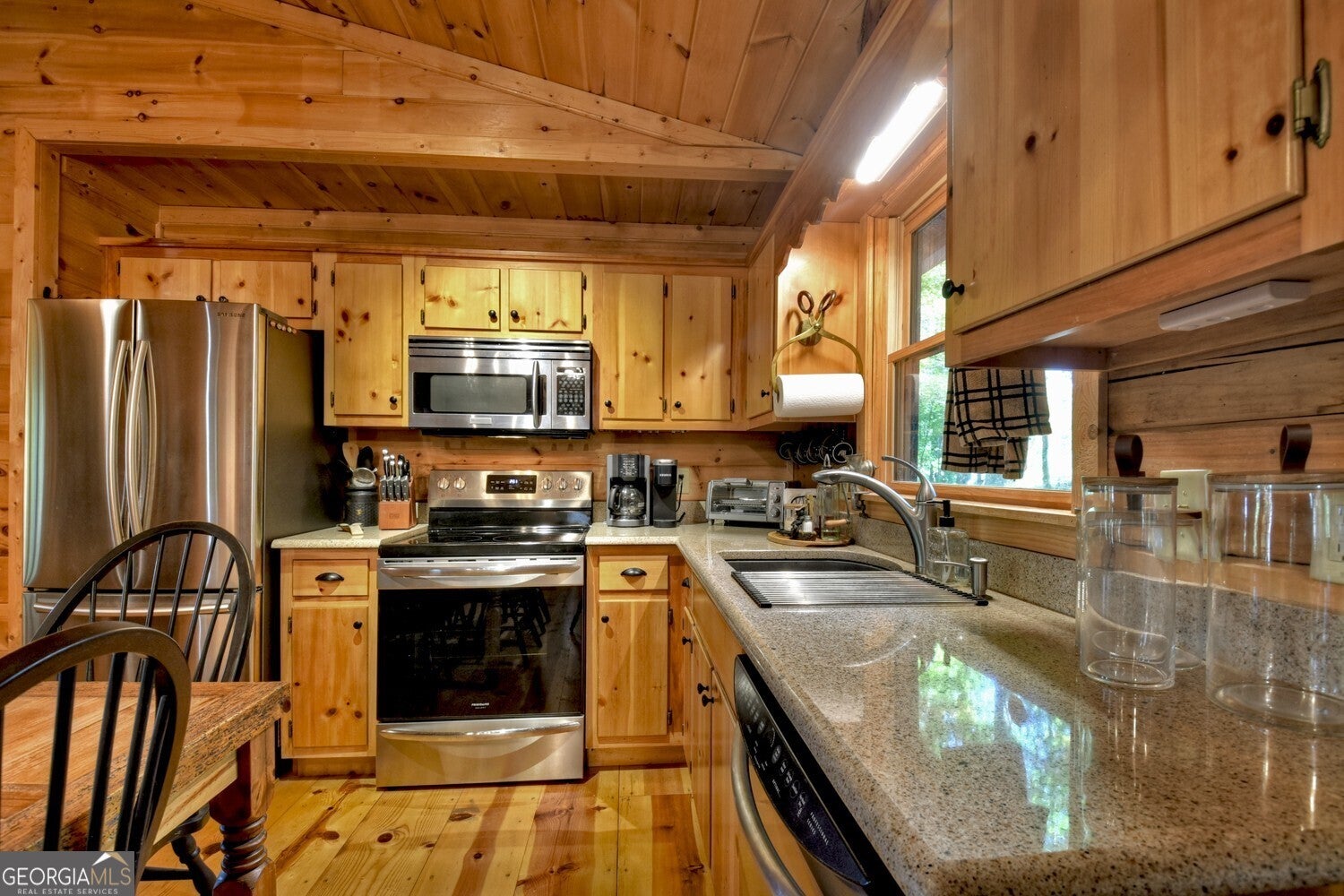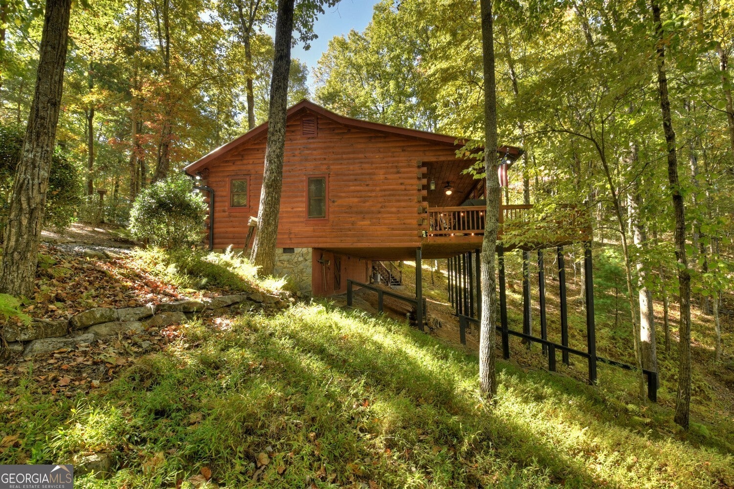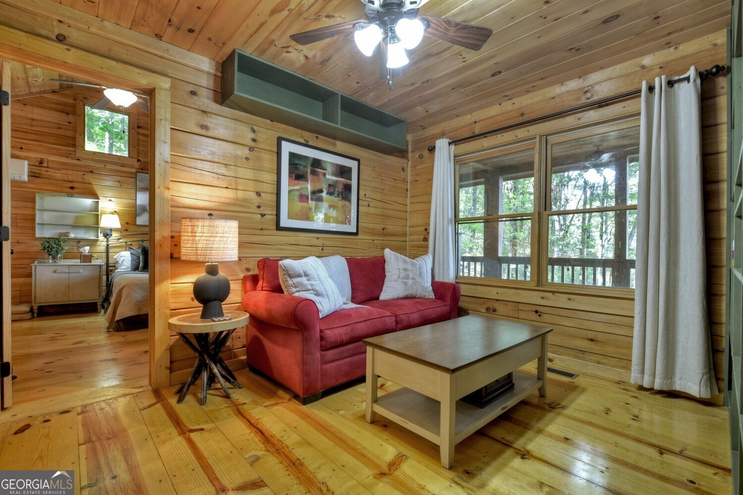 Nestled in the peaceful wooded setting of Cherry Log, this charming, cozy cabin offers the perfect retreat for nature lovers and those seeking tranquility. With its warm, rustic interior featuring all wood interior, a stone fireplace, and soft ambient lighting, the cabin exudes a welcoming, homely atmosphere. The open-concept living area connects seamlessly with a fully equipped kitchen with granite and stainless appliances, making it easy to relax and unwind after a day of exploring. The primary suite is a luxurious haven designed for comfort with high volume ceilings, large windows and 2 closets. Outside, a spacious and expansive deck overlooks the surrounding forest, providing the ideal spot for morning coffee or evening stargazing and features stepless entries and 1- car detached garage. Whether it's for a weekend getaway or a longer stay, this cabin promises comfort, serenity, and a true connection to nature.