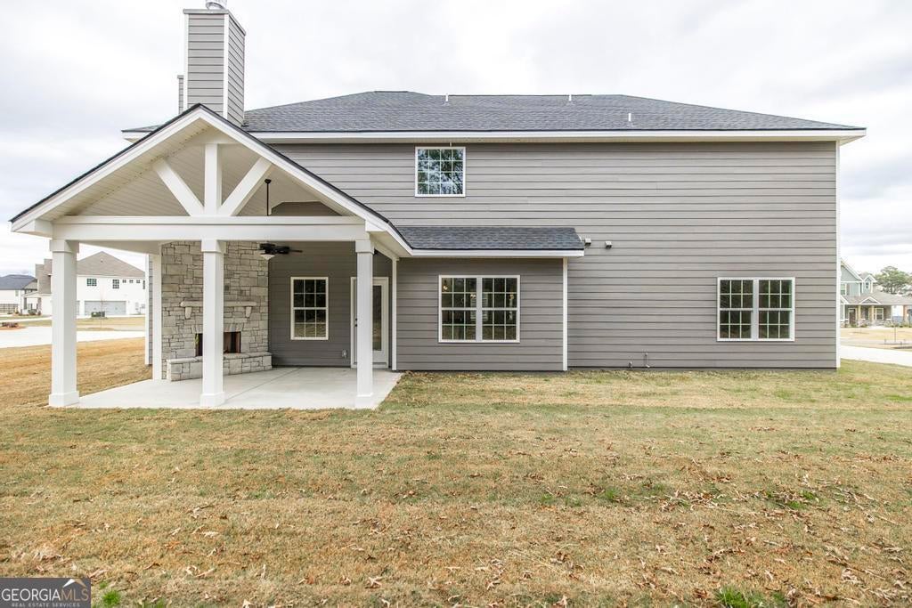 Welcome to Knob Hill, a beautifully crafted Hughston Homes community where thoughtful design and refined details set the tone for exceptional living. Introducing the Jackson B Floorplan, one of our most sought-after designs offering 3,324 square feet, 5 bedrooms, and 4 baths, perfectly suited for both everyday living and entertaining. A welcoming farmhouse-style porch with stone-wrapped columns opens to a bright, open interior filled with architectural detail. The inviting foyer is flanked by a formal dining room with a coffered ceiling and an elegant flex space ideal for a home office or additional living area. The expansive great room features a wood-burning fireplace and abundant natural light, seamlessly connecting to the heart of the home. The gourmet kitchen is a true standout with timeless cabinetry, recessed lighting, granite countertops, a herringbone tile backsplash, a gas cooktop, stainless steel vent hood, wall oven/microwave, and a large island overlooking the breakfast area. A walk-in pantry provides generous storage, while the layout encourages easy gathering and flow. The main level also includes a private guest bedroom and full bath, along with a signature owner's entry drop zone with built-in cubbies, a stylish and functional everyday convenience. Upstairs, the owner's suite is a true retreat, featuring a spa-inspired bath with a garden tub, separate shower, quartz countertops, and an expansive walk-in closet. Additional bedrooms include private baths and walk-in closets, offering flexibility for guests, teens, or multi-generational living. Laundry is conveniently located upstairs near the bedrooms. Luxury vinyl plank flooring throughout the main living areas, upgraded trim, and curated finishes elevate the home's timeless appeal. A side-entry two-car garage adds to the exterior presence, while the showstopping Signature Gameday Patio, complete with wood-burning fireplace, ceiling fan, and built-in speakers, creates the perfect backdrop for evenings at home or weekend entertaining. This is a rare opportunity to enjoy space, style, and craftsmanship in one of the area's most beautifully designed communities.