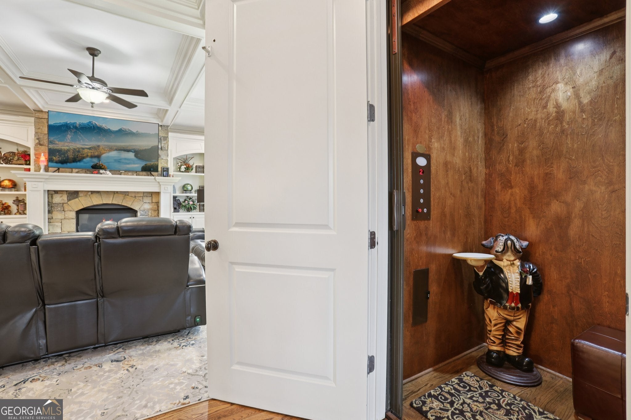 Enter this beautiful, impeccably maintained, light, and bright home through the exquisite wrought iron security doors. A few steps up lead to a spacious living room featuring refinished hardwood floors and plantation shutters. This flows seamlessly into a generous formal dining room, conveniently located next to a butler's pantry, and then into a large kitchen. The kitchen boasts custom cabinetry, stainless steel appliances, a walk-in pantry, and opens to the family room, which includes an updated fireplace, built-in shelving, and a coffered ceiling. From the kitchen, you also have a great view of the trellised deck. Take the elevator or stairs to the top level, where you will find a large primary suite. This suite offers a spacious bathroom with separate vanities, a double shower, a separate tub, and a huge walk-in closet. The upper level also includes a dedicated computer space and two secondary bedrooms with a Jack and Jill bathroom featuring a double vanity. The lower level features an extra-large in-law suite with a full bath and wet bar. The garage is equipped with an epoxy floor and additional storage space. Cooling system has been upgraded to 16 SEER, Heating system has been upgraded to 98.5% Efficiency, and upgraded R-21 spray foam insulation in the attic. Don't miss the opportunity to own this beautiful home in a prime location within a gated community.