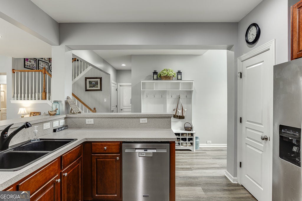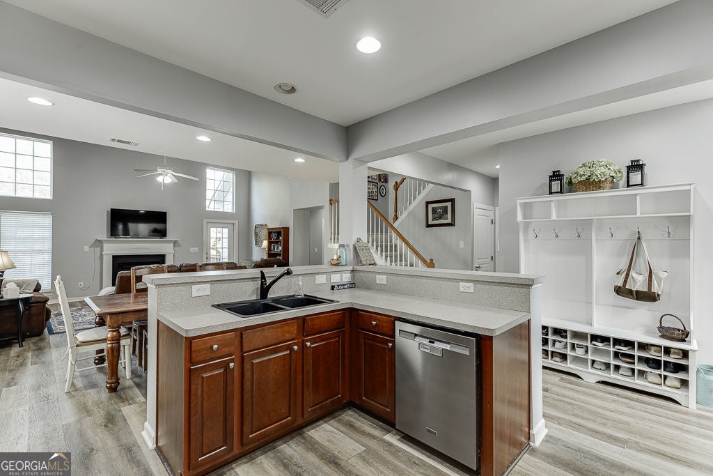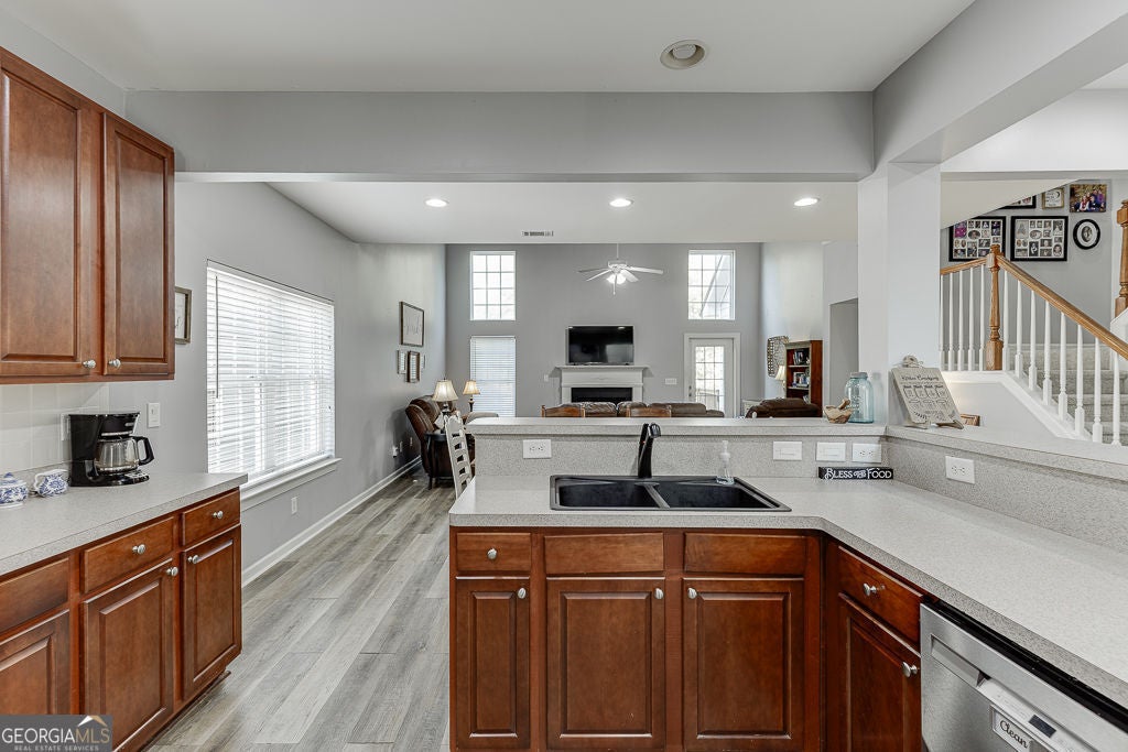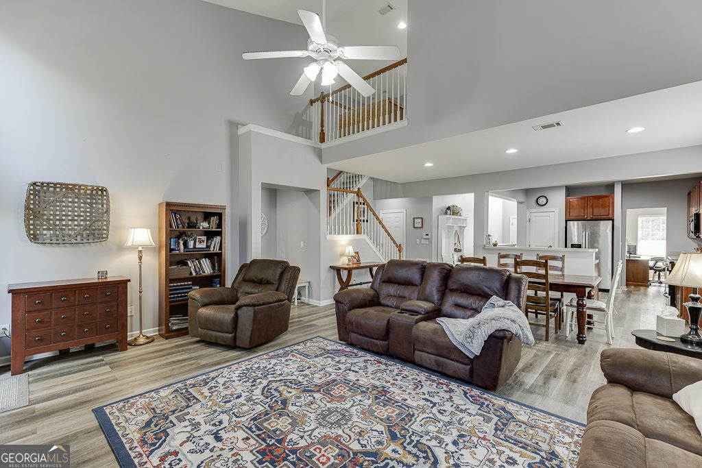 **MASTER ON MAIN in STERLING ON THE LAKE** Welcome home to one of Flowery Branch's favorite communities! This 4-bedroom, 2.5-bath home offers 2,560 square feet of open, comfortable living space designed for everyday life and easy entertaining. The main level features a bright two-story great room filled with natural light, a cozy fireplace, and seamless flow into the dining area and kitchen. The spacious primary suite on the main floor includes an updated bath and generous closet space. Upstairs, you'll find three additional bedrooms and a full bath-perfect for family, guests, or a home office. Enjoy peaceful mornings on the rocking-chair front porch or unwind on the covered patio overlooking a private, fenced backyard. The unfinished basement offers endless possibilities for future living space or storage. Located in South Hall's premier Lake community, Sterling on the Lake, where residents enjoy resort-style amenities that include: four swimming pools, multiple tennis and pickleball courts, walking trails with waterfalls, multiple playgrounds, a community treehouse, and a 24-hour fitness center as well as a public Library with cafe!! This community is very golf cart-friendly! Hop in and ride around to see the beautiful sunset or take everyone to one of the many pools or playgrounds! Conveniently located near great shopping, dining, and parks, with sought-after Spout Springs Elementary just minutes away.