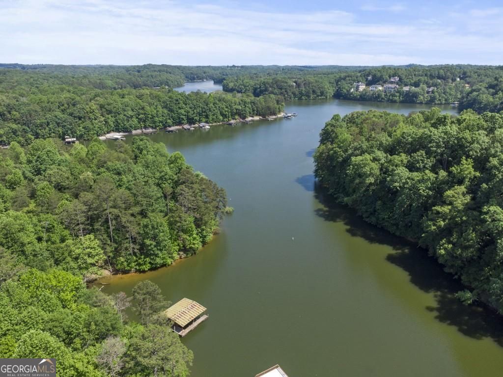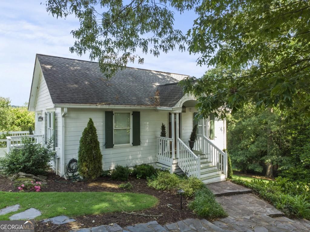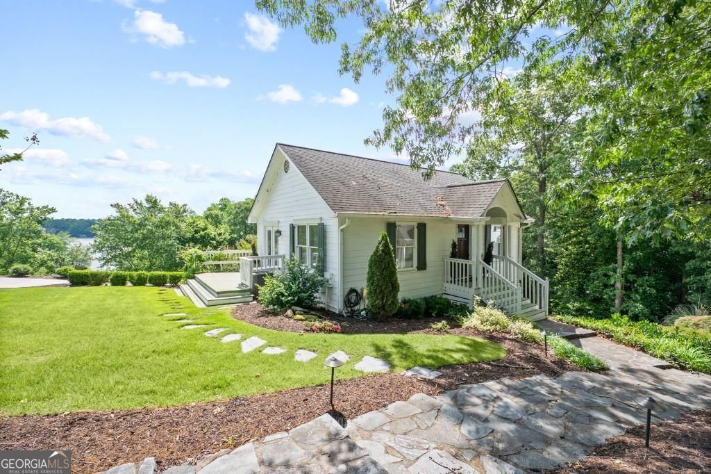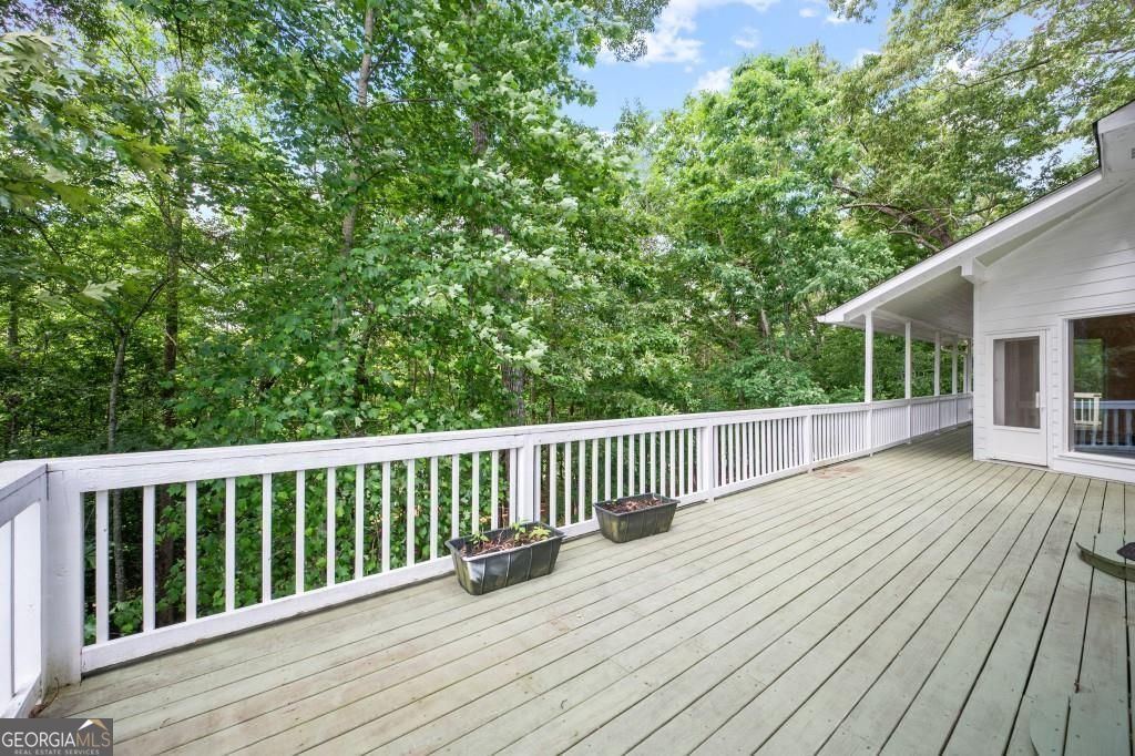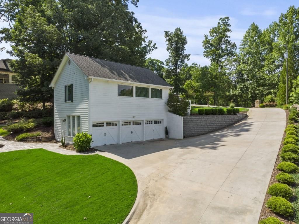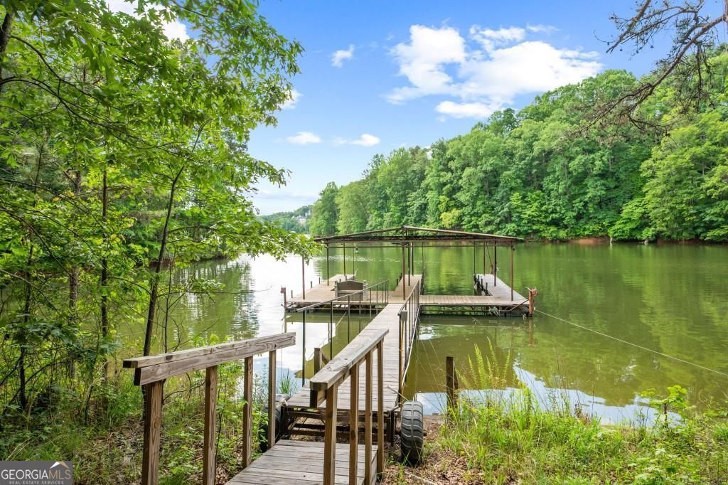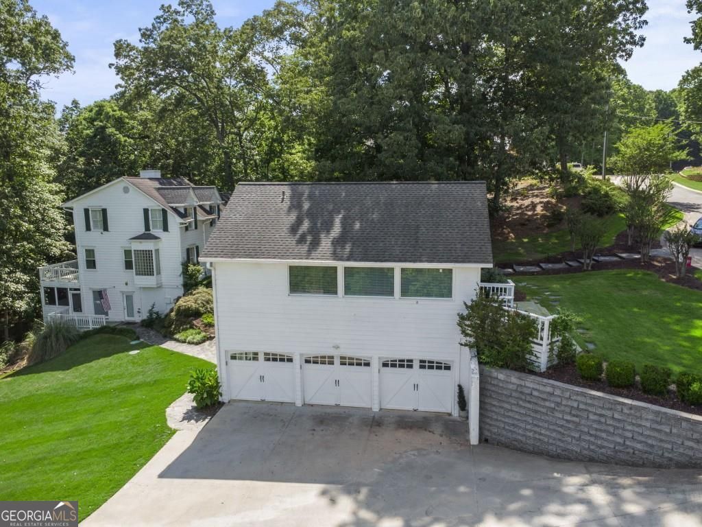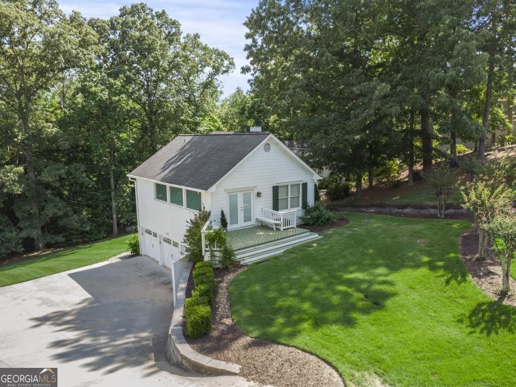 PRIVATE GUEST HOUSE, PRIVATE DOCK, DEEPWATER, NO HOA, EASY COMMUTE TO ATL, WHOLE HOUSE GENERATOR!! Nestled at the end of a tranquil cul-de-sac, this stunning residence boasts direct access to deep water with a PRIVATE (not shared) 2-slip dock, complete with electrical hookups. This magnificent home features four spacious bedrooms and four full baths, perfectly designed for comfort and luxury. Upon entering, you'll be greeted by a breathtaking two-story great room that provides an open and airy ambiance. The updated kitchen is a chef's delight, equipped with modern appliances and complemented by a butler's pantry for additional storage and prep space. Enjoy serene lakeside views from the screened porch, which features a relaxing hot tub. This home is equipped with a Generac generator ensuring uninterrupted power, an irrigation system for lush landscaping, and an updated electrical system for your peace of mind. Inside, unwind in one of the luxurious jacuzzi tubs, and appreciate the several new windows that flood the space with natural light. The exterior boasts siding replaced just five years ago, ensuring both durability and curb appeal. The gentle, lit path to the dock makes evening strolls to the lake a delight. The upstairs deck offers a perfect spot to enjoy sunsets over the water. Hardwood floors run throughout the home, adding warmth and elegance to every room. Additionally, this property includes a separate carriage house (ADU- Additional Dwelling Unit) above a spacious three-car garage. The carriage house provides 768 square feet of comfortable living space, featuring one bedroom, one full bath, a fully-equipped kitchen, and a cozy living room. With no HOA restrictions, this lakefront haven offers the perfect blend of privacy and luxury, making it an ideal retreat for family and friends. Come and experience the unparalleled beauty and comfort of lakeside living at its finest.