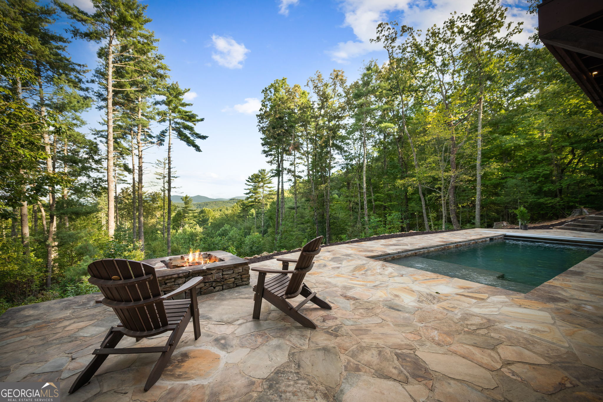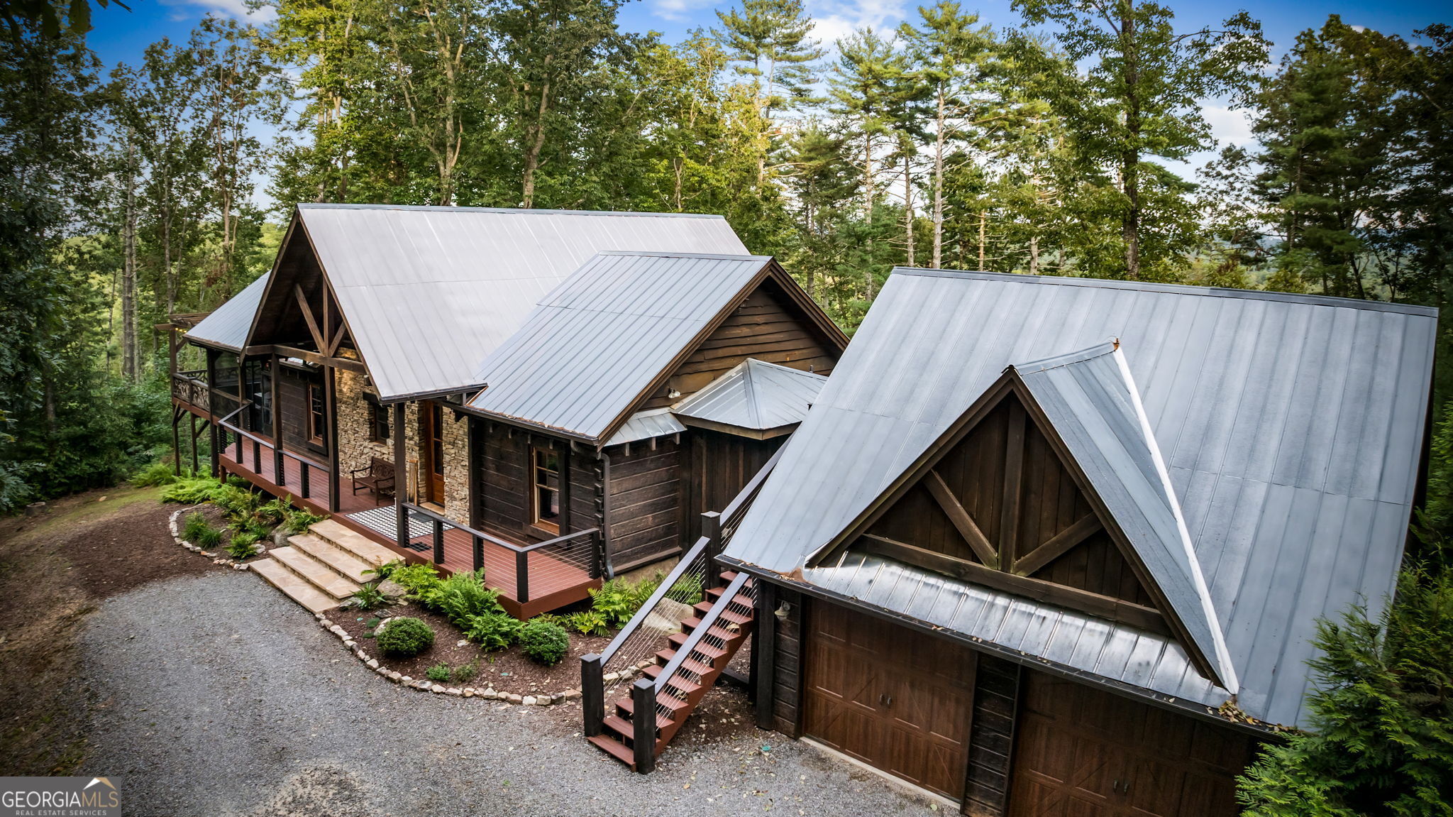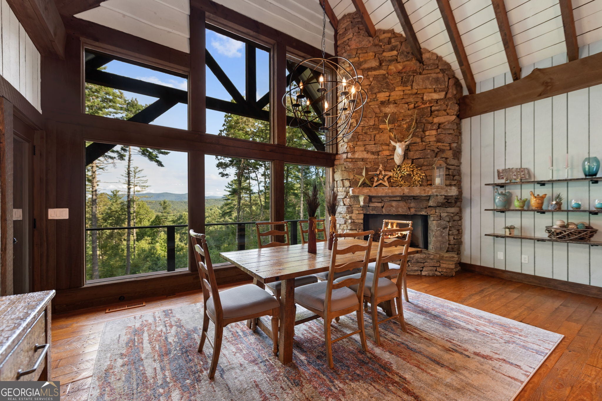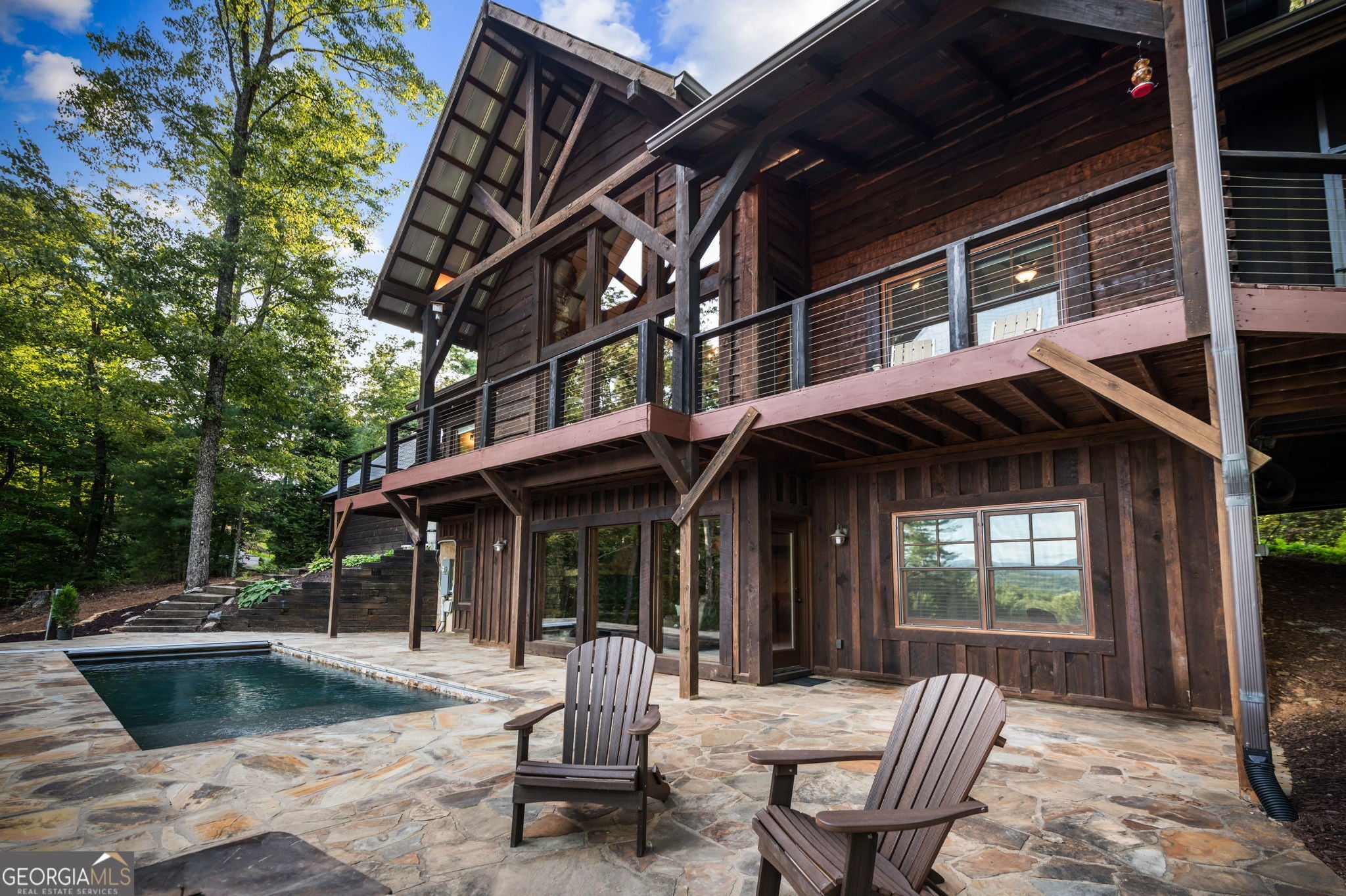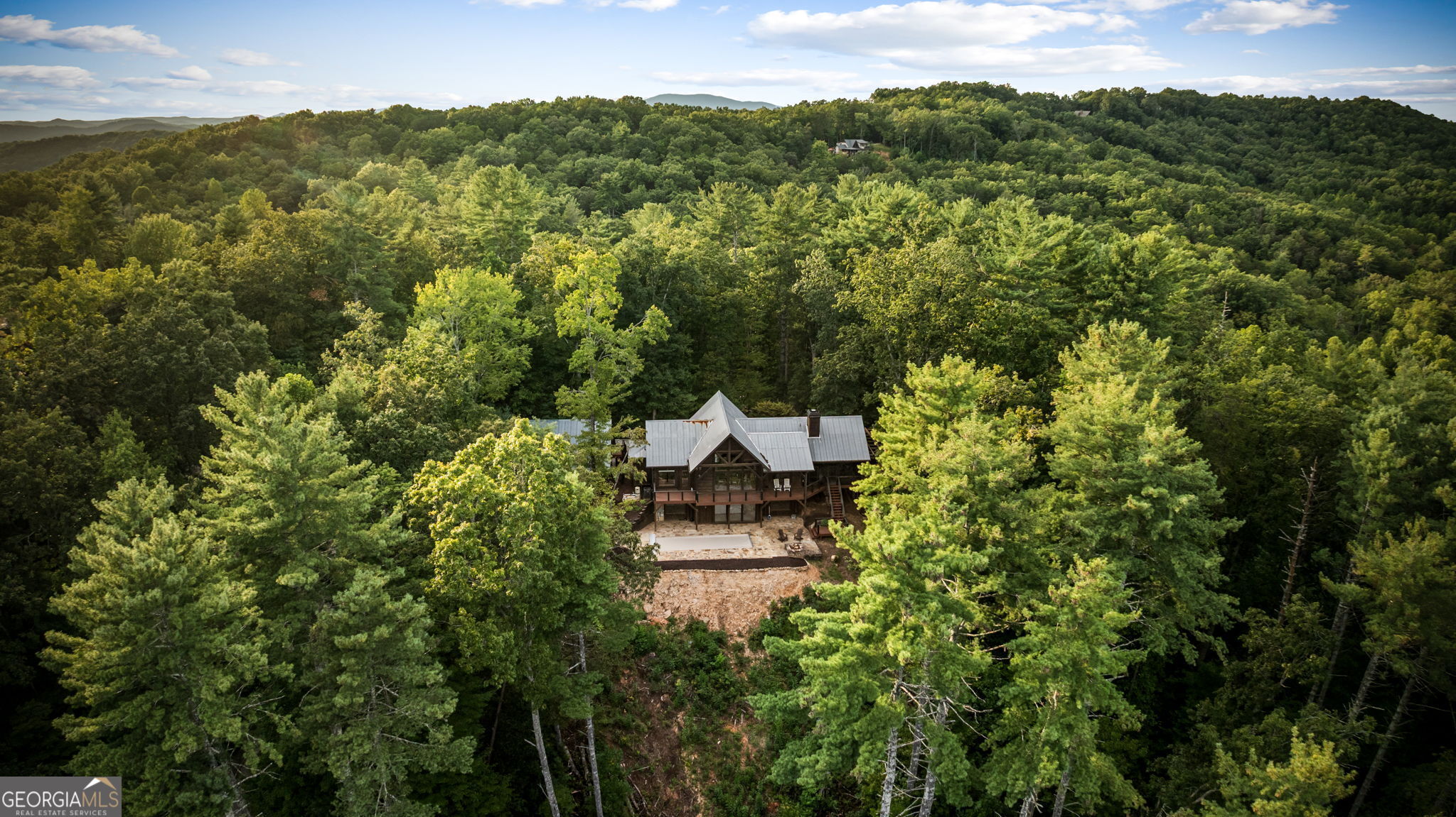 Indulge in this exquisite six-acre mountain estate where privacy, natural beauty, and refined luxury converge. Surrounded by towering trees and sweeping mountain vistas, this turn-key retreat offers tranquility and grandeur at every turn. The spacious residence features four bedrooms and three full baths, thoughtfully designed to blend sophistication with comfort. The main level boasts two primary suites with spa-like en suite baths. One offers walls of windows framing breathtaking views, a walk-in closet, dual vanities, and a custom rock shower with a cascading waterfall. The other showcases a cozy linear fireplace and upscale finishes, ideal for relaxation or hosting. At the heart of the home, the gourmet kitchen is outfitted with Viking appliances, farmhouse sink, custom wood cabinetry, stone accents, and a large island perfect for gatherings. A formal dining area sets the stage for intimate dinners and holiday celebrations. Throughout, rustic charm meets modern elegance-barn wood beams, artisanal accent walls, and rock fireplaces are paired with oversized windows that fill the home with light and mountain panoramas. Outdoor living is just as spectacular. An expansive wrap-around deck captures sunsets and breezes, while the screened porch with fireplace and shaded pergola with hot tub invite year-round enjoyment. The lower level is an entertainer's dream with a full wet bar, recreation room, and two guest suites with a custom rock bath. A sauna, fire pit, and sparkling pool elevate the retreat. Above the two-car garage, a versatile fifth bedroom with private bath offers additional space for guests, office, or studio. Just minutes from Downtown Blue Ridge, with its boutique shopping, fine dining, and outdoor adventures, this estate embodies the best of mountain living-timeless elegance surrounded by unmatched natural splendor.