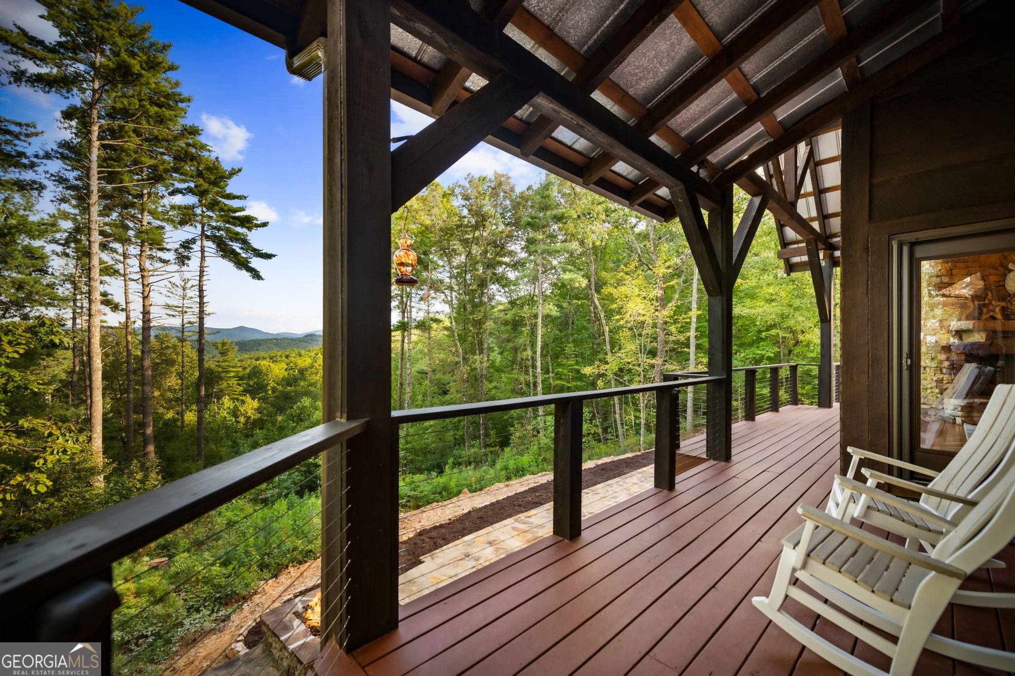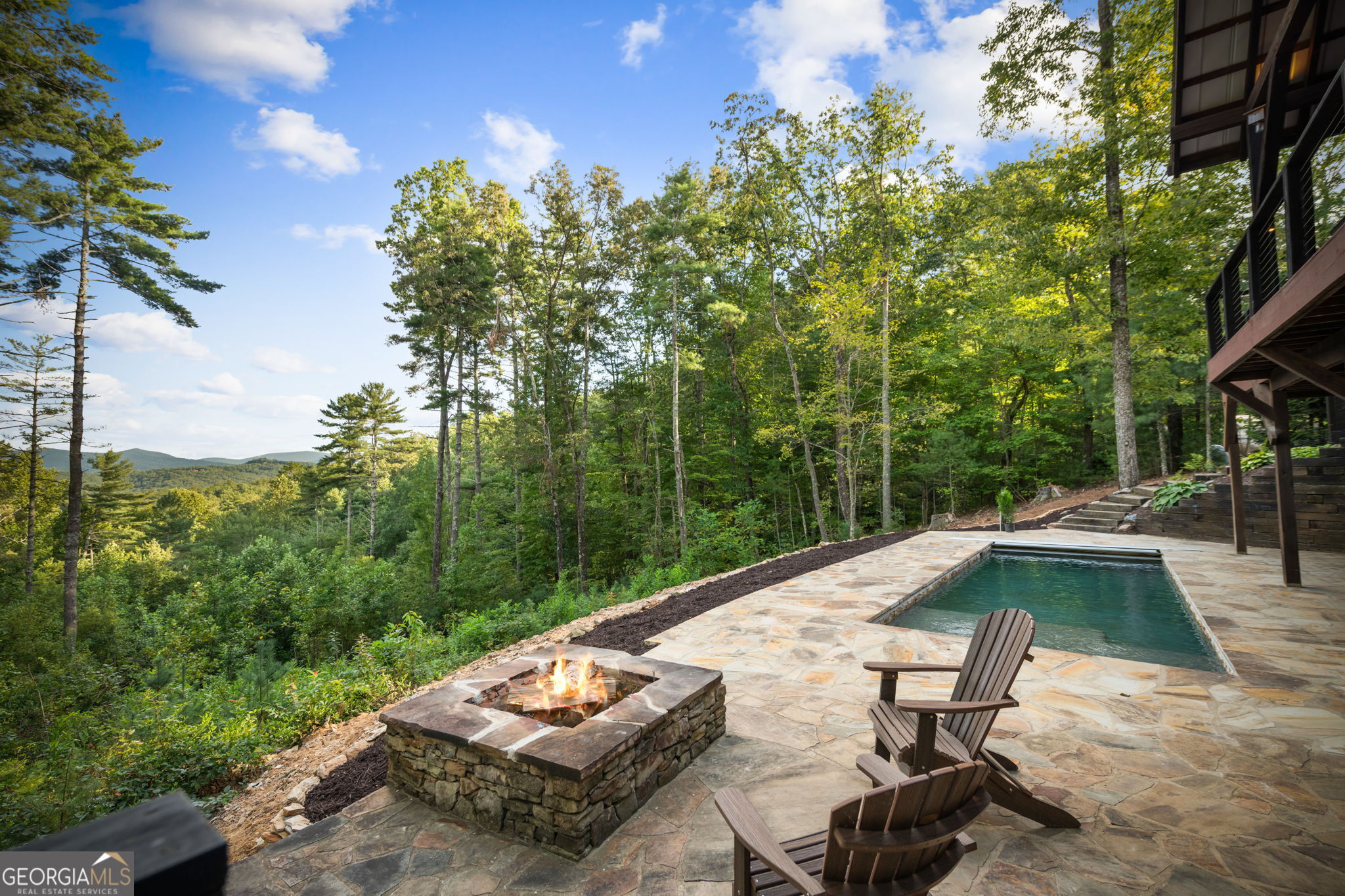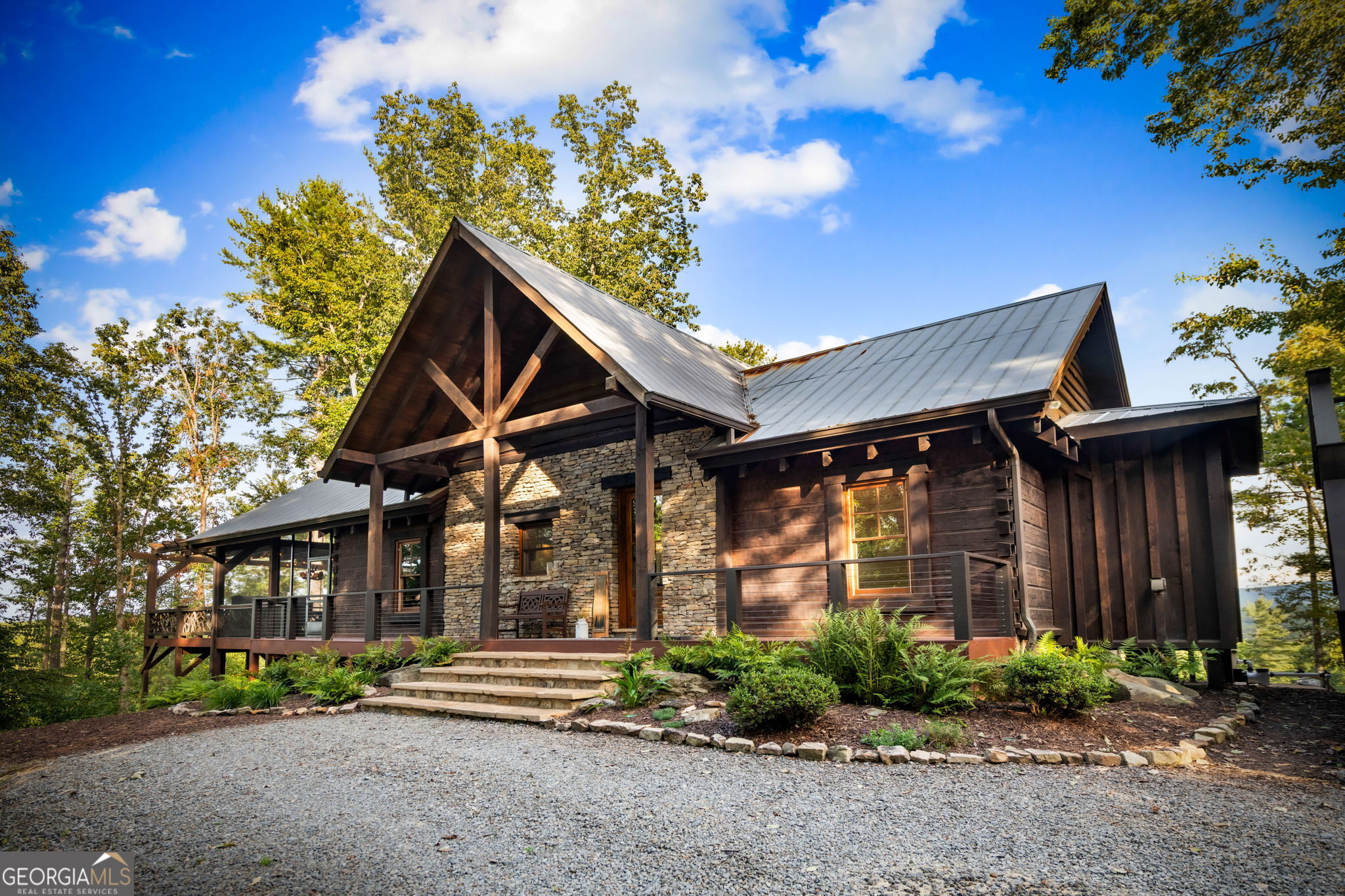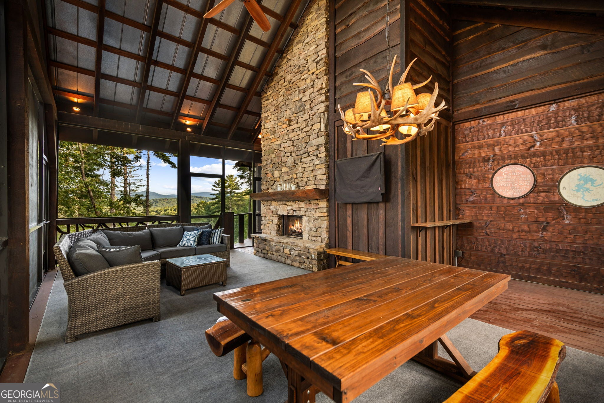 Indulge in this exquisite six-acre mountain estate where privacy, natural beauty, and refined luxury converge. Surrounded by towering trees and sweeping mountain vistas, this turn-key retreat offers tranquility and grandeur at every turn. The spacious residence features four bedrooms and three full baths, thoughtfully designed to blend sophistication with comfort. The main level boasts two primary suites with spa-like en suite baths. One offers walls of windows framing breathtaking views, a walk-in closet, dual vanities, and a custom rock shower with a cascading waterfall. The other showcases a cozy linear fireplace and upscale finishes, ideal for relaxation or hosting. At the heart of the home, the gourmet kitchen is outfitted with Viking appliances, farmhouse sink, custom wood cabinetry, stone accents, and a large island perfect for gatherings. A formal dining area sets the stage for intimate dinners and holiday celebrations. Throughout, rustic charm meets modern elegance-barn wood beams, artisanal accent walls, and rock fireplaces are paired with oversized windows that fill the home with light and mountain panoramas. Outdoor living is just as spectacular. An expansive wrap-around deck captures sunsets and breezes, while the screened porch with fireplace and shaded pergola with hot tub invite year-round enjoyment. The lower level is an entertainer's dream with a full wet bar, recreation room, and two guest suites with a custom rock bath. A sauna, fire pit, and sparkling pool elevate the retreat. Above the two-car garage, a versatile fifth bedroom with private bath offers additional space for guests, office, or studio. Just minutes from Downtown Blue Ridge, with its boutique shopping, fine dining, and outdoor adventures, this estate embodies the best of mountain living-timeless elegance surrounded by unmatched natural splendor.