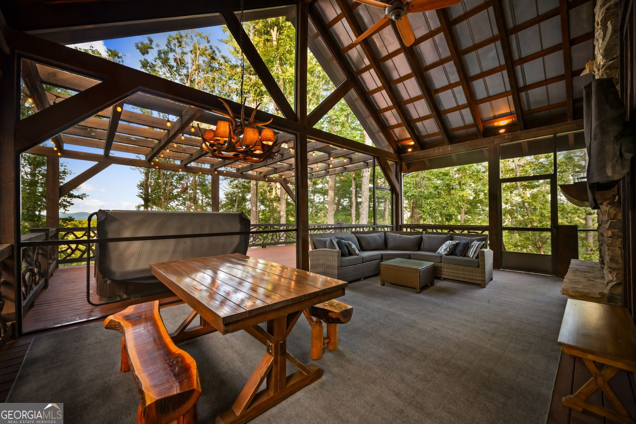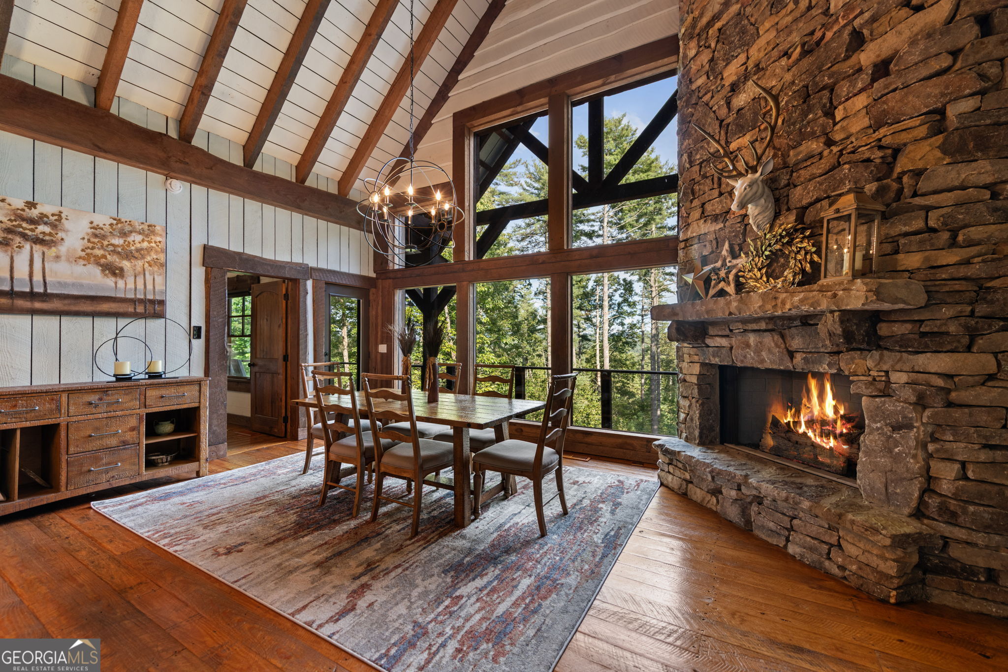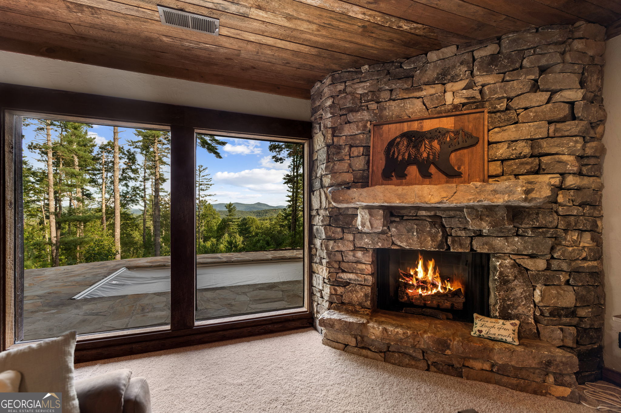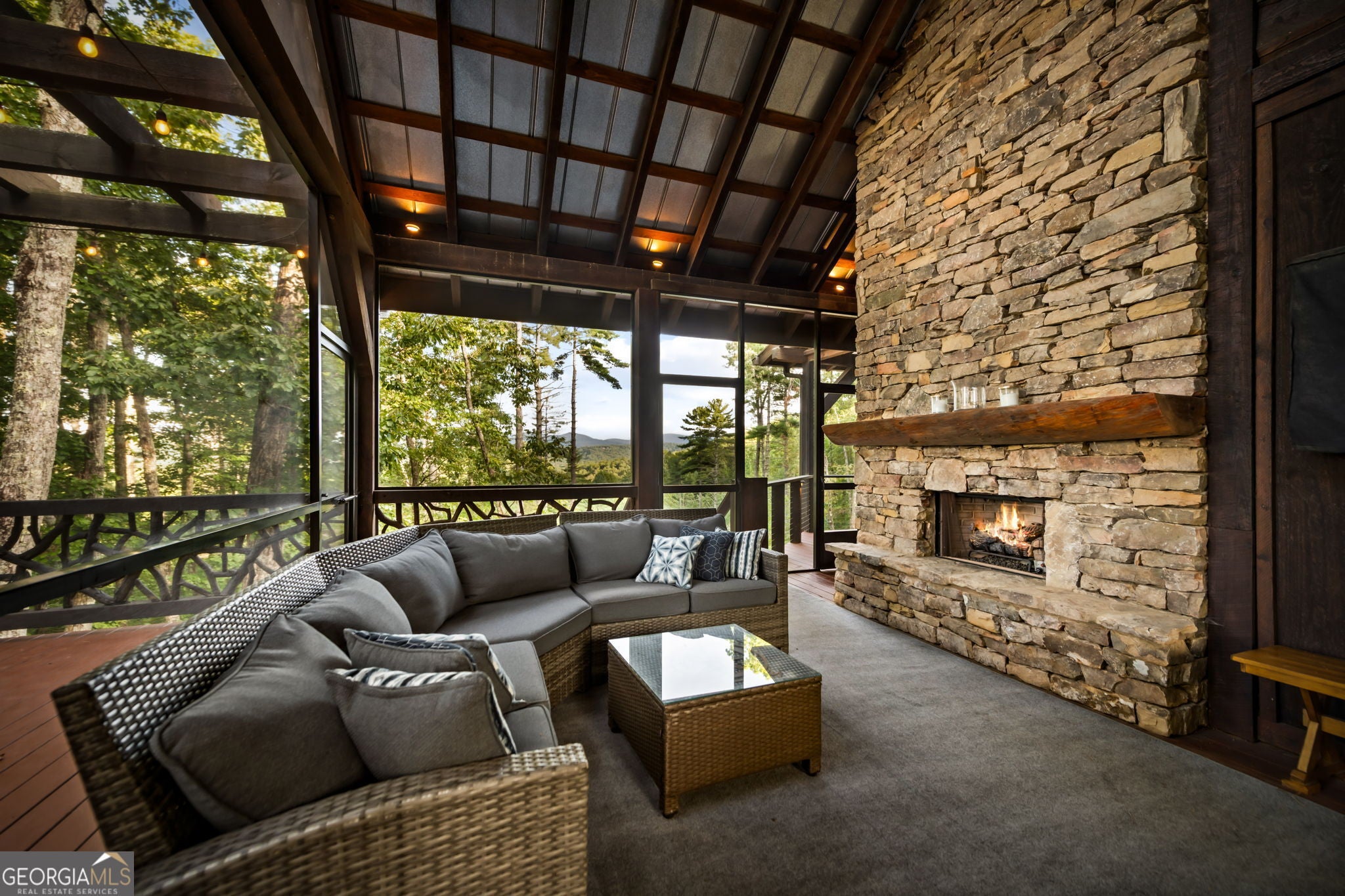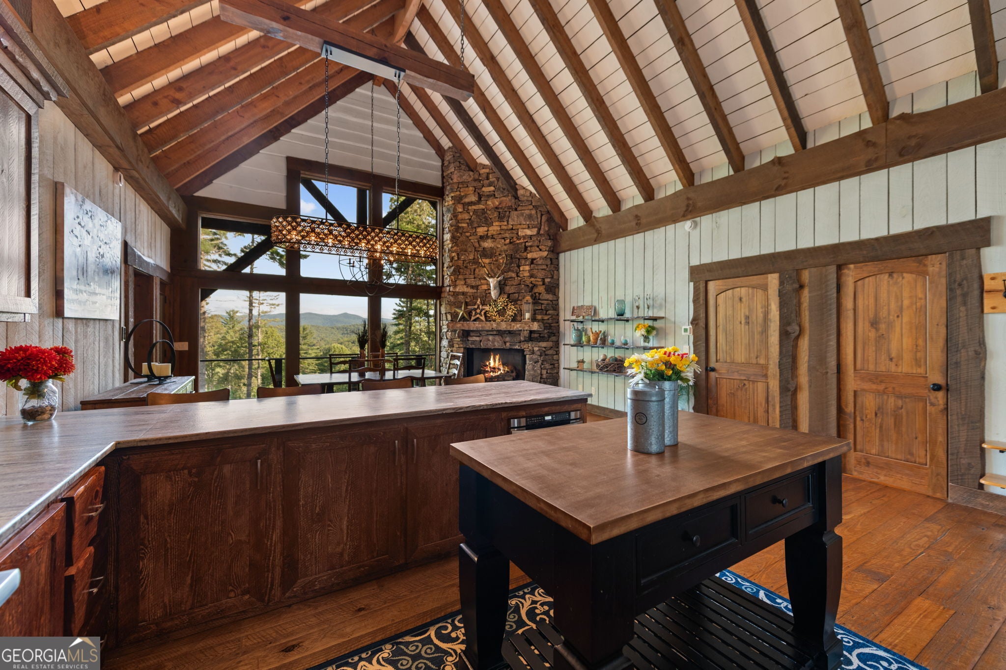 Indulge in this exquisite six-acre mountain estate where privacy, natural beauty, and refined luxury converge. Surrounded by towering trees and sweeping mountain vistas, this turn-key retreat offers tranquility and grandeur at every turn. The spacious residence features four bedrooms and three full baths, thoughtfully designed to blend sophistication with comfort. The main level boasts two primary suites with spa-like en suite baths. One offers walls of windows framing breathtaking views, a walk-in closet, dual vanities, and a custom rock shower with a cascading waterfall. The other showcases a cozy linear fireplace and upscale finishes, ideal for relaxation or hosting. At the heart of the home, the gourmet kitchen is outfitted with Viking appliances, farmhouse sink, custom wood cabinetry, stone accents, and a large island perfect for gatherings. A formal dining area sets the stage for intimate dinners and holiday celebrations. Throughout, rustic charm meets modern elegance-barn wood beams, artisanal accent walls, and rock fireplaces are paired with oversized windows that fill the home with light and mountain panoramas. Outdoor living is just as spectacular. An expansive wrap-around deck captures sunsets and breezes, while the screened porch with fireplace and shaded pergola with hot tub invite year-round enjoyment. The lower level is an entertainer's dream with a full wet bar, recreation room, and two guest suites with a custom rock bath. A sauna, fire pit, and sparkling pool elevate the retreat. Above the two-car garage, a versatile fifth bedroom with private bath offers additional space for guests, office, or studio. Just minutes from Downtown Blue Ridge, with its boutique shopping, fine dining, and outdoor adventures, this estate embodies the best of mountain living-timeless elegance surrounded by unmatched natural splendor.
