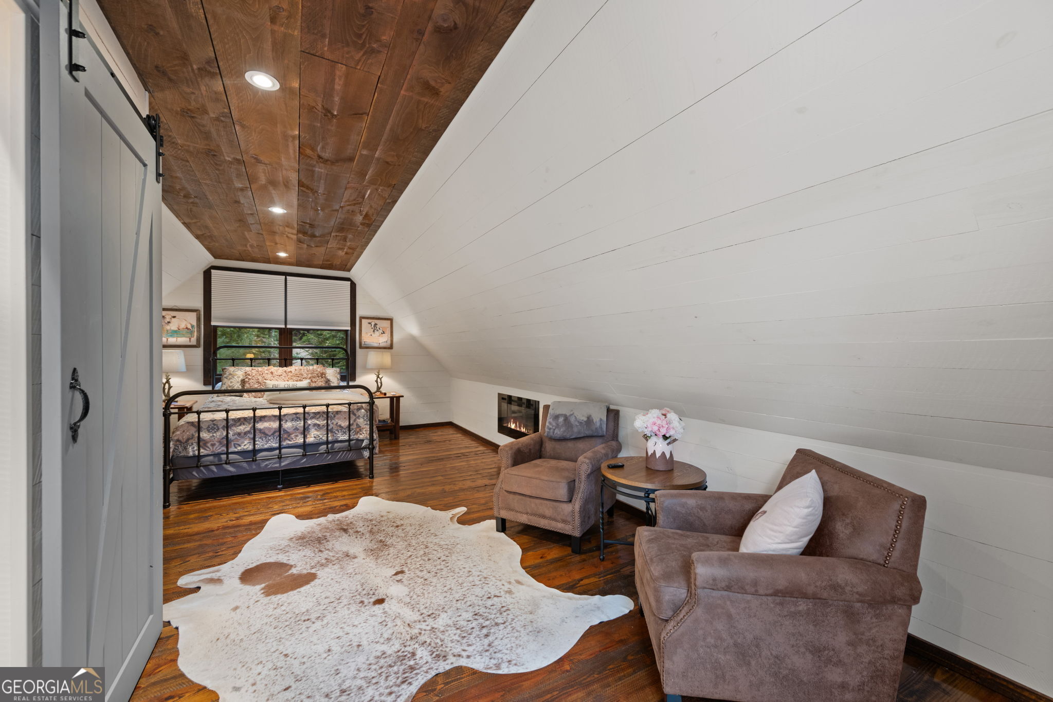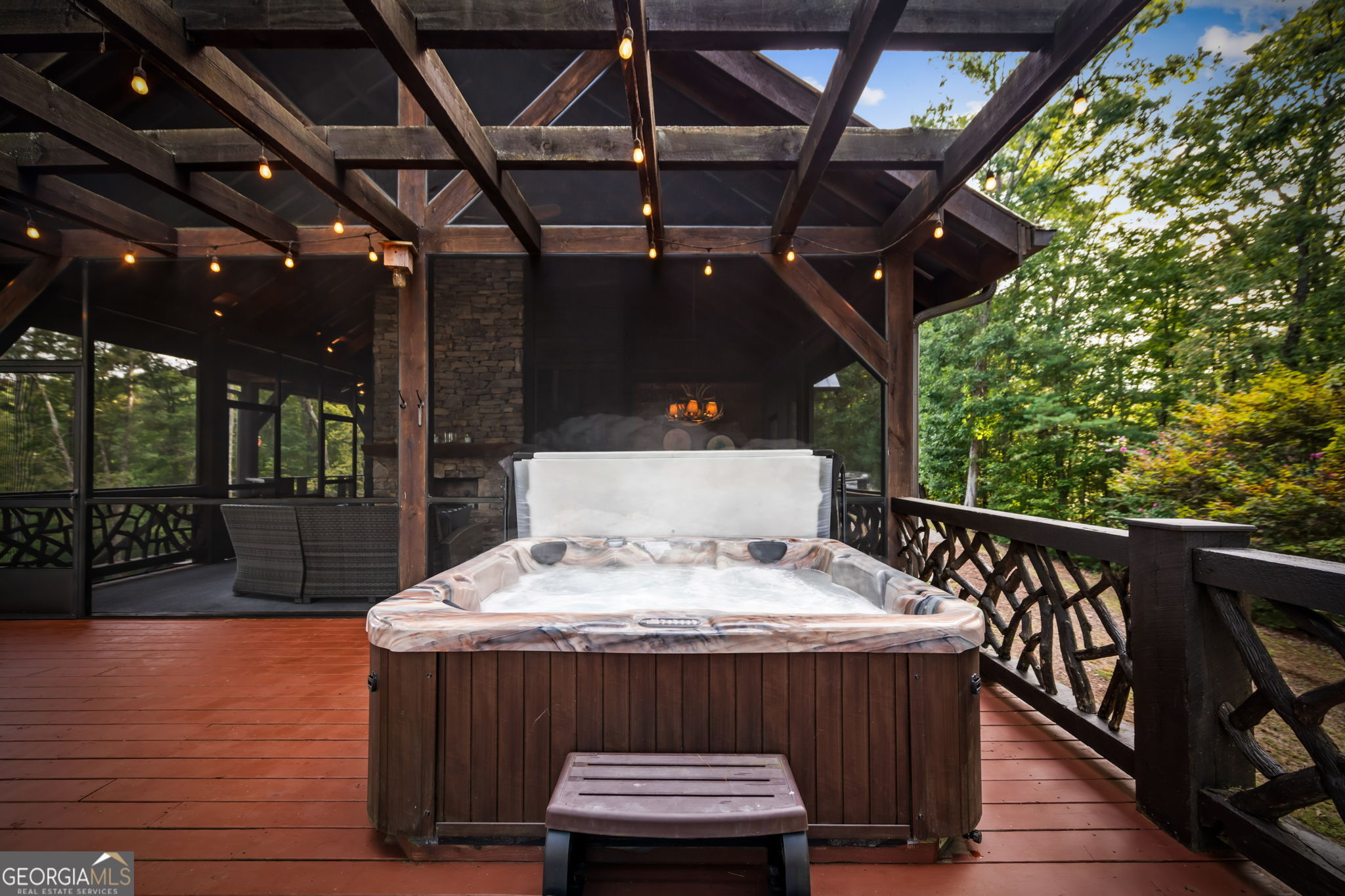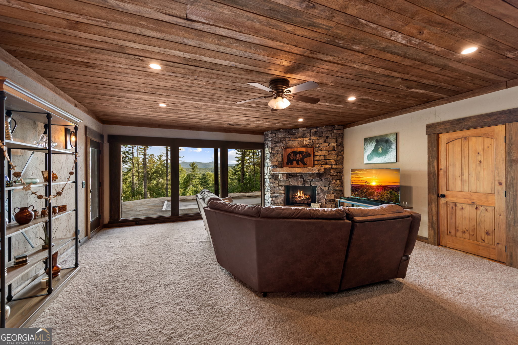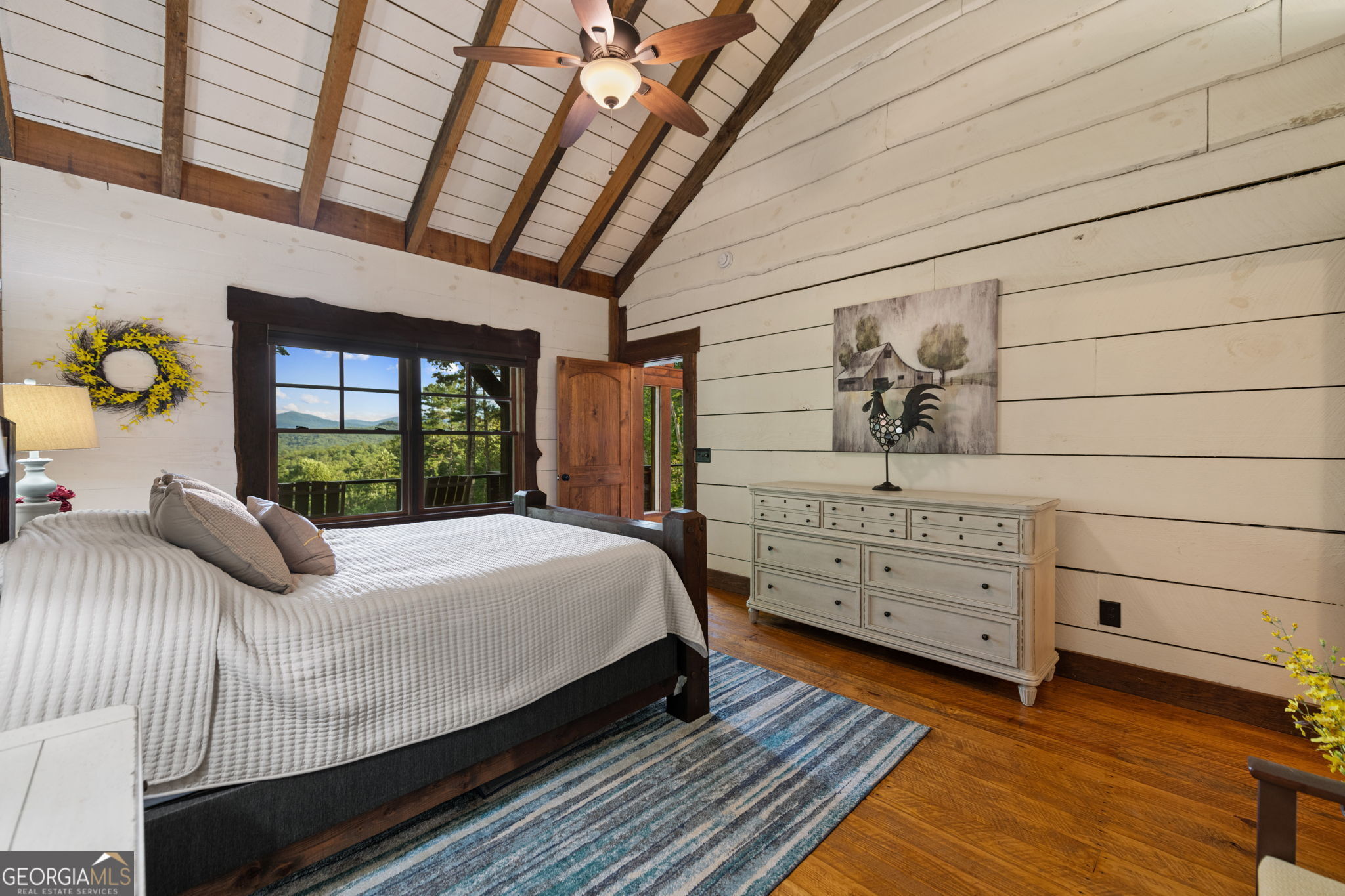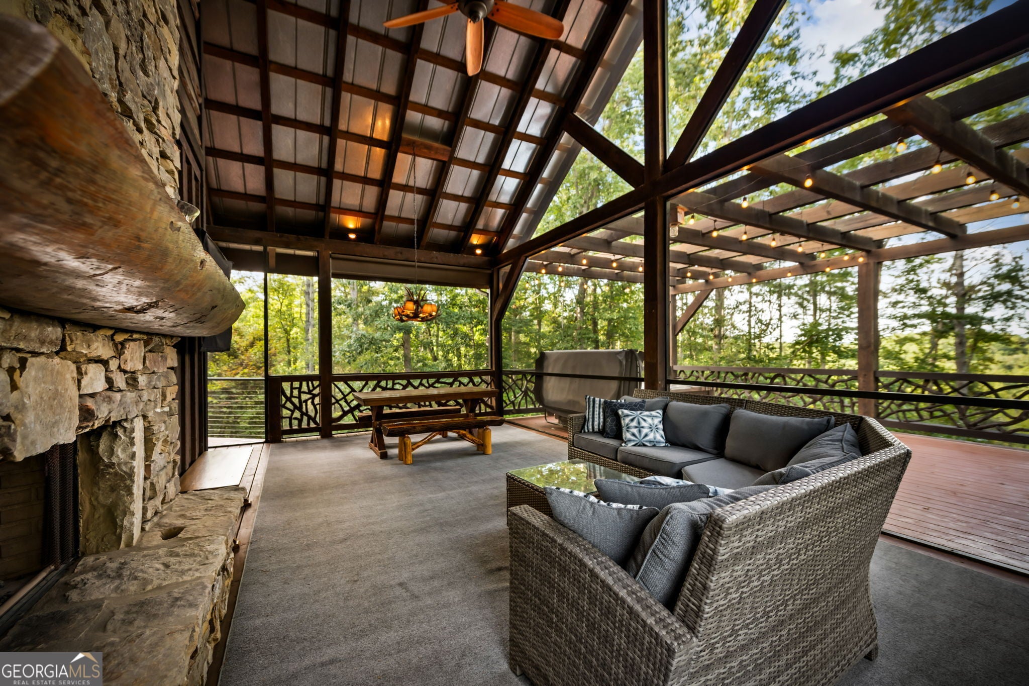 Indulge in this exquisite six-acre mountain estate where privacy, natural beauty, and refined luxury converge. Surrounded by towering trees and sweeping mountain vistas, this turn-key retreat offers tranquility and grandeur at every turn. The spacious residence features four bedrooms and three full baths, thoughtfully designed to blend sophistication with comfort. The main level boasts two primary suites with spa-like en suite baths. One offers walls of windows framing breathtaking views, a walk-in closet, dual vanities, and a custom rock shower with a cascading waterfall. The other showcases a cozy linear fireplace and upscale finishes, ideal for relaxation or hosting. At the heart of the home, the gourmet kitchen is outfitted with Viking appliances, farmhouse sink, custom wood cabinetry, stone accents, and a large island perfect for gatherings. A formal dining area sets the stage for intimate dinners and holiday celebrations. Throughout, rustic charm meets modern elegance-barn wood beams, artisanal accent walls, and rock fireplaces are paired with oversized windows that fill the home with light and mountain panoramas. Outdoor living is just as spectacular. An expansive wrap-around deck captures sunsets and breezes, while the screened porch with fireplace and shaded pergola with hot tub invite year-round enjoyment. The lower level is an entertainer's dream with a full wet bar, recreation room, and two guest suites with a custom rock bath. A sauna, fire pit, and sparkling pool elevate the retreat. Above the two-car garage, a versatile fifth bedroom with private bath offers additional space for guests, office, or studio. Just minutes from Downtown Blue Ridge, with its boutique shopping, fine dining, and outdoor adventures, this estate embodies the best of mountain living-timeless elegance surrounded by unmatched natural splendor.
