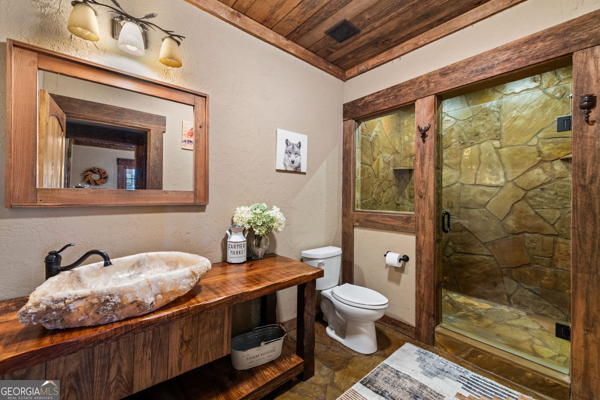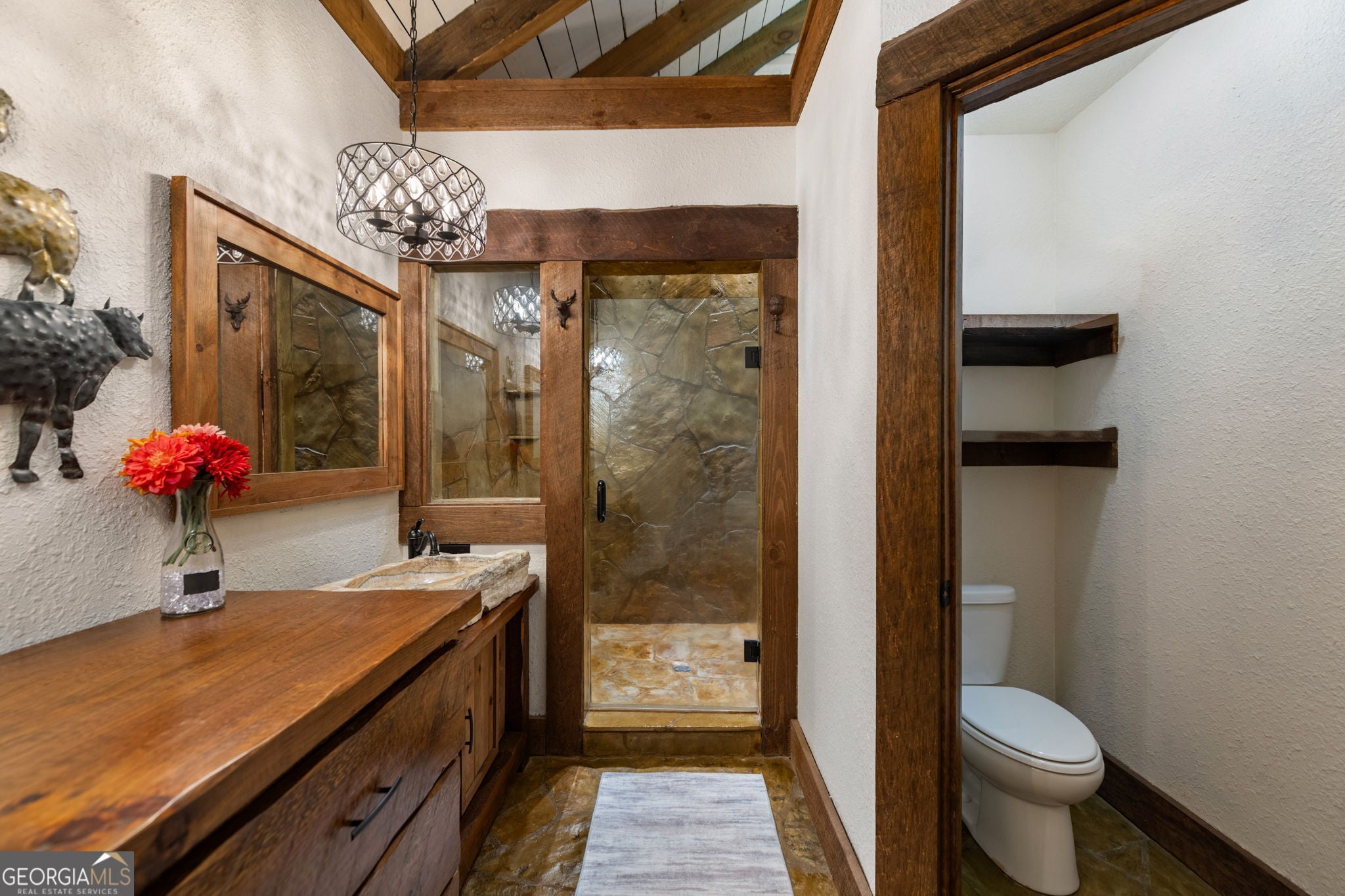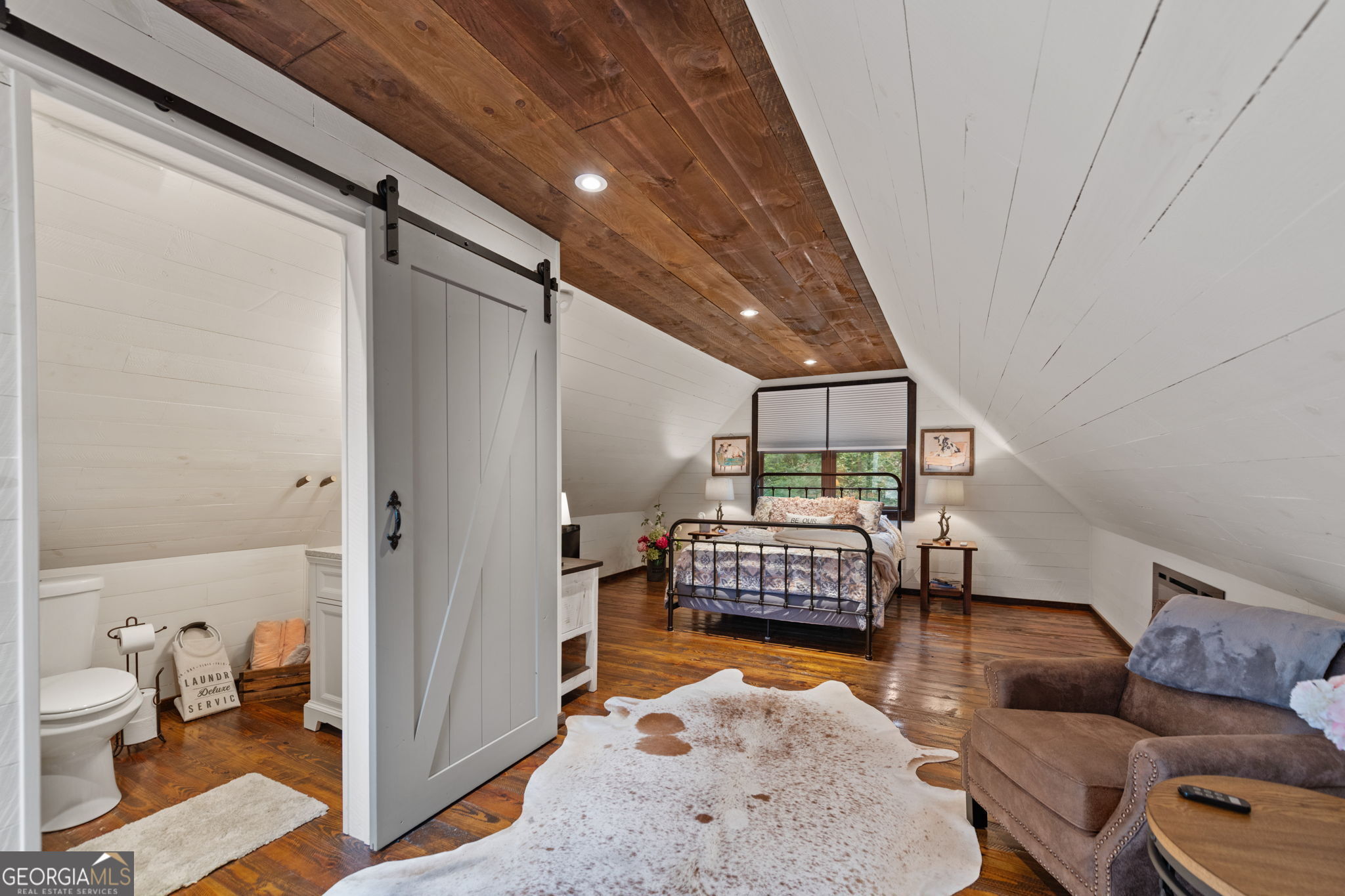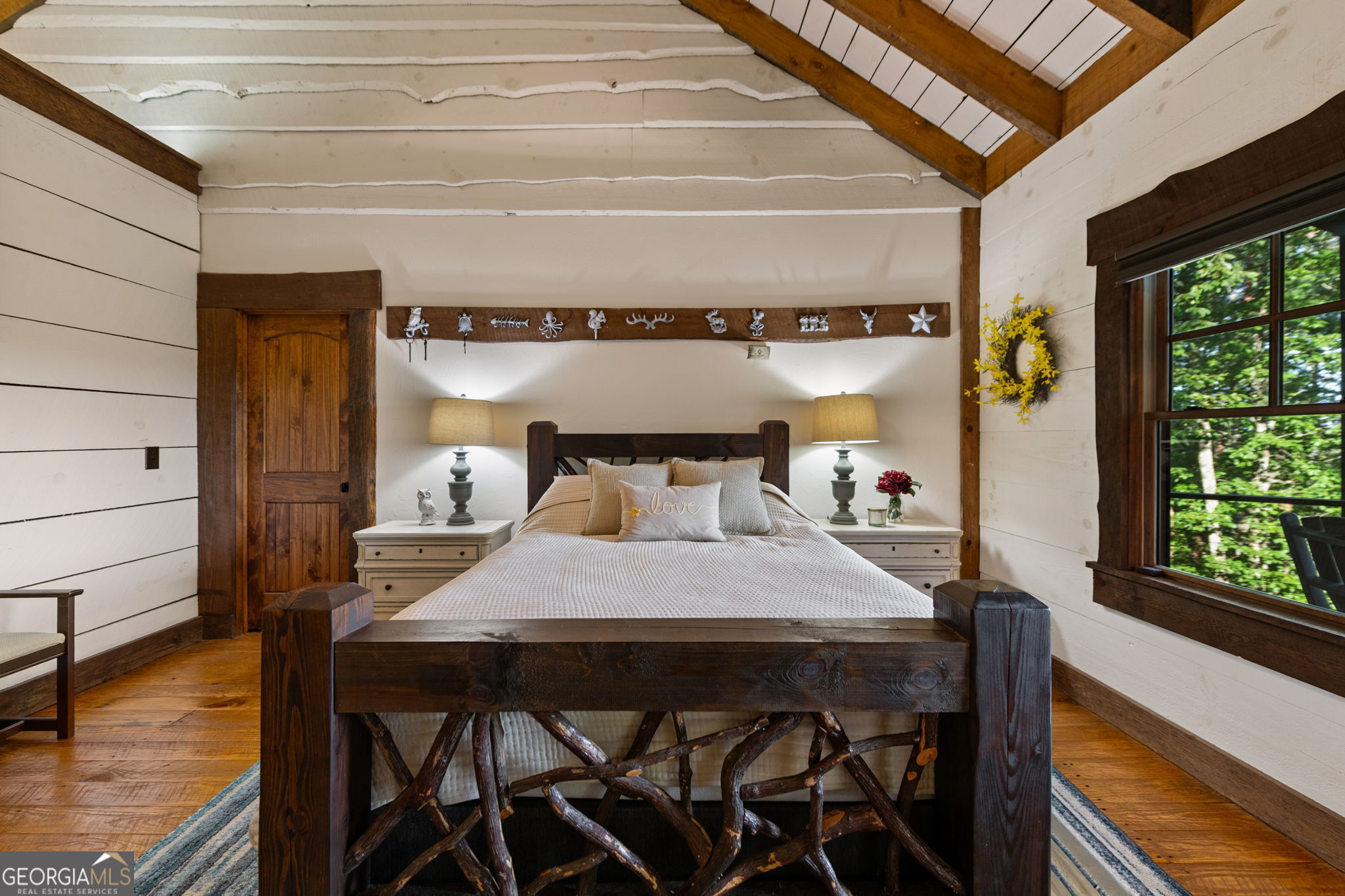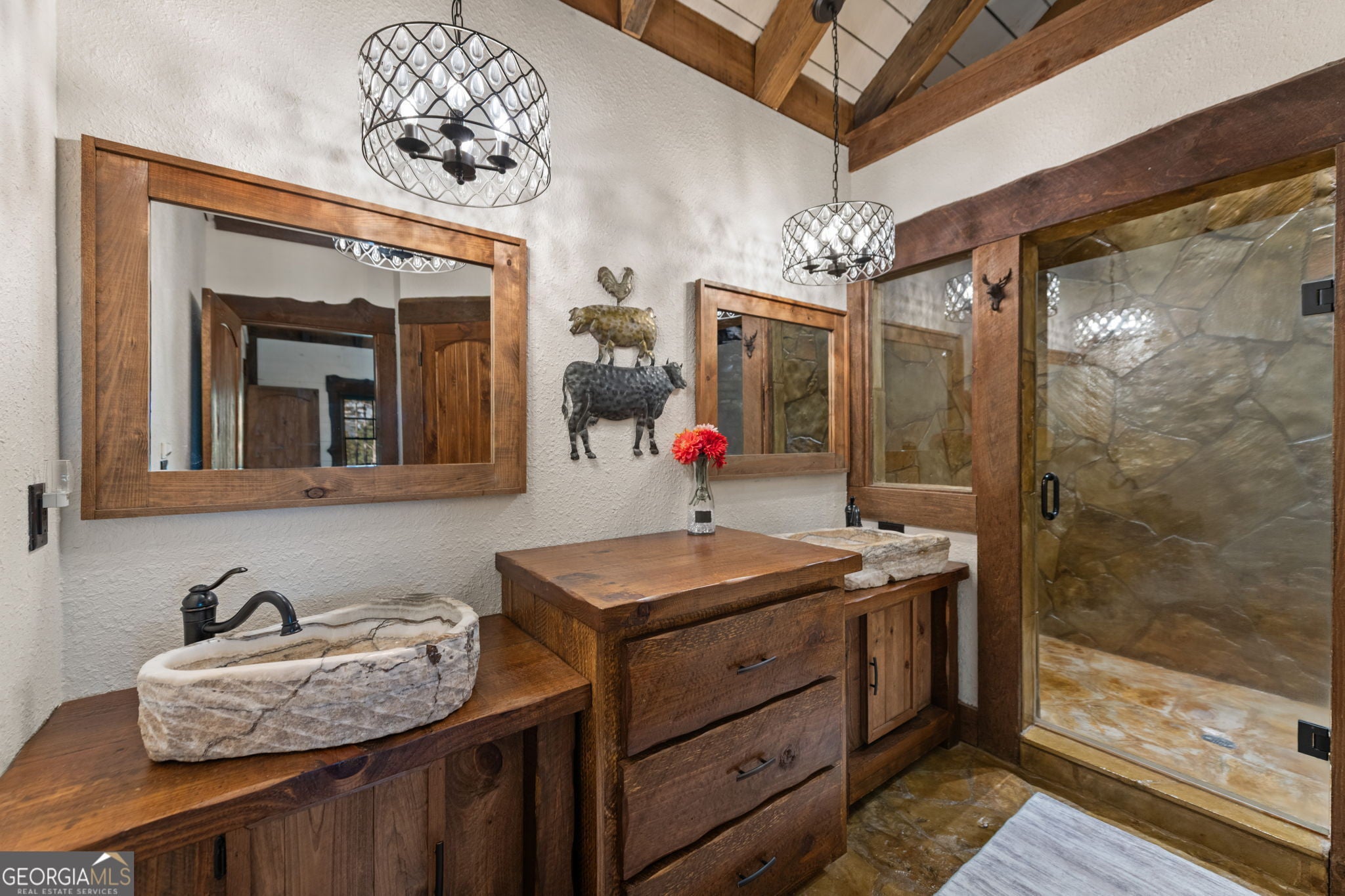 Indulge in this exquisite six-acre mountain estate where privacy, natural beauty, and refined luxury converge. Surrounded by towering trees and sweeping mountain vistas, this turn-key retreat offers tranquility and grandeur at every turn. The spacious residence features four bedrooms and three full baths, thoughtfully designed to blend sophistication with comfort. The main level boasts two primary suites with spa-like en suite baths. One offers walls of windows framing breathtaking views, a walk-in closet, dual vanities, and a custom rock shower with a cascading waterfall. The other showcases a cozy linear fireplace and upscale finishes, ideal for relaxation or hosting. At the heart of the home, the gourmet kitchen is outfitted with Viking appliances, farmhouse sink, custom wood cabinetry, stone accents, and a large island perfect for gatherings. A formal dining area sets the stage for intimate dinners and holiday celebrations. Throughout, rustic charm meets modern elegance-barn wood beams, artisanal accent walls, and rock fireplaces are paired with oversized windows that fill the home with light and mountain panoramas. Outdoor living is just as spectacular. An expansive wrap-around deck captures sunsets and breezes, while the screened porch with fireplace and shaded pergola with hot tub invite year-round enjoyment. The lower level is an entertainer's dream with a full wet bar, recreation room, and two guest suites with a custom rock bath. A sauna, fire pit, and sparkling pool elevate the retreat. Above the two-car garage, a versatile fifth bedroom with private bath offers additional space for guests, office, or studio. Just minutes from Downtown Blue Ridge, with its boutique shopping, fine dining, and outdoor adventures, this estate embodies the best of mountain living-timeless elegance surrounded by unmatched natural splendor.