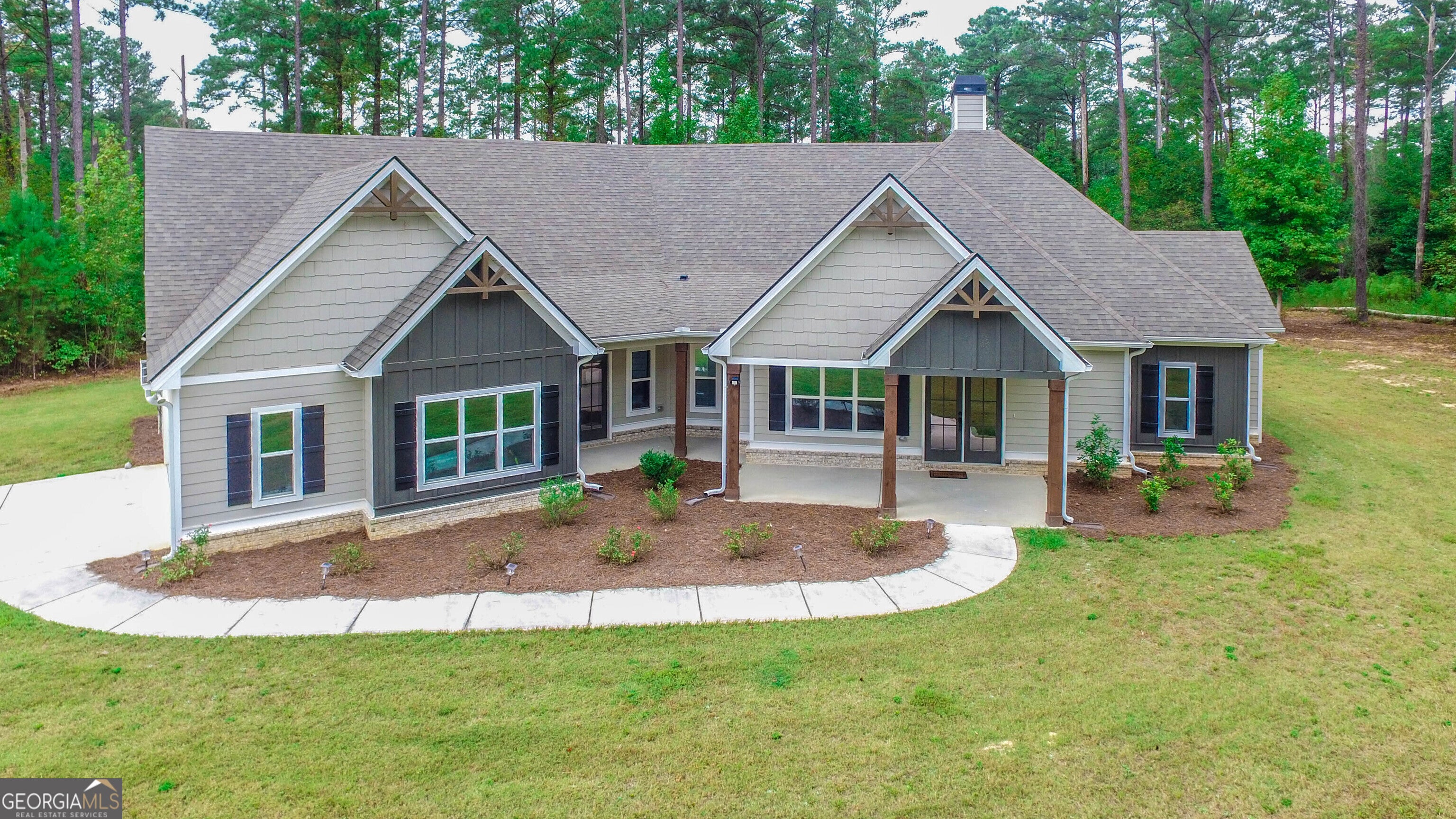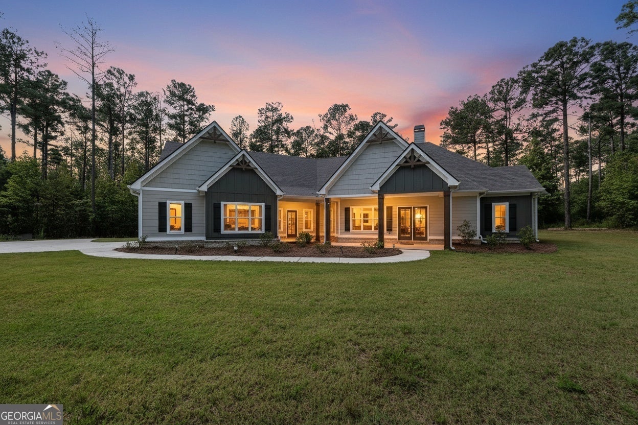 Experience refined simplicity at 164 Rowe Rd in Senoia, a Trademark Quality Homes Magnolia plan set on six acres of wooded privacy-approximately a quarter-mile off the road. Designed as a predominantly single-level ranch with an upstairs private bonus suite, the approach is quiet and secluded, with tall trees framing the home and creating an everyday retreat. Inside, an open layout draws the eye from the great room to dining and into a gourmet kitchen designed for both workflow and gathering: an oversized island, stainless appliances, cooktop, double oven, gleaming granite, a generous walk-in pantry, and abundant cabinetry. Light is a signature feature here. An abundance of windows along the front and back of the home invites natural light from morning to evening, giving interiors a bright, airy feel and an easy connection to the landscape. The main-level private suite is calm and well finished, with a tray ceiling, upgraded wood flooring and a spa-styled bath featuring double vanities, a large shower, soaking tub, water closet and dual spacious walk-in closets. Two additional main-level bedrooms share a well-appointed Jack-and-Jill bath with separate vanities. Upstairs, a separate private suite with full bath is ideal for long visits, studio work, or a quiet office. Outdoor living is a highlight. Twin covered rear porches extend daily life into the woods. One is a dedicated "Game Day" porch-well covered with a fireplace and TV niche-perfect for the grilling at dusk you'll love, and for creating a comfortable fair-weather living room that takes full advantage of the setting's privacy. The second porch offers a quieter spot for coffee, reading, or simply listening to the trees. Performance upgrades-spray-foam insulation and high-efficiency Low-E windows-support comfort and thoughtful energy use. The location is both private and practical: a popular pocket of Senoia known for its rural feel and established streetscapes, with easy access to Highway 85 and Highway 16, and about seven minutes to Publix or Downtown Senoia. Lightly used by a part-time owner, the residence presents with a remarkably fresh, near-new feel. With 3,341 sq ft of curated space on a rare wooded tract, this home balances everyday function with understated elegance and true seclusion. Don't miss the opportunity to own a newer residence on private, wooded acreage in Senoia's timeless rural landscape.