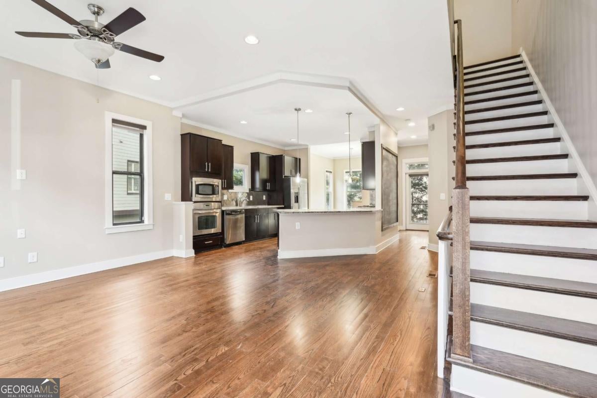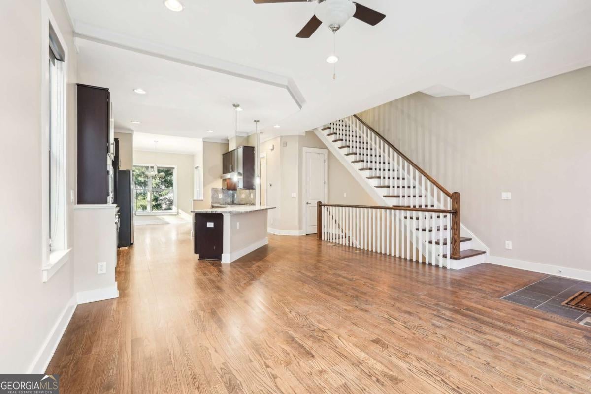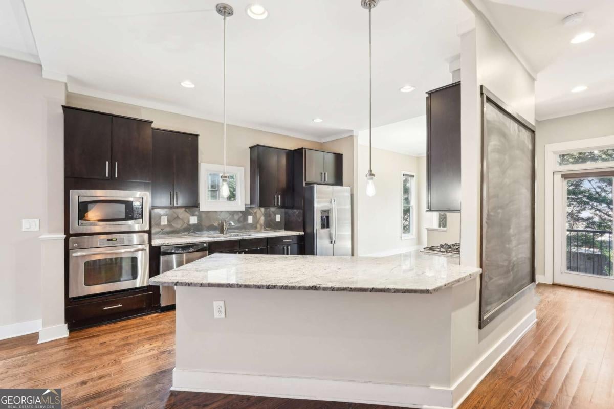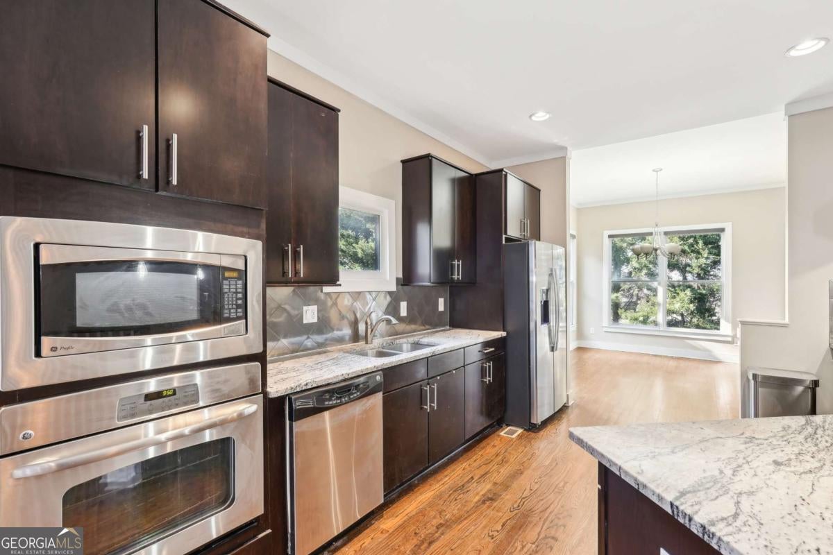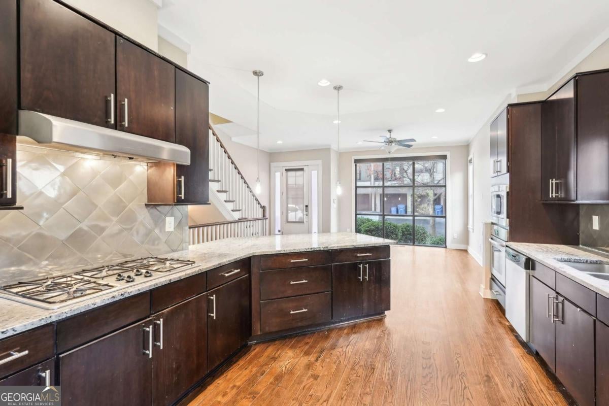 Impress everyone you know in this *corner end unit* brick and stone, four-story West Midtown townhome in a gated community boasting a jaw-dropping 750+ square foot rooftop patio with expansive skyline views of Buckhead and Vinings. The guest parking situation for this unit is supreme with plenty of parking spaces right at the front door of this unit! New carpet, and new LVP in basement! Freshly painted trim! Step inside and immediately feel the difference as natural sunlight pours in through an abundance of windows in every room, including two nine-panel picture window walls. From the moment you enter, the light-filled living room transitions seamlessly into the modern kitchen, where sleek hardwood floors set the stage for contemporary luxury. Whether you're hosting cocktails at sunset or curling up under the stars, the rooftop retreat offers an outdoor experience rarely found in townhome living. Venture further to discover a layout designed for versatility: each bedroom features its own ensuite bath, while the finished daylight basement can serve as a private guest suite, roommate space, or your dream home office. Two additional balconies-one off the main living level and another attached to the secondary bedroom-provide perfect spots for morning coffee or a quiet read. High ceilings, modern fixtures, and included appliances (washer/dryer) make daily living as convenient as it is stylish. Best of all, leasing is allowed, giving professionals both the freedom to move and potential for income generation. With low $200/month HOA fees, a secure two-car attached garage, and a gated community, you'll enjoy the ideal blend of convenience and luxury. Ready to experience the best of booming West Midtown? In minutes, walk over to Topgolf or explore the massive Westside Quarry Park, which is newer and larger than Piedmont Park. Plus, you're surrounded by some of Atlanta's top dining and nightlife. This is the address you've been waiting for, where corner-unit privacy meets show-stopping rooftop views in Atlanta's trendiest neighborhood.