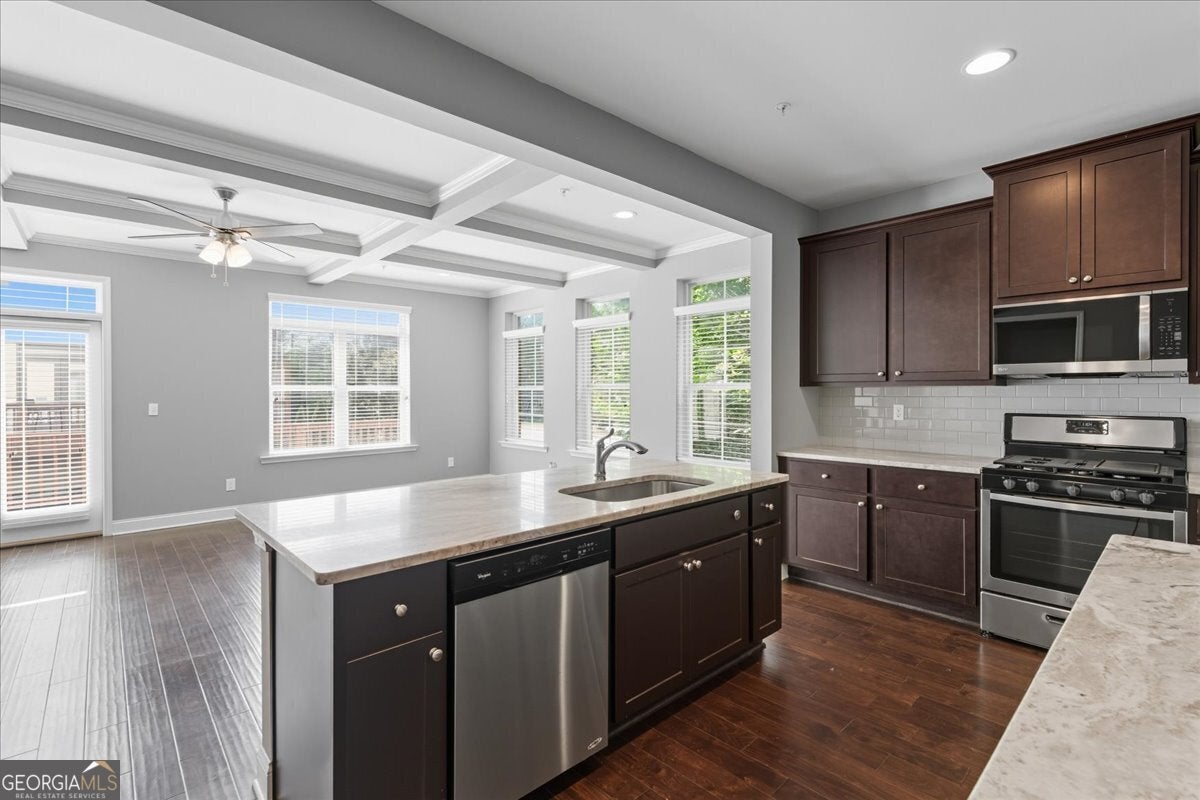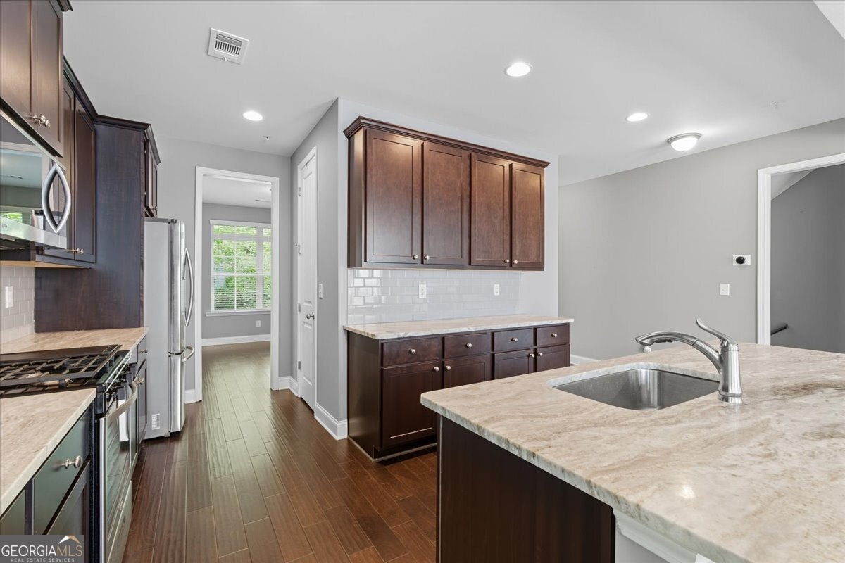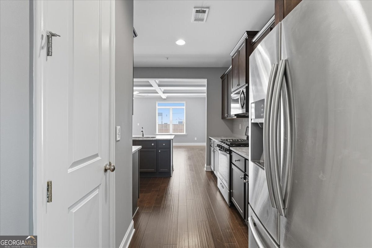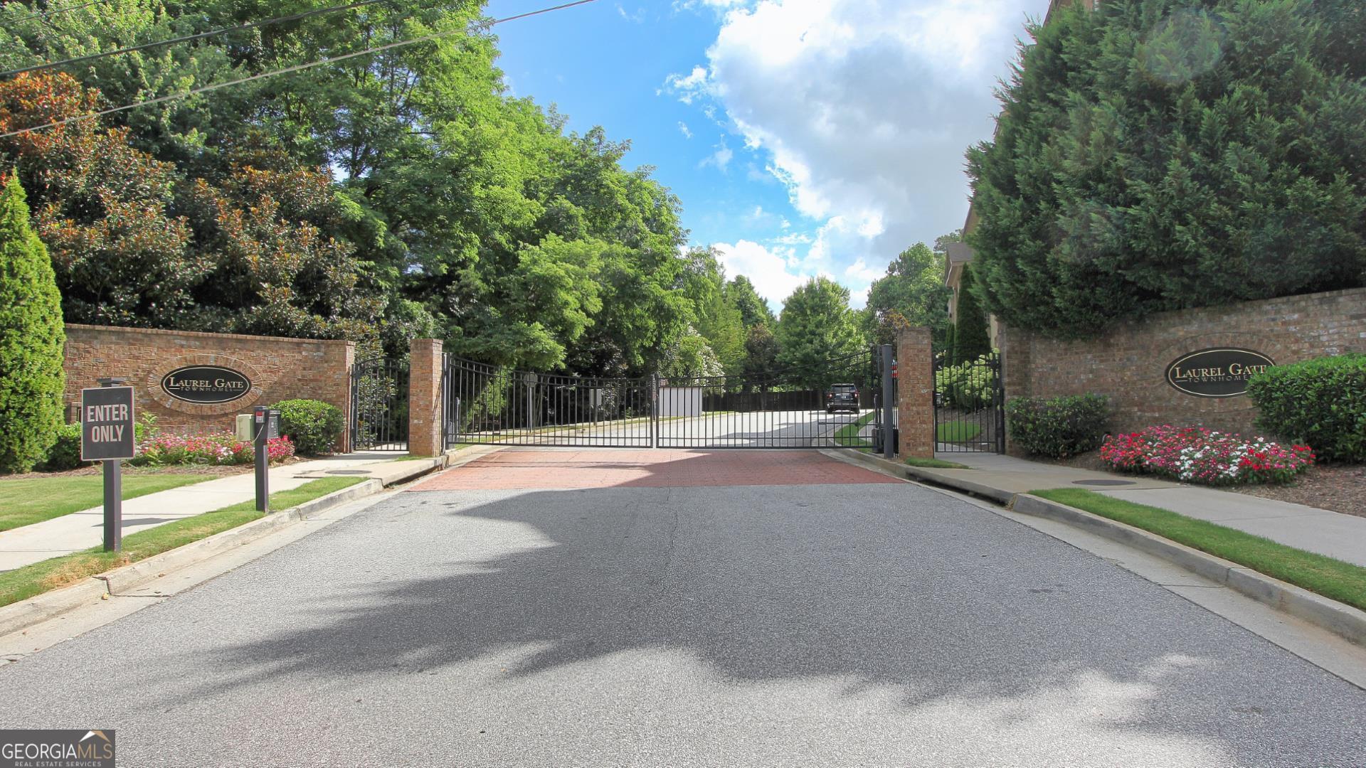Move-in-ready! Laurel Gate Townhomes, end unit, gated community, 4 bedrooms, 3 full baths, half bath, 2 car garage, front porch, and back deck. Full bedroom and bath on the lower level. Located right off I-285, with private wooded areas. HOA is responsible for exterior of home. Upgrades: two-sided brick, hardwoods, coffered and tray ceilings, tankless water heater, custom built-in cabinets, stand-alone tub, walk-in shower, tile flooring, SS appliances, extended kitchen island, custom trim, nest thermostats and more! Convenient location minutes to I-285/I-75, Smyrna Market Village, Vinings Jubilee, Restaurants, Shopping, Silver Comet Trail, and The Battery/Truist Park. Walkable to Tolleson Park with Swimming Pool, Tennis Courts, Playground, Ball field, and Walking Trails. Award Winning King Springs Elementary School in the Cambell HS district. Two community gates: one is entry only, and the other is exit only. Rate buydown information is available, request from agent.
