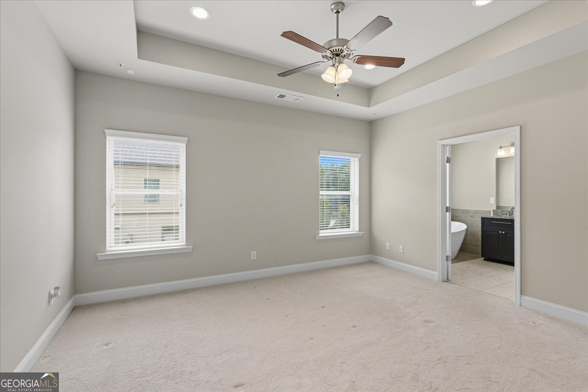 - Interior FeaturesBookcases, Double Vanity, High Ceilings, Pulldown Attic Stairs, Separate Shower, Soaking Tub, Tray Ceiling(s), Walk-In Closet(s)