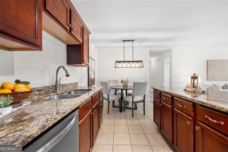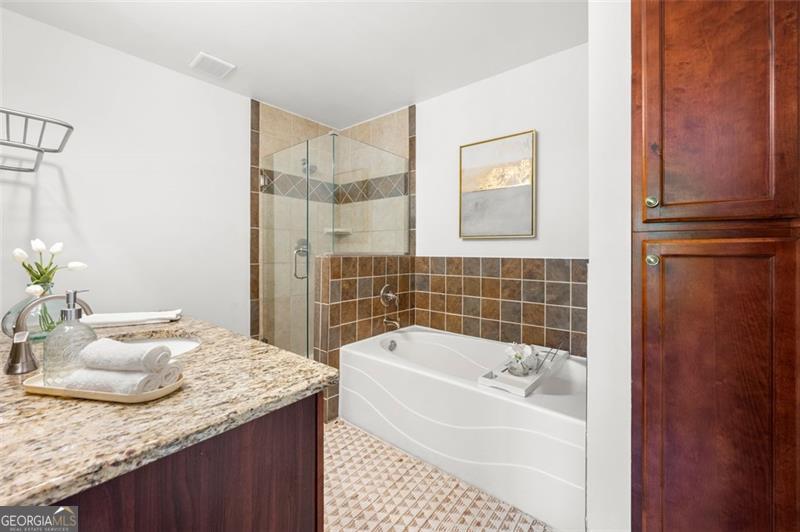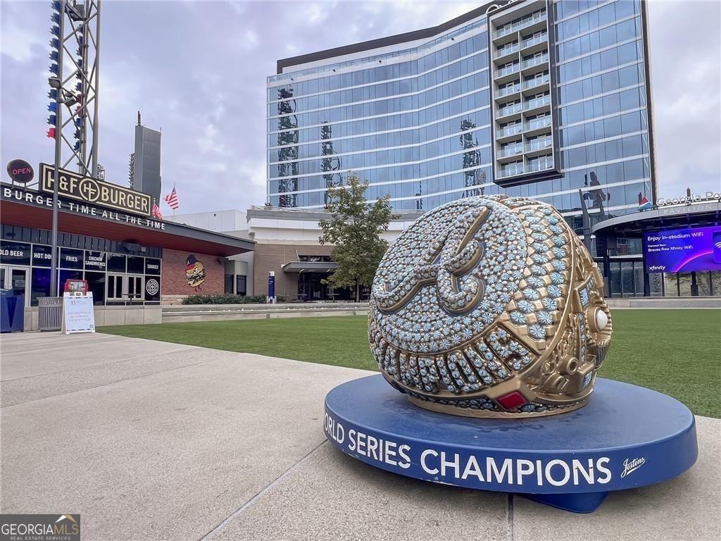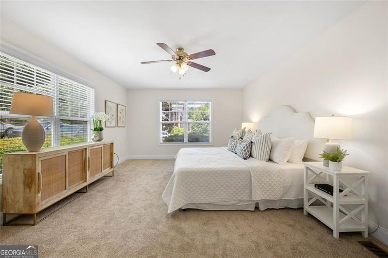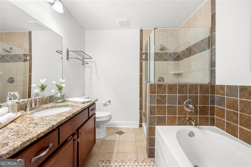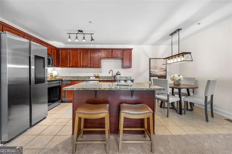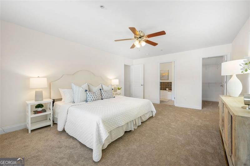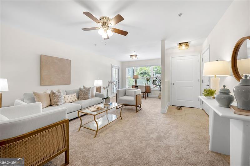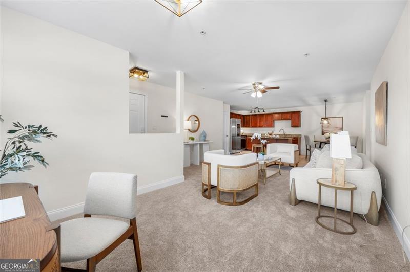 Welcome home to this ground floor, 2 bedroom, 2 bathroom condo in the heart of Smyrna. With fresh paint and carpet throughout and updated kitchen and baths, this home is fully move-in ready. The living space is open-concept with views to the dining area and kitchen. The kitchen is both functional and inviting, offering granite countertops, an island with barstool seating, a pantry, and all stainless steel appliances included. Off of the living room is a spacious covered balcony - perfect for morning coffee or evening relaxation. The oversized primary suite features ample natural light, a walk-in closet, and a spa-like bath featuring a large vanity, soaking tub, and separate, frameless, tiled shower. Both bathrooms are finished with tile surround tubs and flooring and granite countertops. A full laundry room in the hallway can accommodate side-by-side washer and dryer for added convenience. Don't miss the community amenities including a pool, fitness center, and clubhouse. Located just a short walk from parks, playground and the restaurants and shops of Smyrna Market Village. Minutes from Truist Park, The Battery, and quick access to I-285 & I-75, this condo is perfectly positioned for both work and play. VA Loan Assumption with 5.25% interest rate available!