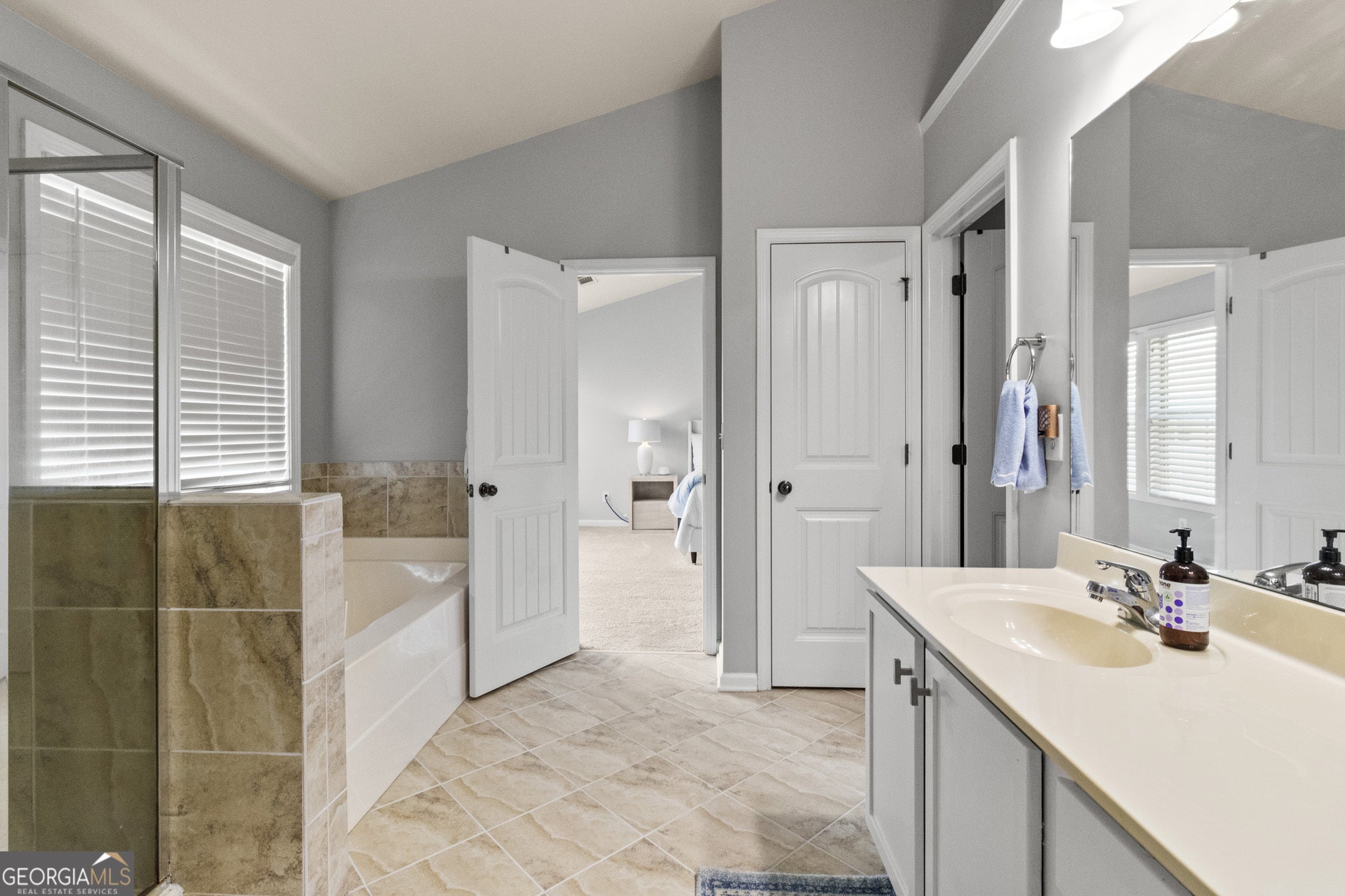 - Interior FeaturesDouble Vanity, High Ceilings, Pulldown Attic Stairs, Separate Shower, Soaking Tub, Tile Bath, Vaulted Ceiling(s), Walk-In Closet(s)