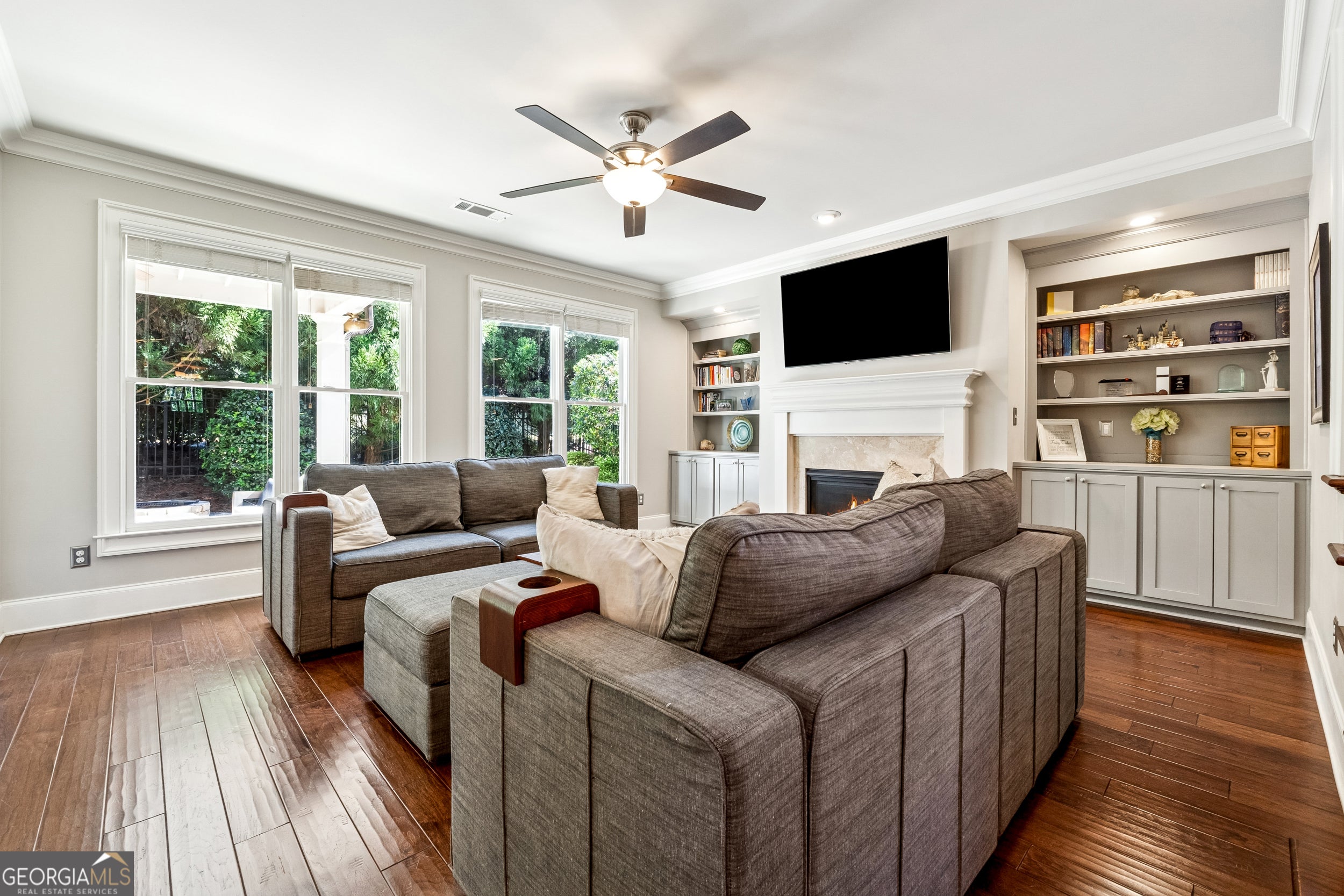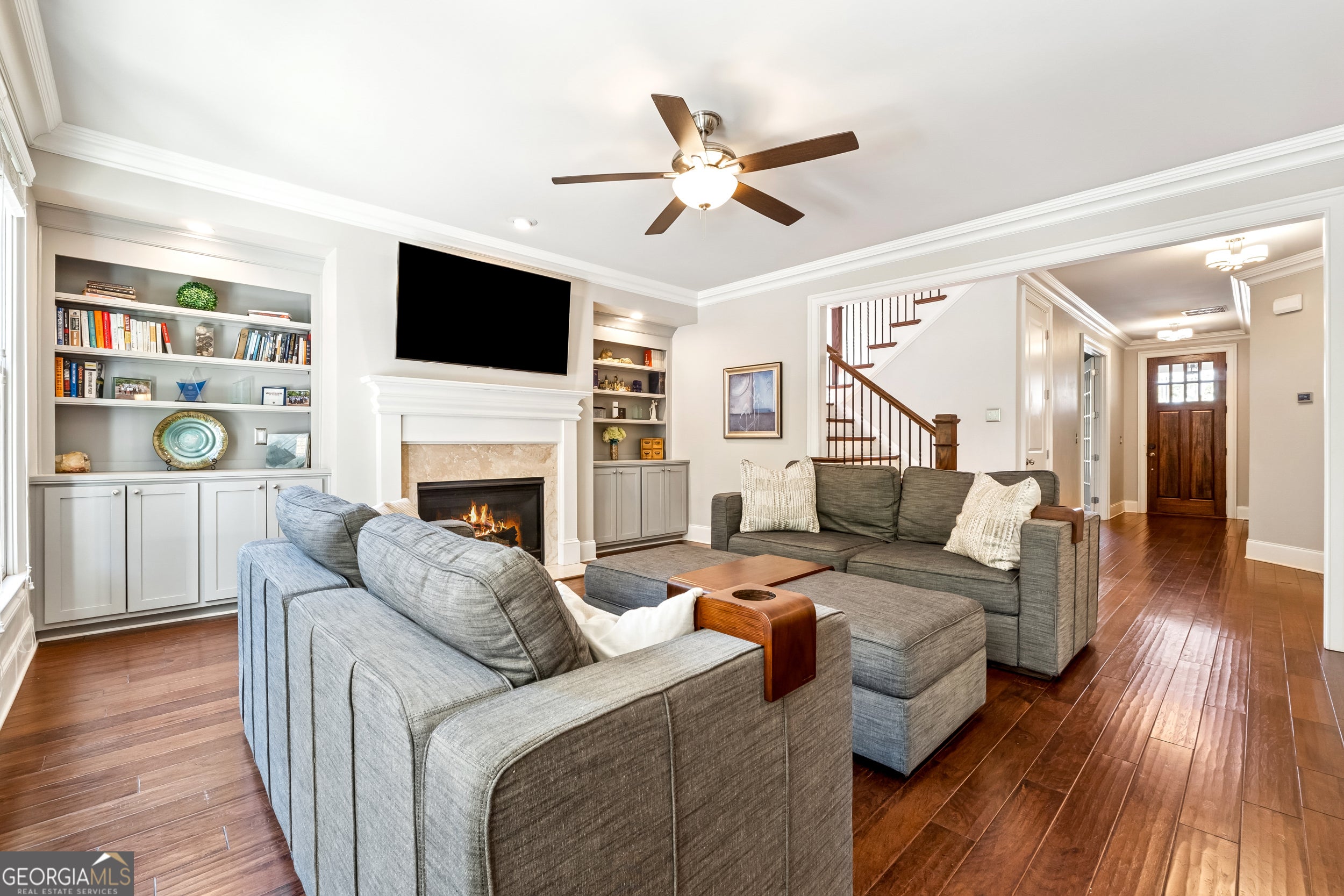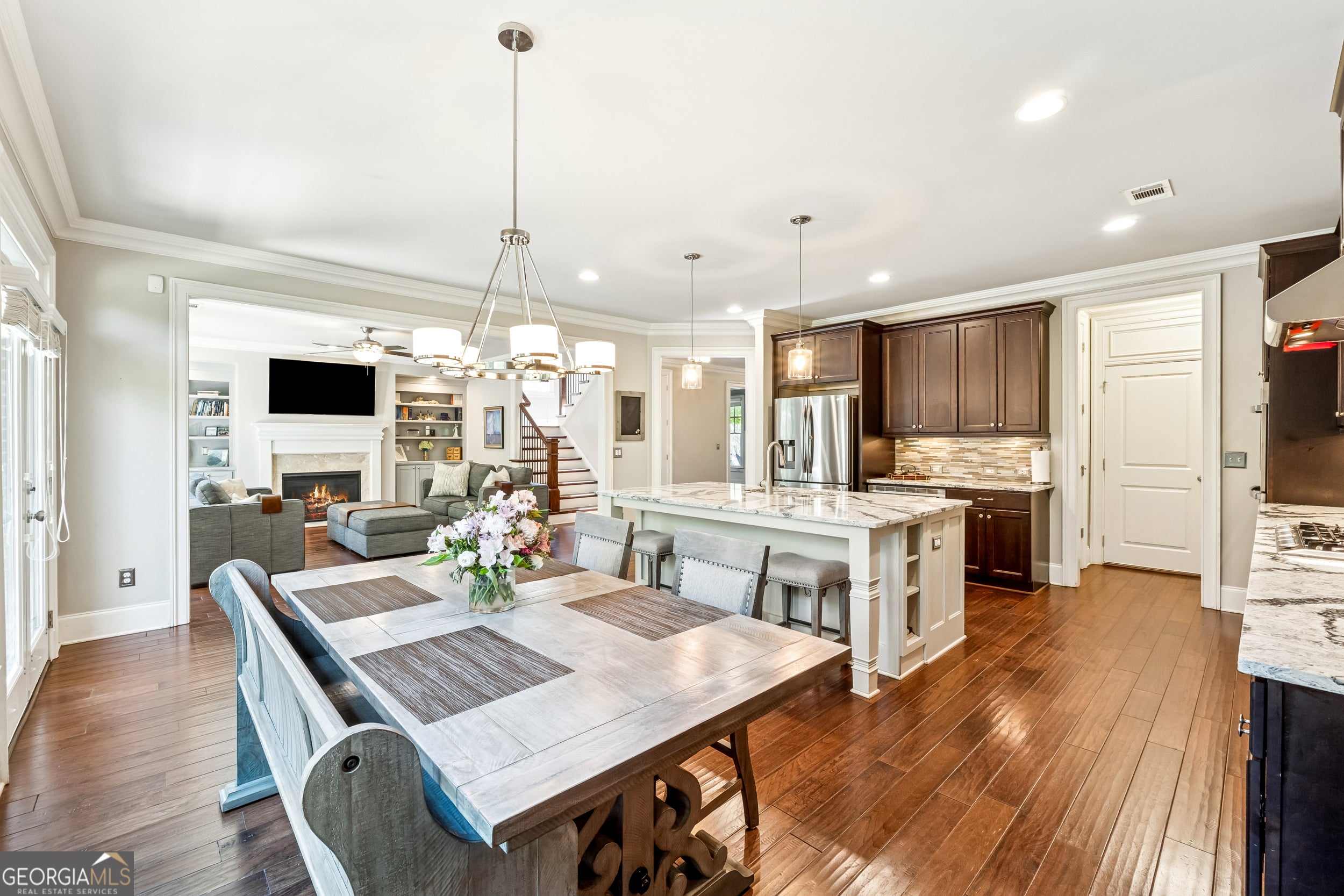 Welcome to this beautifully maintained former model home featuring a classic front porch and elegant foyer entry with hardwood floors throughout. The formal dining room showcases detailed molding and open concept perfect for hosting gatherings. You'll love the light-filled gourmet kitchen with Cambria countertops, high-end GE stainless steel appliances (including smart, double convection ovens), custom cabinetry, and a large island ideal for entertaining. The walk-in pantry with built-ins and a separate mudroom off the garage offer plenty of functional storage. Enjoy relaxing in the spacious family room, complete with custom built-ins and a warm, inviting layout. The secondary bedrooms are generously sized and feature ample closets and a custom Jack-and-Jill bath. The luxurious primary suite boasts a stylish feature wall, spa-inspired bathroom, and an oversized walk-in closet with custom organizers. Step outside to your private backyard retreat, featuring a covered patio, fire pit, and fenced yard-perfect for entertaining year-round. Nestled within a gated community, this home offers a neutral designer palette and move-in ready condition. You'll enjoy being just minutes from The Battery, Truist Park, Cumberland Mall, Smyrna Market Village, Vinings Jubilee, and within walking distance to Home Depot Headquarters. With quick access to I-75, I-285, and Hartsfield-Jackson Airport, convenience and connectivity are unmatched. This exquisite Smyrna home combines timeless craftsmanship with modern upgrades - truly better than new!